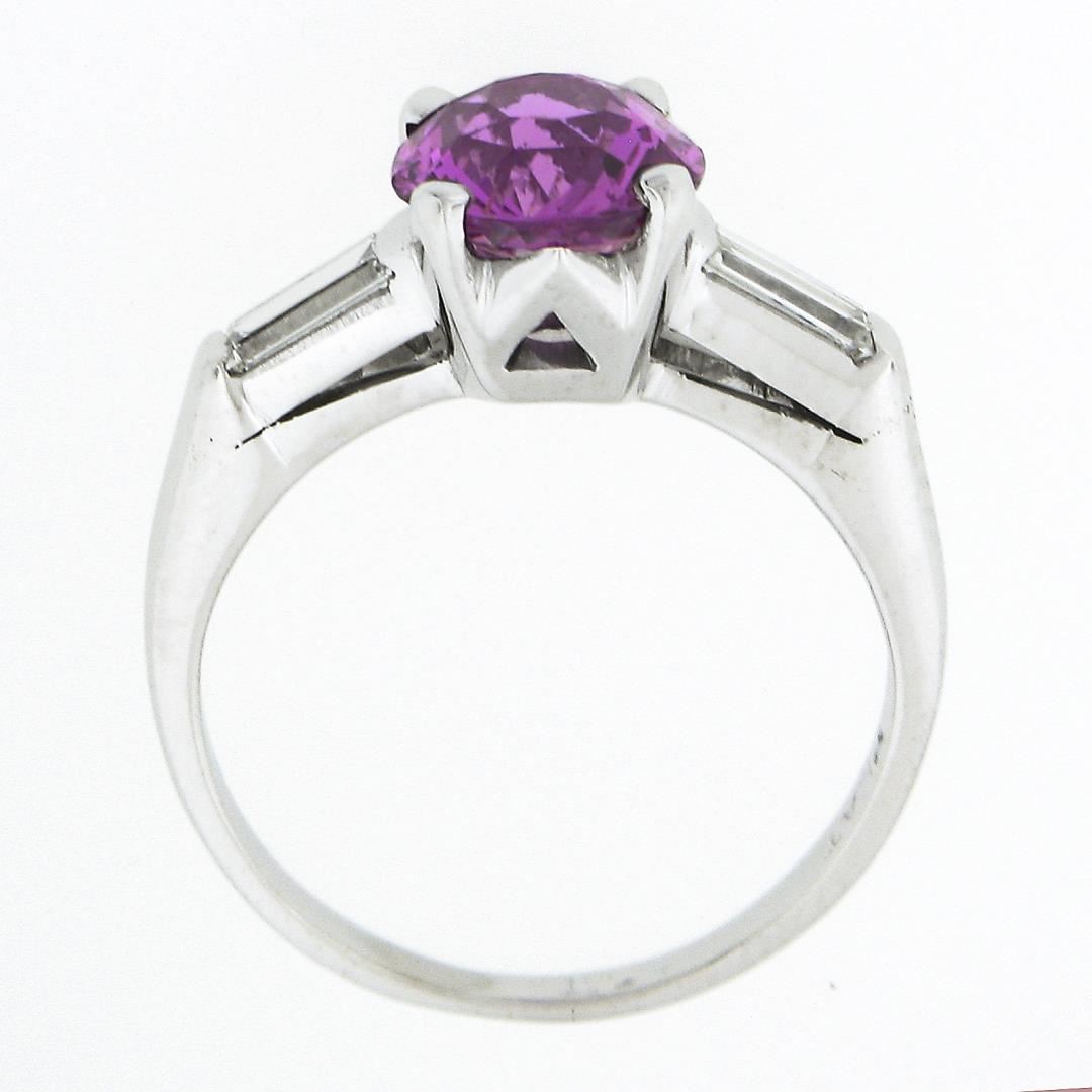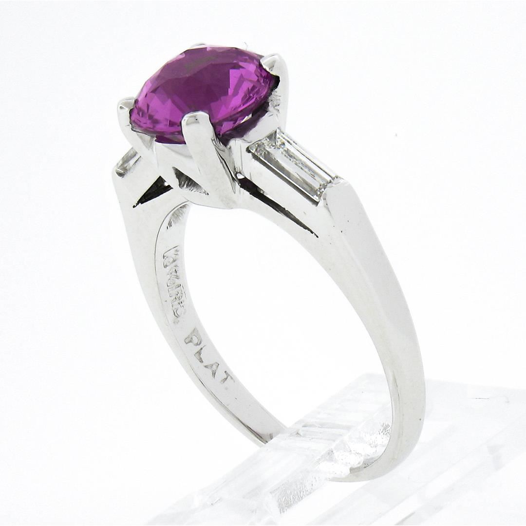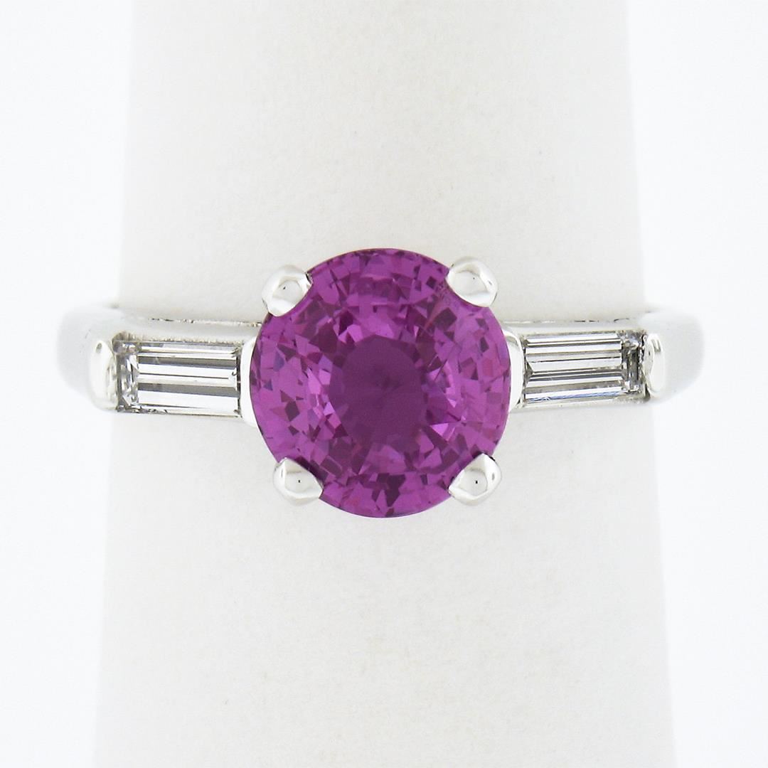 A vintage solid platinum ring, with a GIA graded round cut natural pink sapphire (2.01ct ), and 2 baguette cut natural diamonds (F/G - VS1/VS2 ; 0.50ctw). The ring is size 5.5, weighs a total of 5.01 grams, and measures 7.65mm wide. Comes with all original relevant certifications.