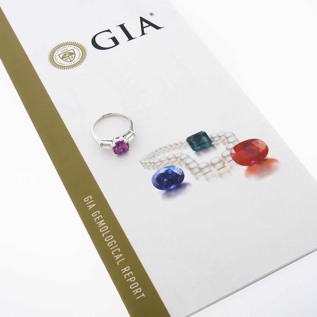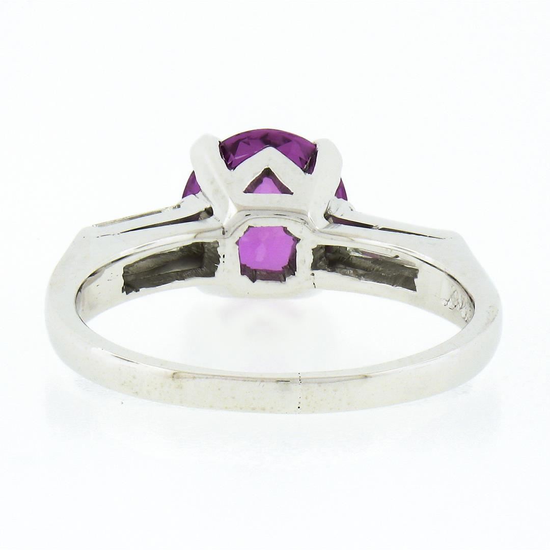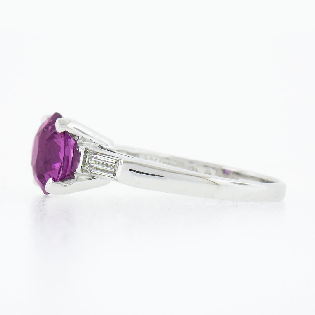 A vintage solid platinum ring, with a GIA graded round cut natural pink sapphire (2.01ct ), and 2 baguette cut natural diamonds (F/G - VS1/VS2 ; 0.50ctw). The ring is size 5.5, weighs a total of 5.01 grams, and measures 7.65mm wide. Comes with all original relevant certifications.