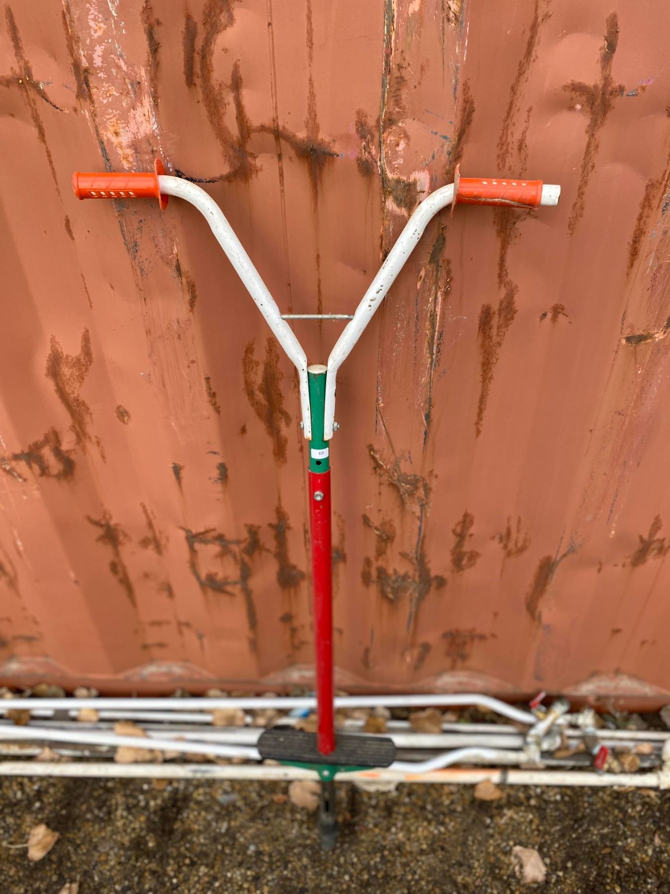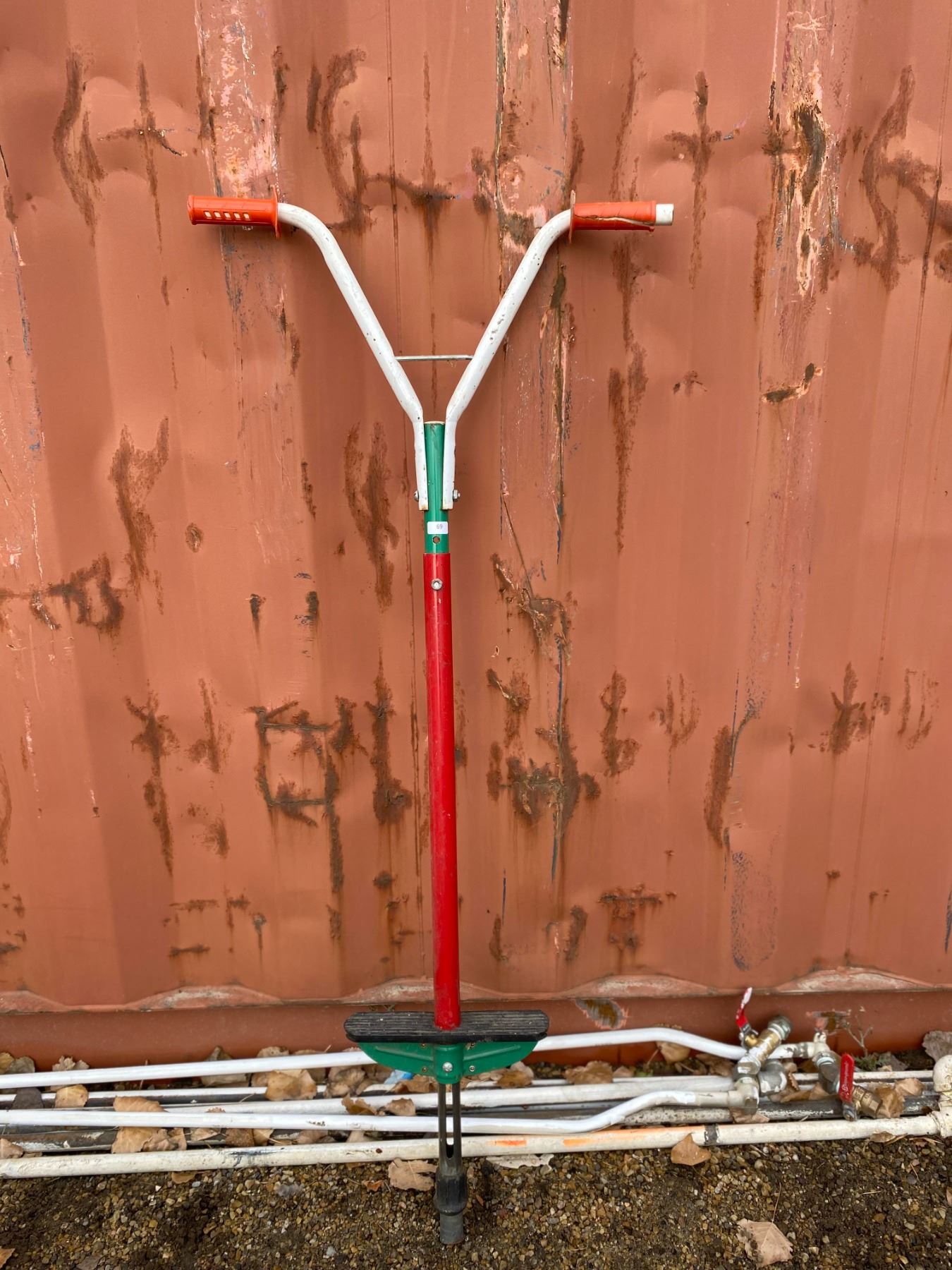 Classic retro pogo stick with red and white frame and original grips. Shows age wear and is ideal for display, garage decor, or nostalgic collecting.