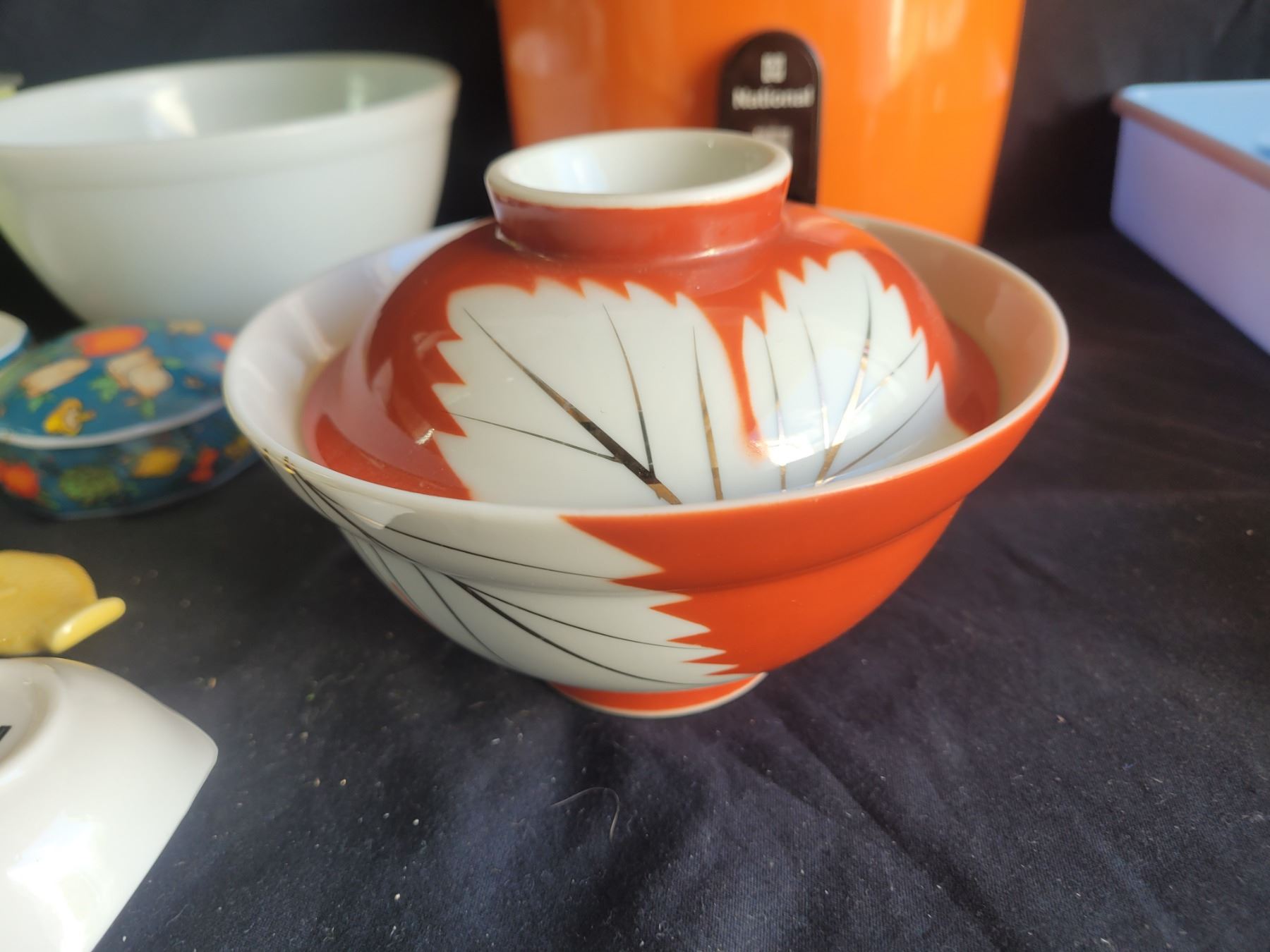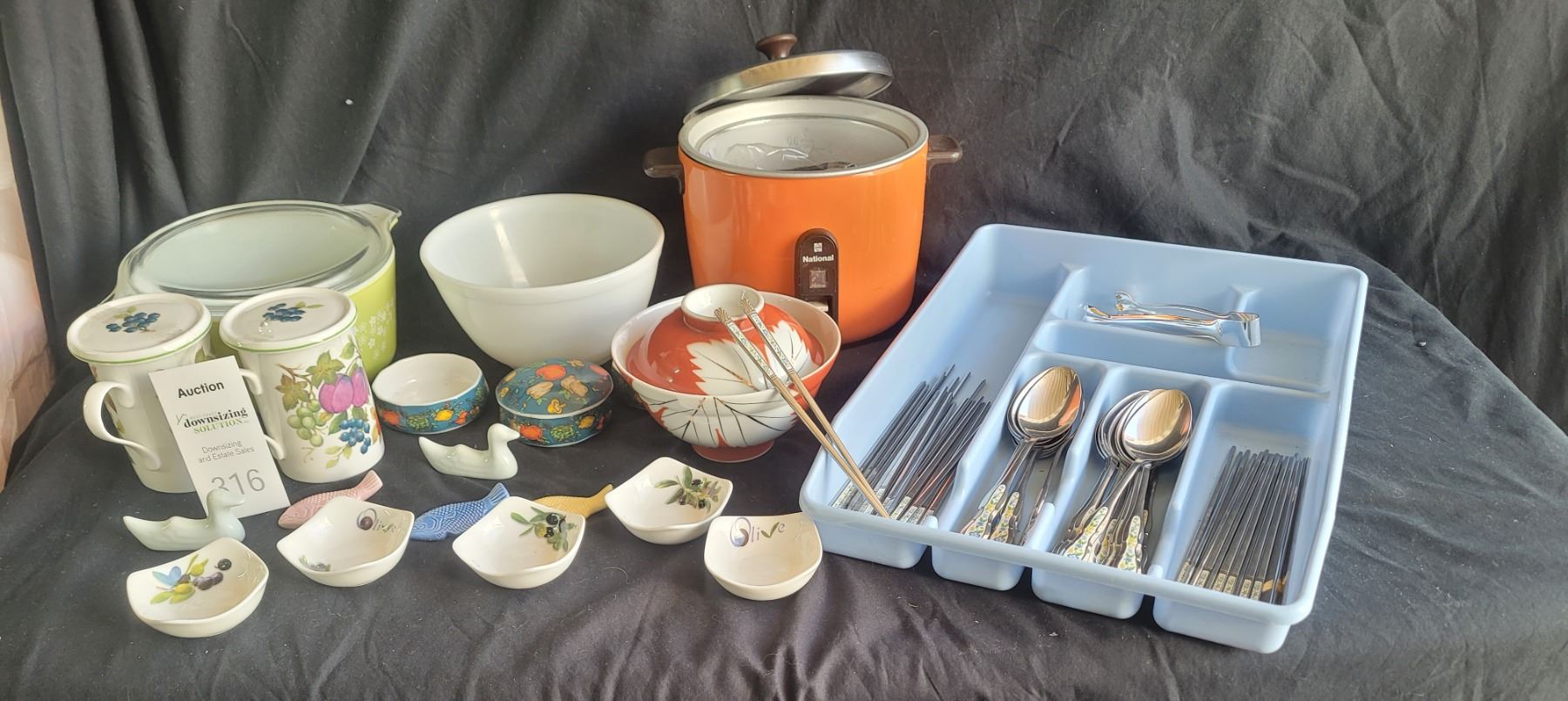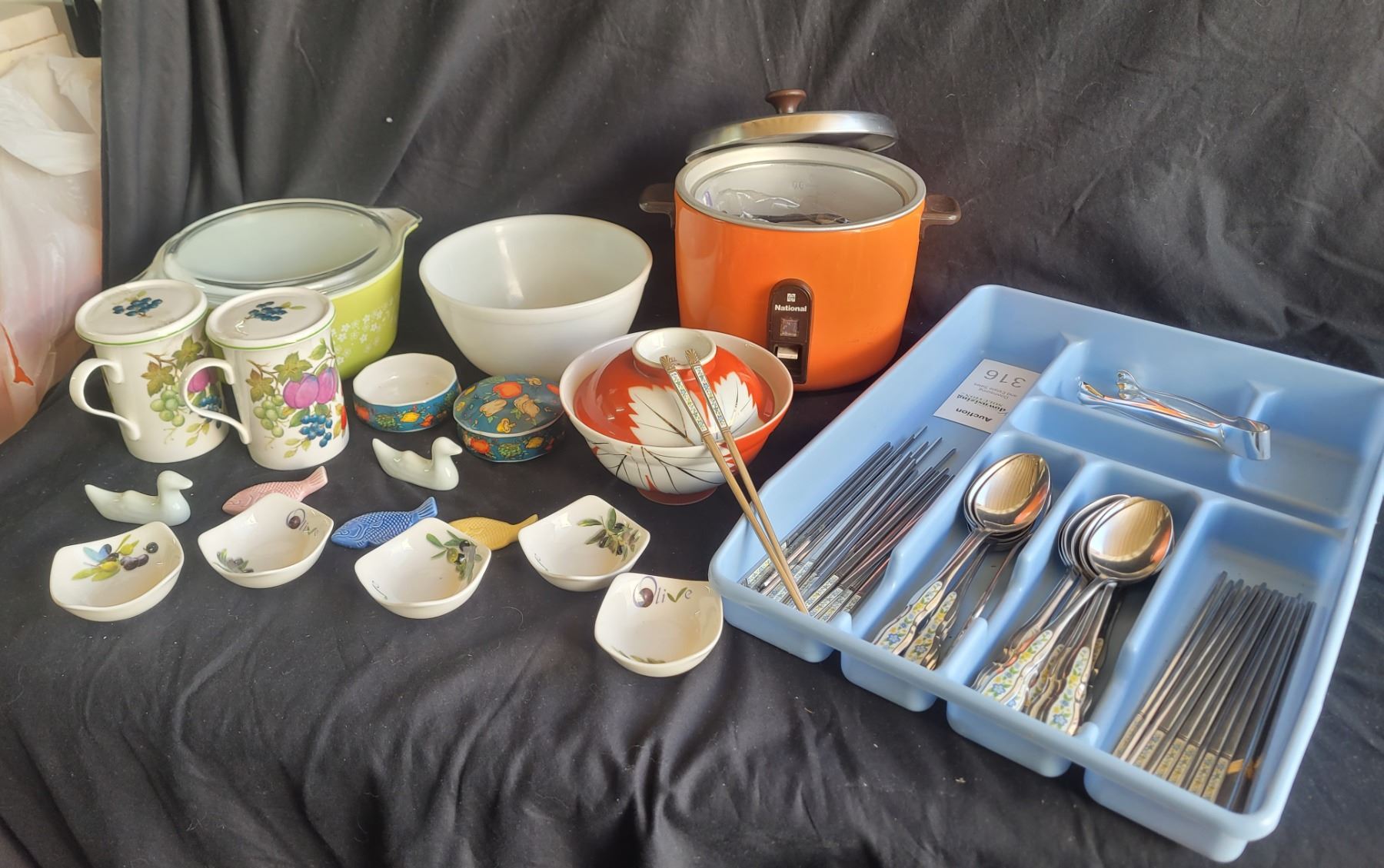Rice cooke, cutlery, vintage Pyrex bowl, Vinage Pyrex, lime green lidded casserole and more. Pickup at 9 am