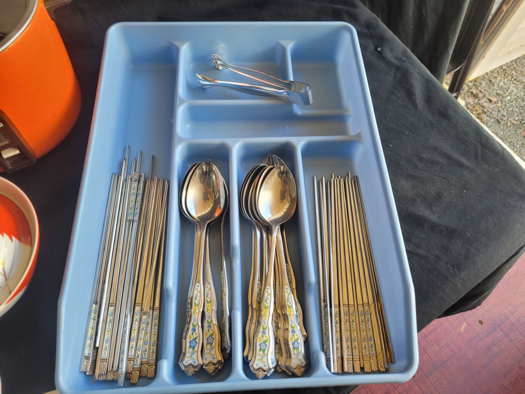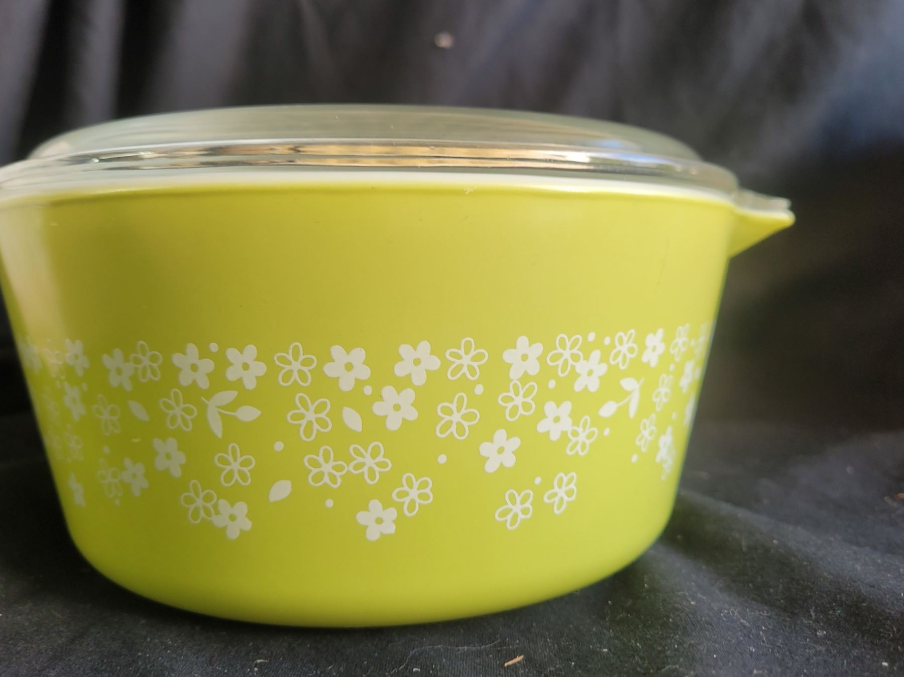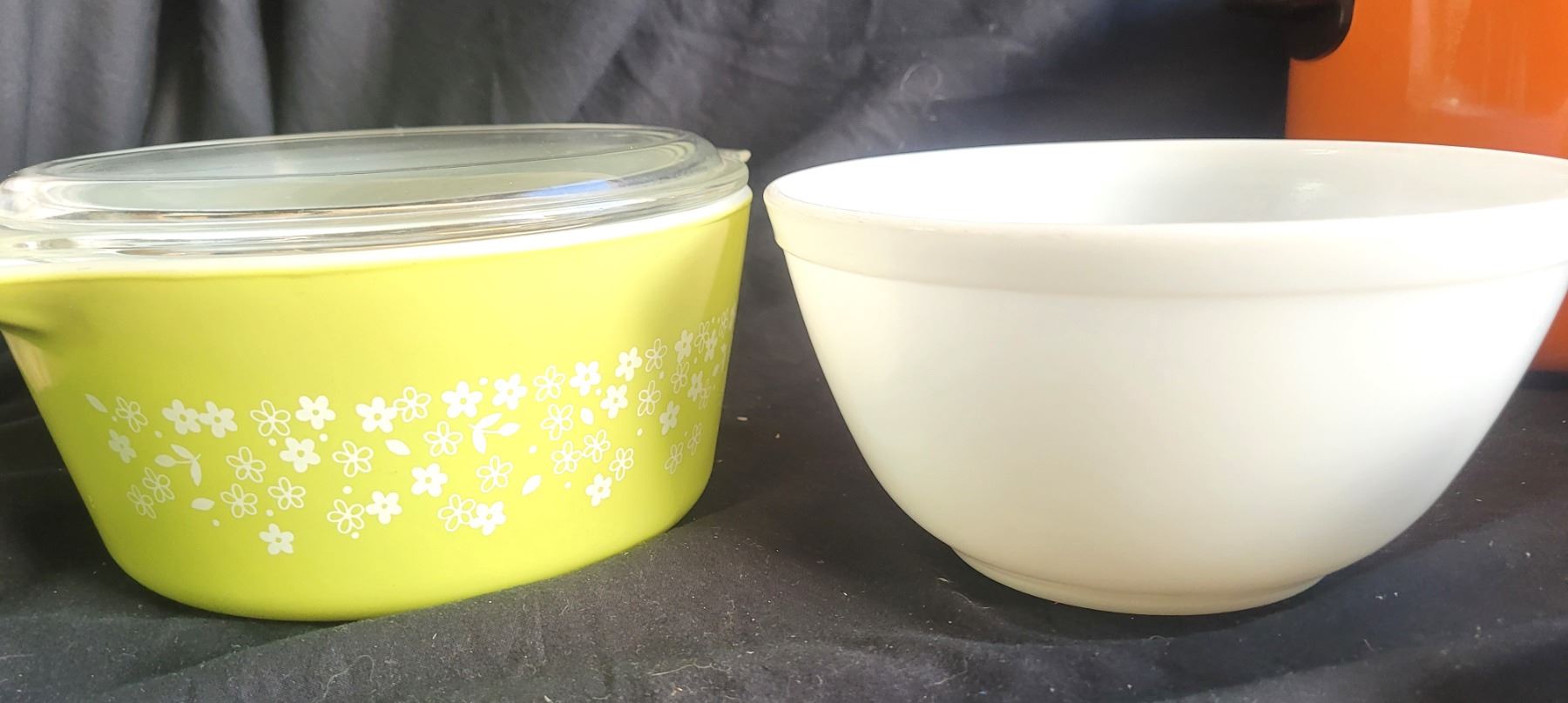 Rice cooke, cutlery, vintage Pyrex bowl, Vinage Pyrex, lime green lidded casserole and more. Pickup at 9 am