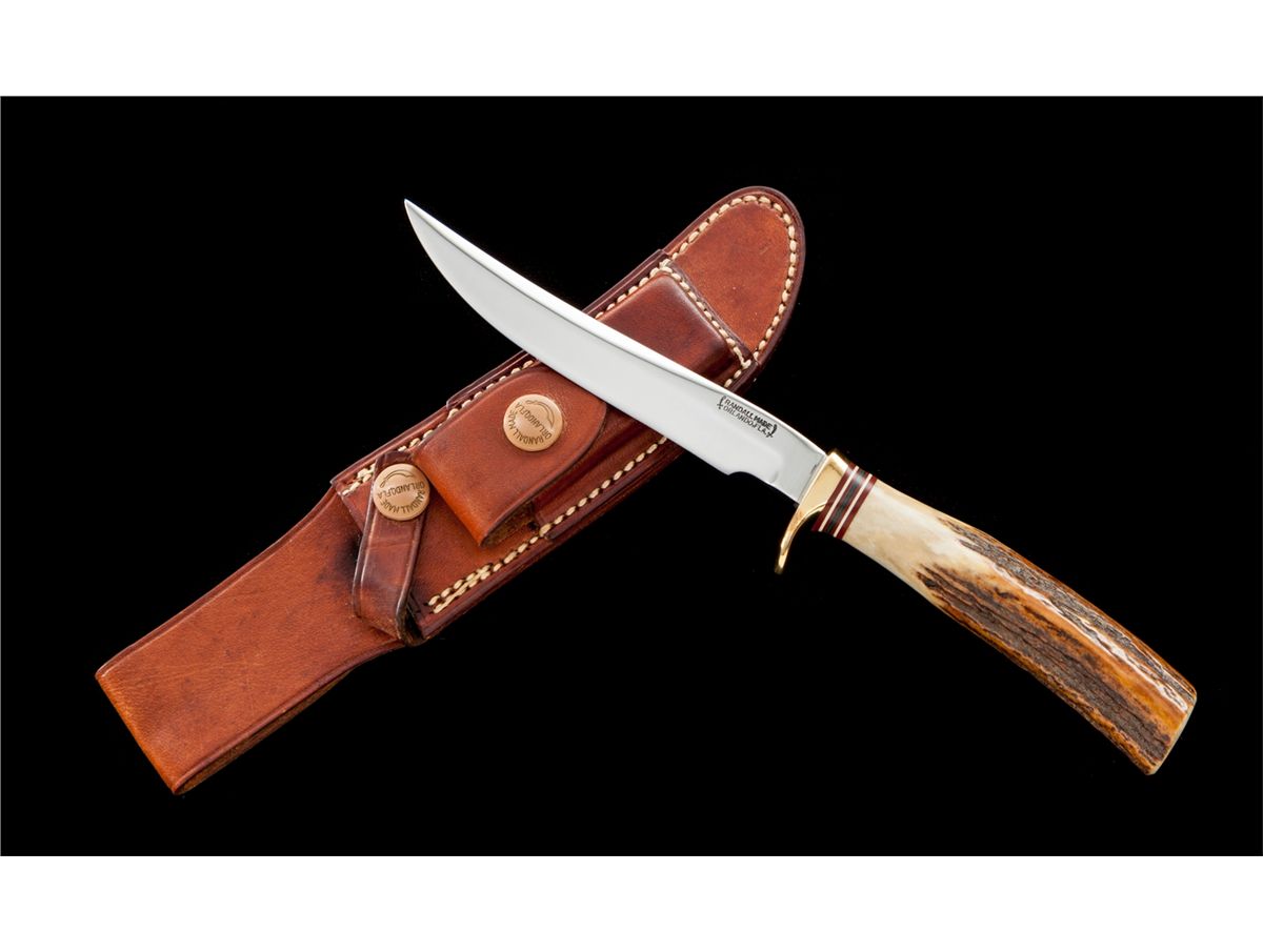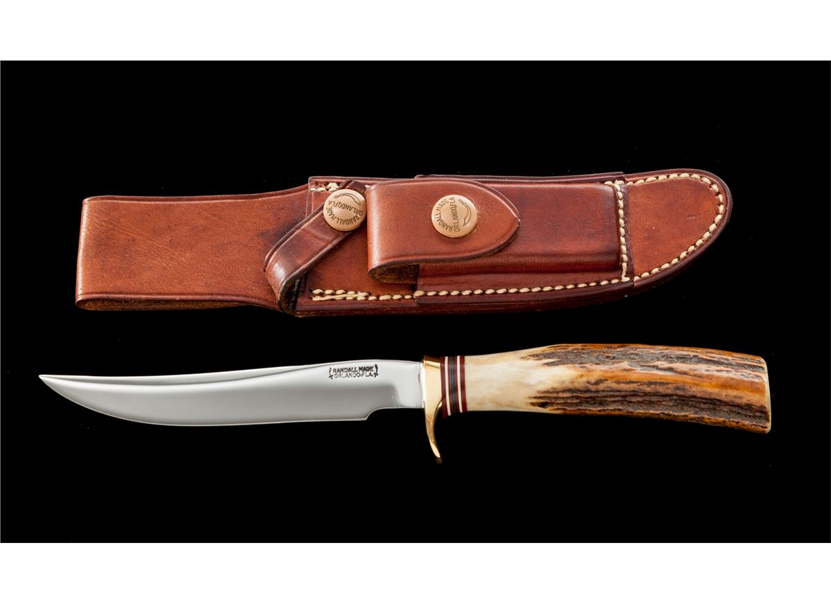 Vintage Randall Model 7 ''Fisherman-Hunter'' Knife, 5'' blade is marked ''RANDALL MADE/ORLANDO, FLA.'' The overall length is 9-1/2''. Stag handle, brass half guard, with seven spacers. Early Johnson rough back sheath stamped with the ''Randall'' football-shaped logo and ''7-5'' on the back side of the belt loop. Brown plastic ''Randall'' marked snaps, and a unmarked two-part combination Crystolon sharpening stone. Condition is excellent, showing signs of light use, and appears to have been lightly and professionally cleaned. Leather sheath with mild discoloration near the throat and on the inside of the keeper strap. Snaps remain crisp with tight stitching and seams. Est.: $750-$1,000.