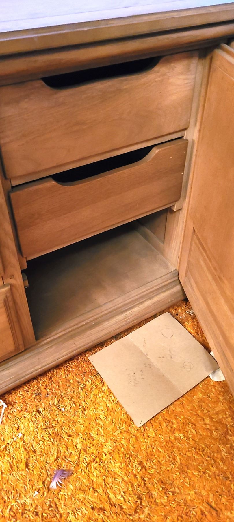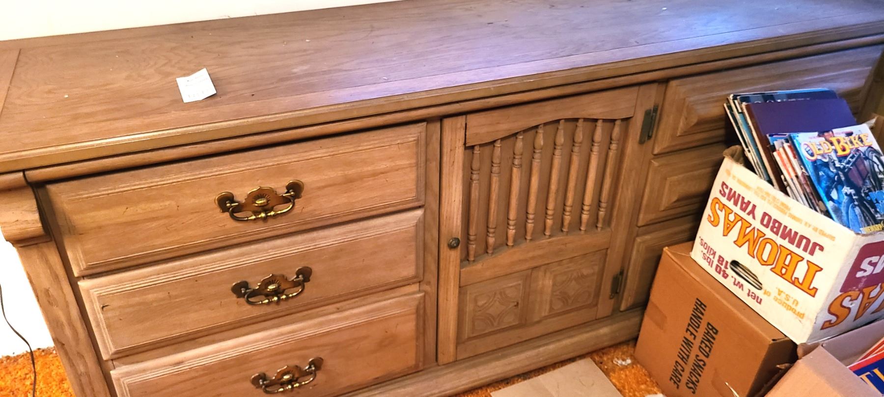 Vintage sideboard with 6 drawers and cupboard with pull out cutlery drawers. 75x19x30 note scratches and pickup at 1:30 pm