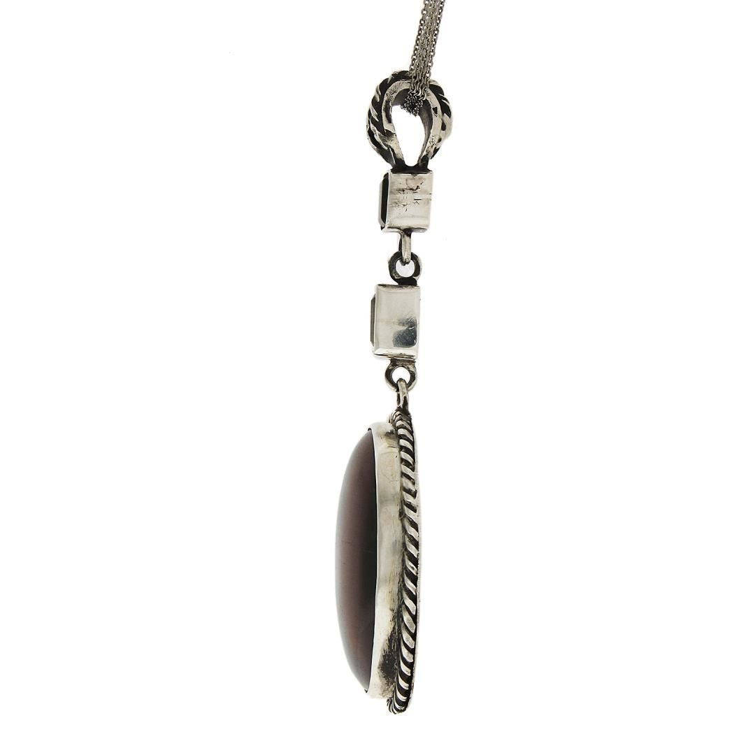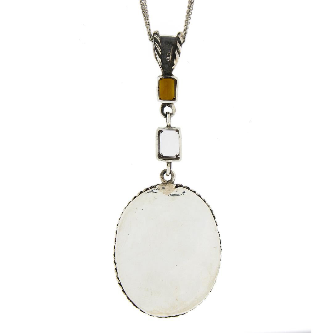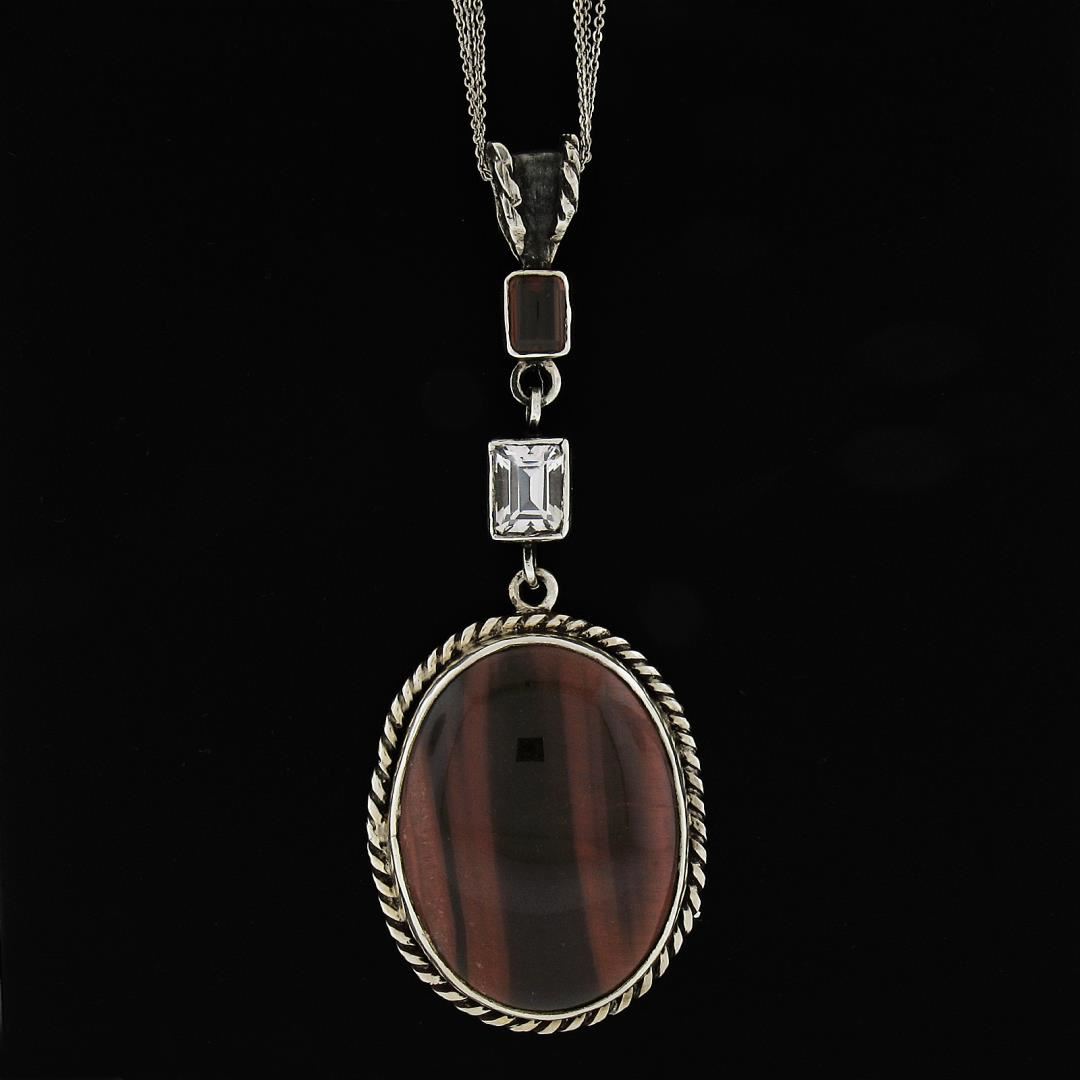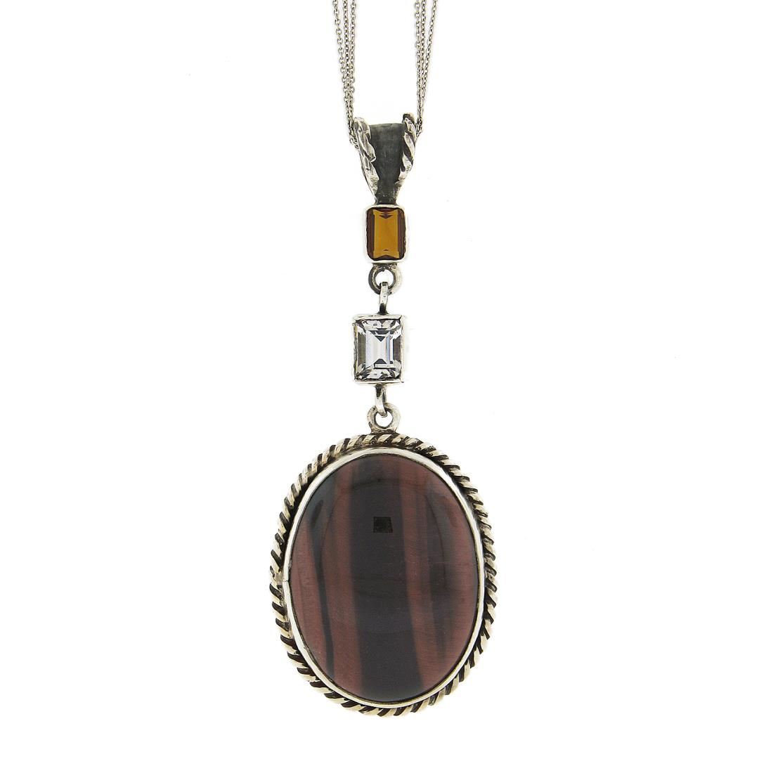A vintage solid silver pendant necklace, with 1 oval cut natural tiger's eye (38.4x29mm), and 2 emerald cut orange & pink stones 7.8x5.4mm & 9.4x6.3mm (). Adjustable 18 to 20 inch 3 row cable link chain, 38.83 grams total weight, pendant measures 92.4x35.9mm.