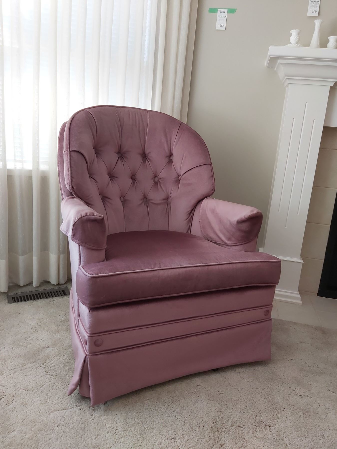 Crush velvet in rose pink fabric, 29x22x38 custom crafted by Vogel. Pickup at 11am