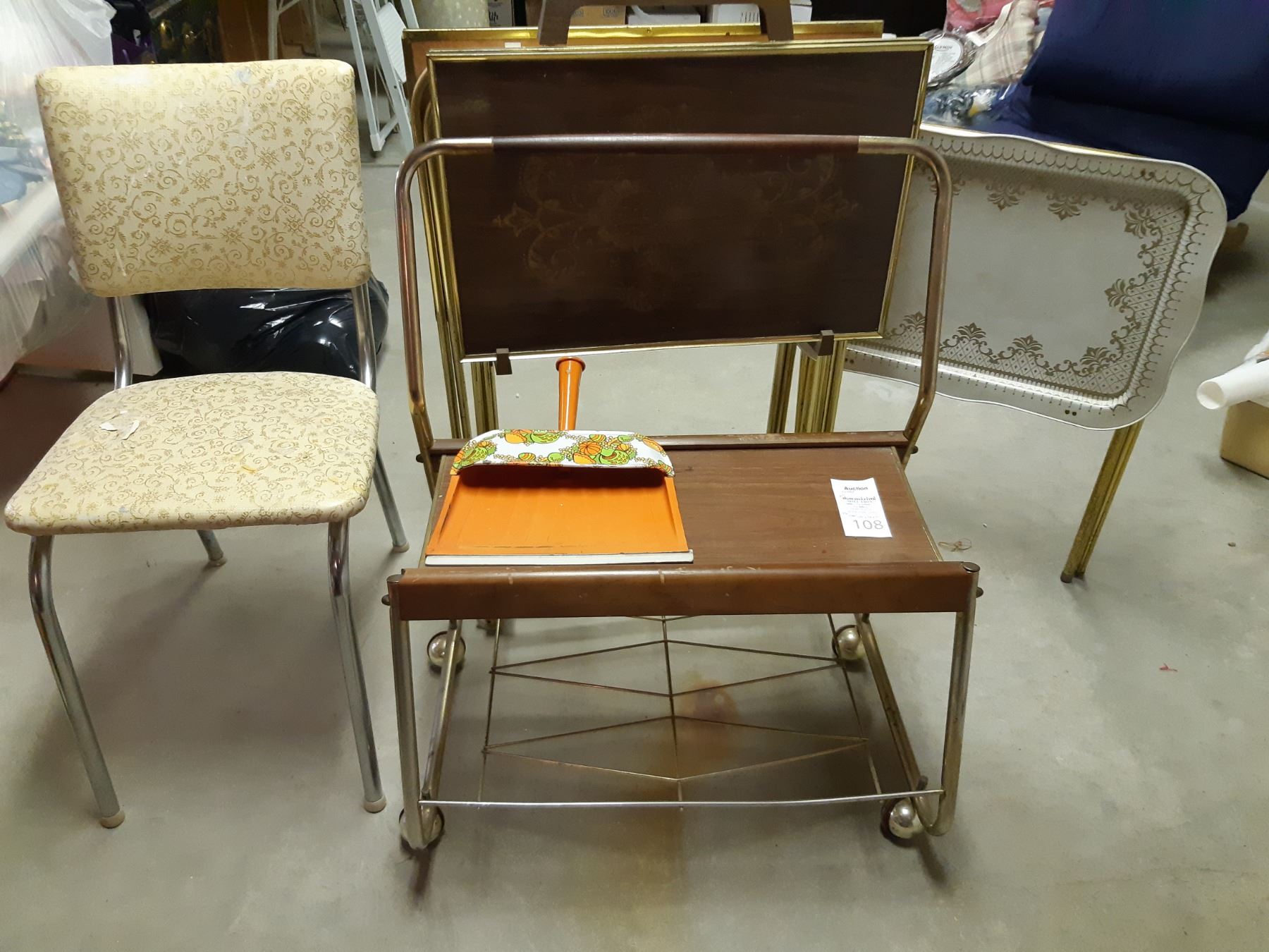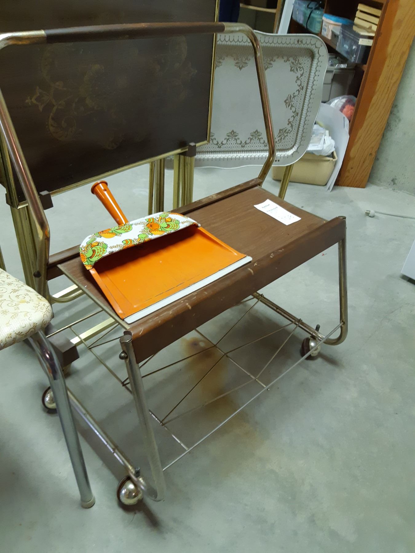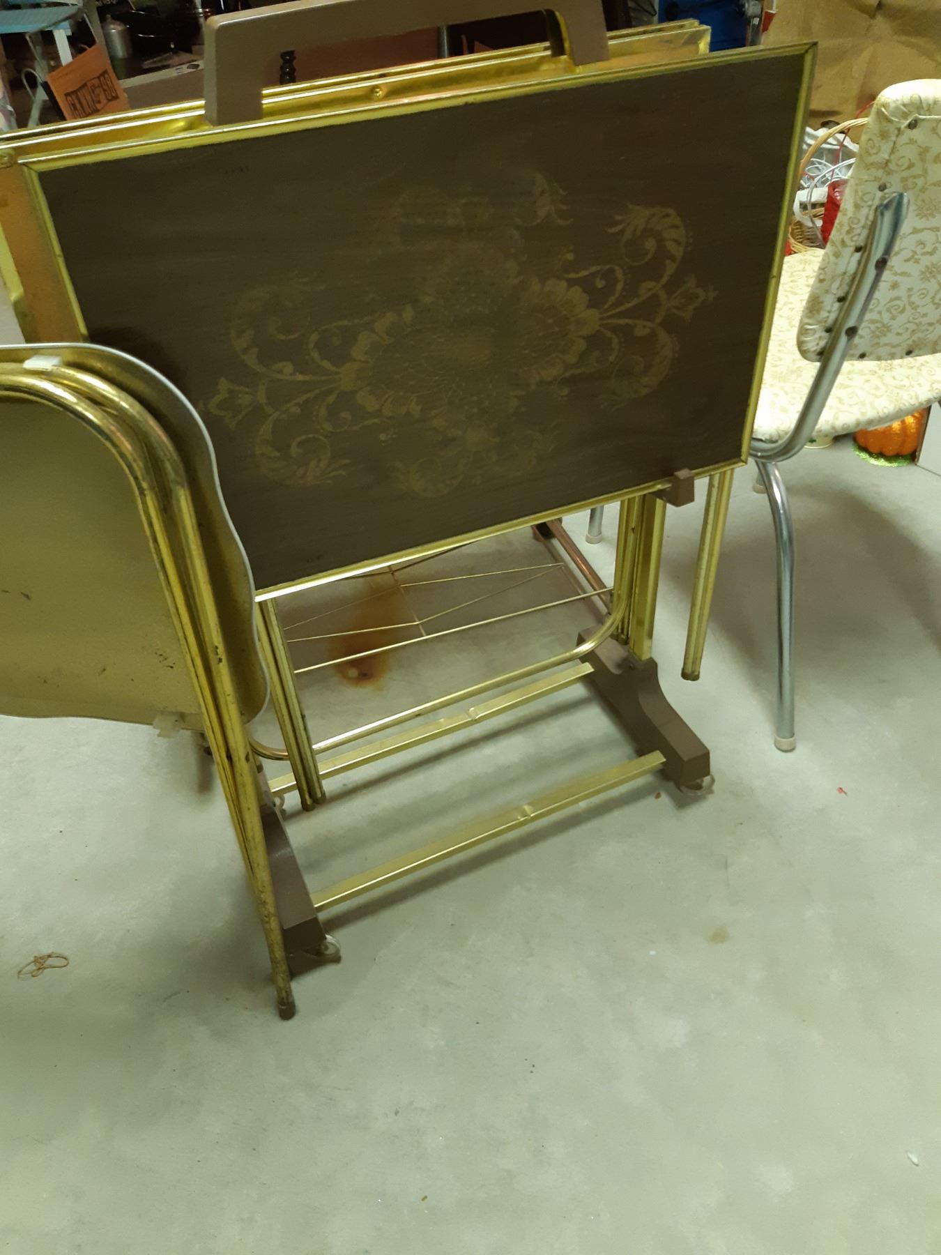 TV tables, vintage metal tv stand, chair. Pickup at 10 am