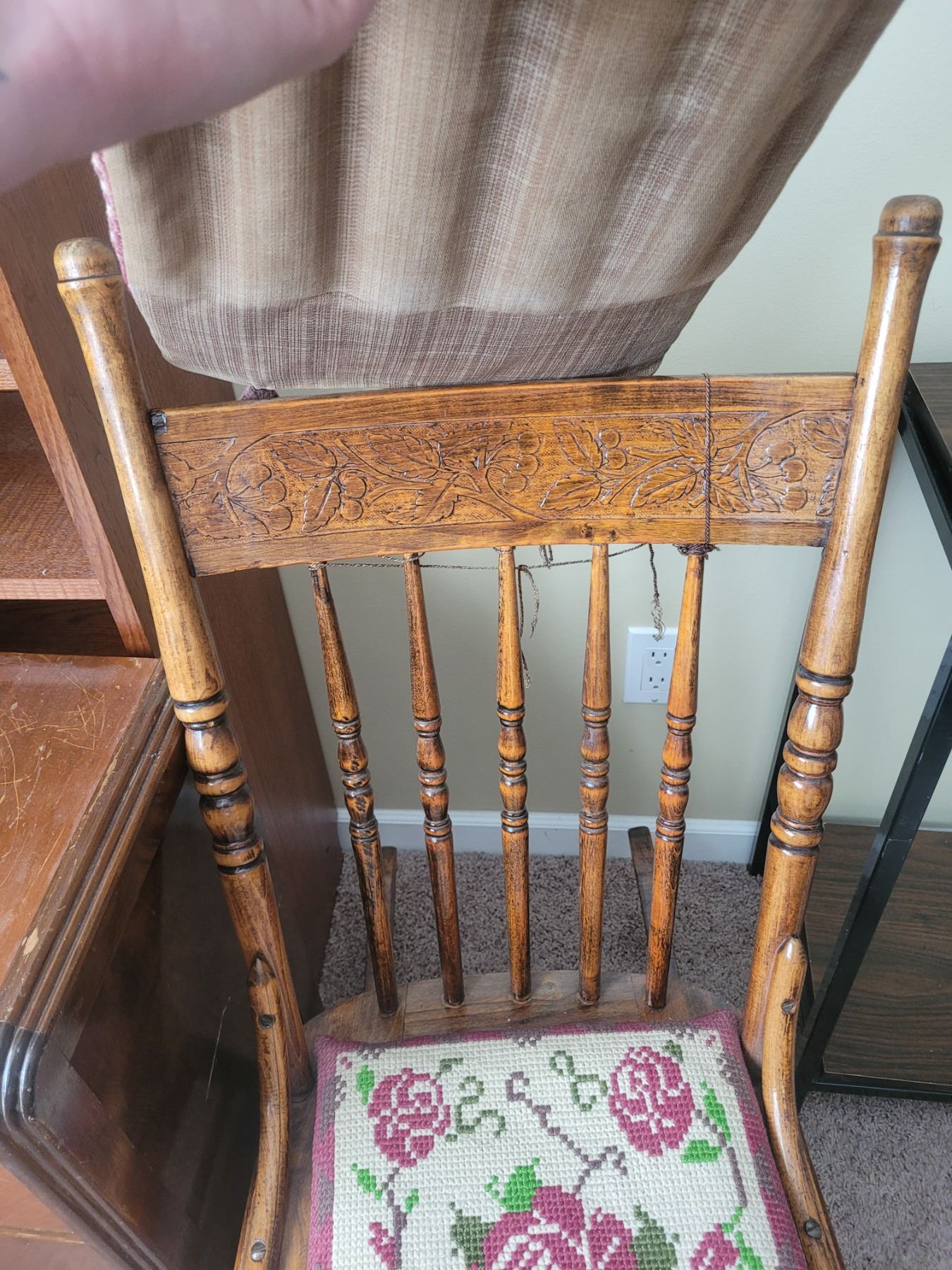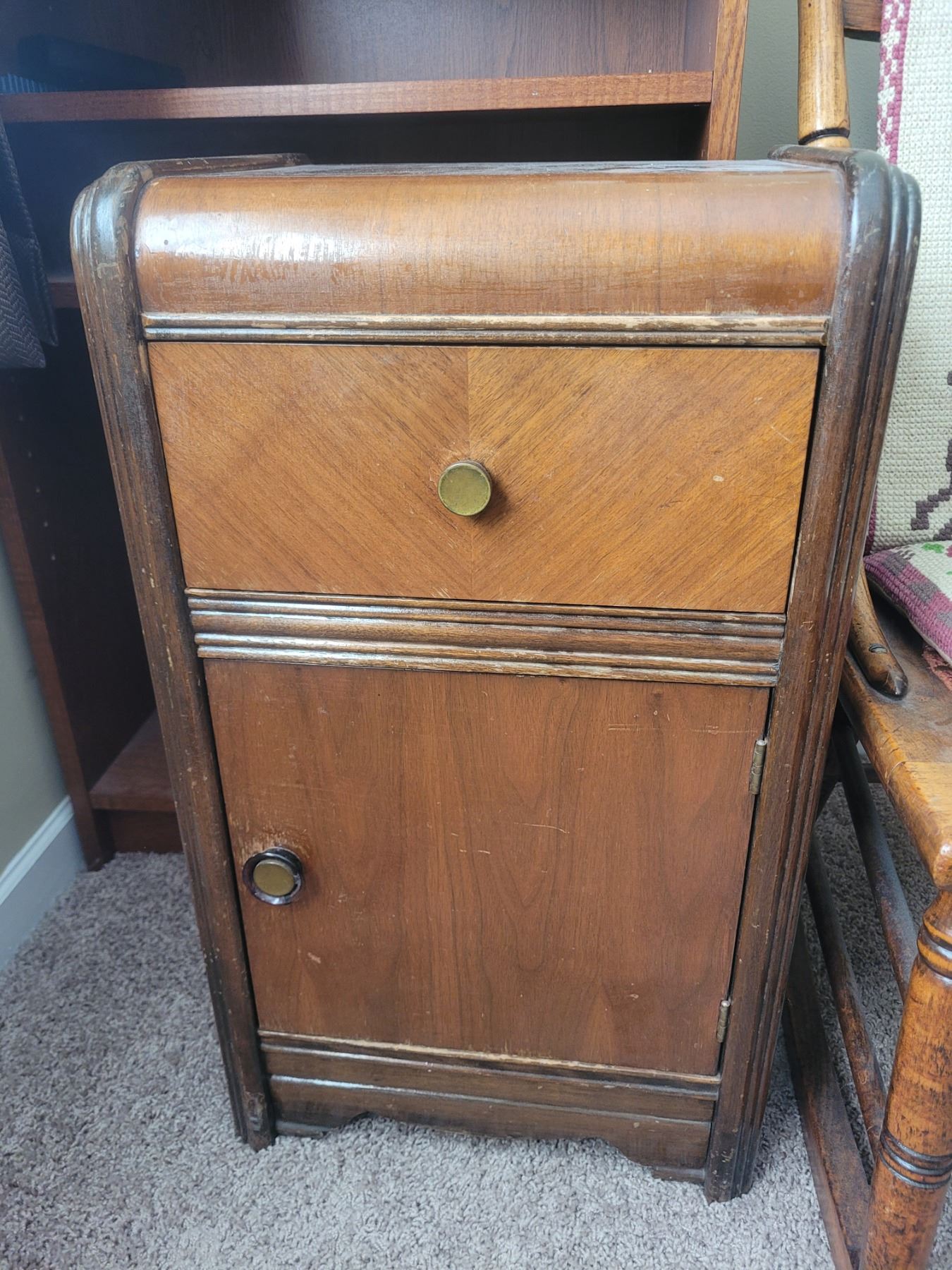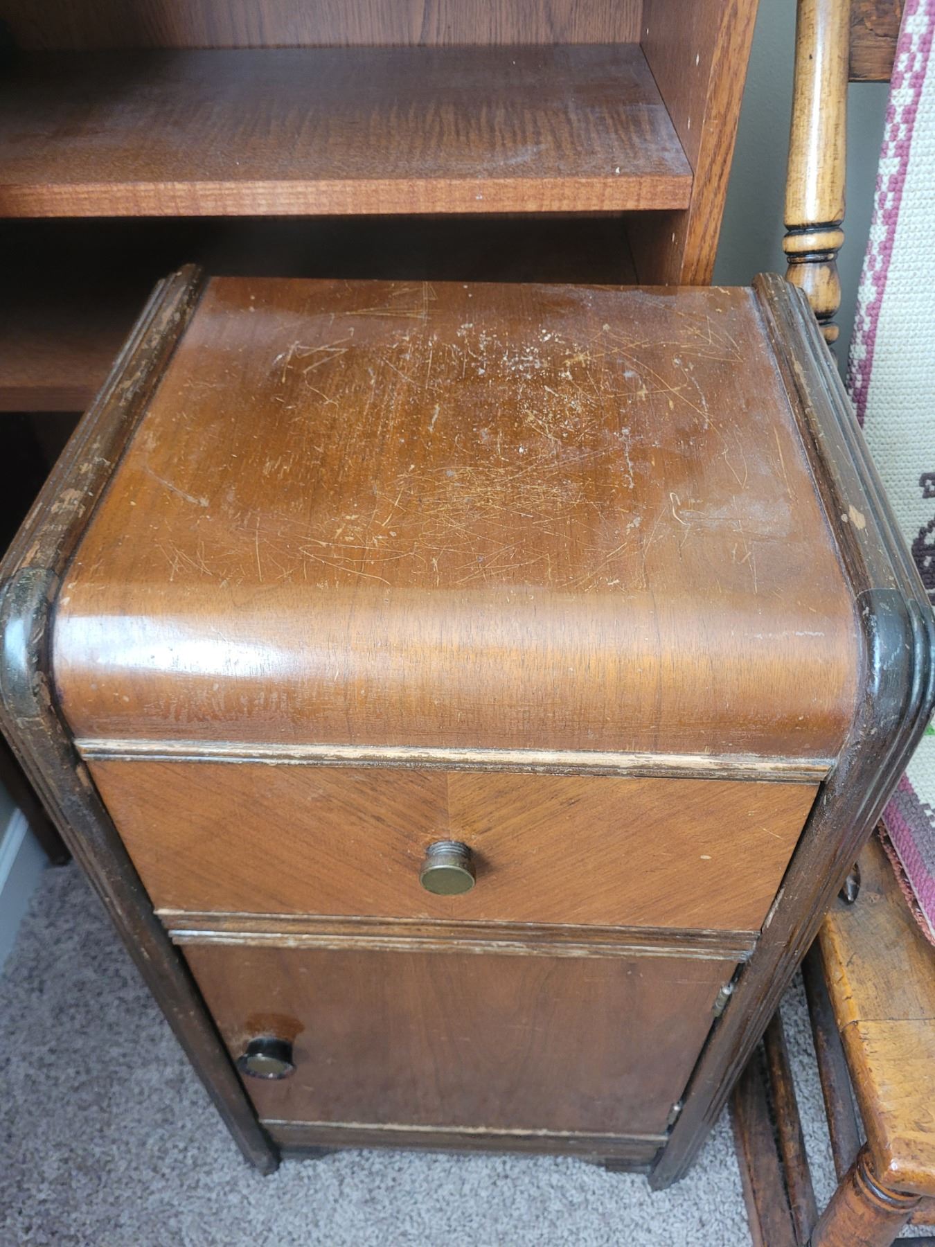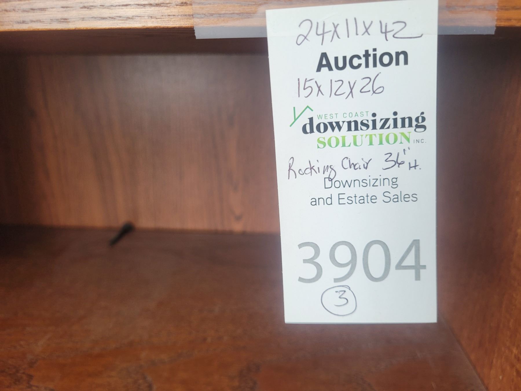 Press back rocking chair, 36" tall. Side cabinet 15x12x26 note scratches and book shelf 24x11x42. Pickup at 11 am