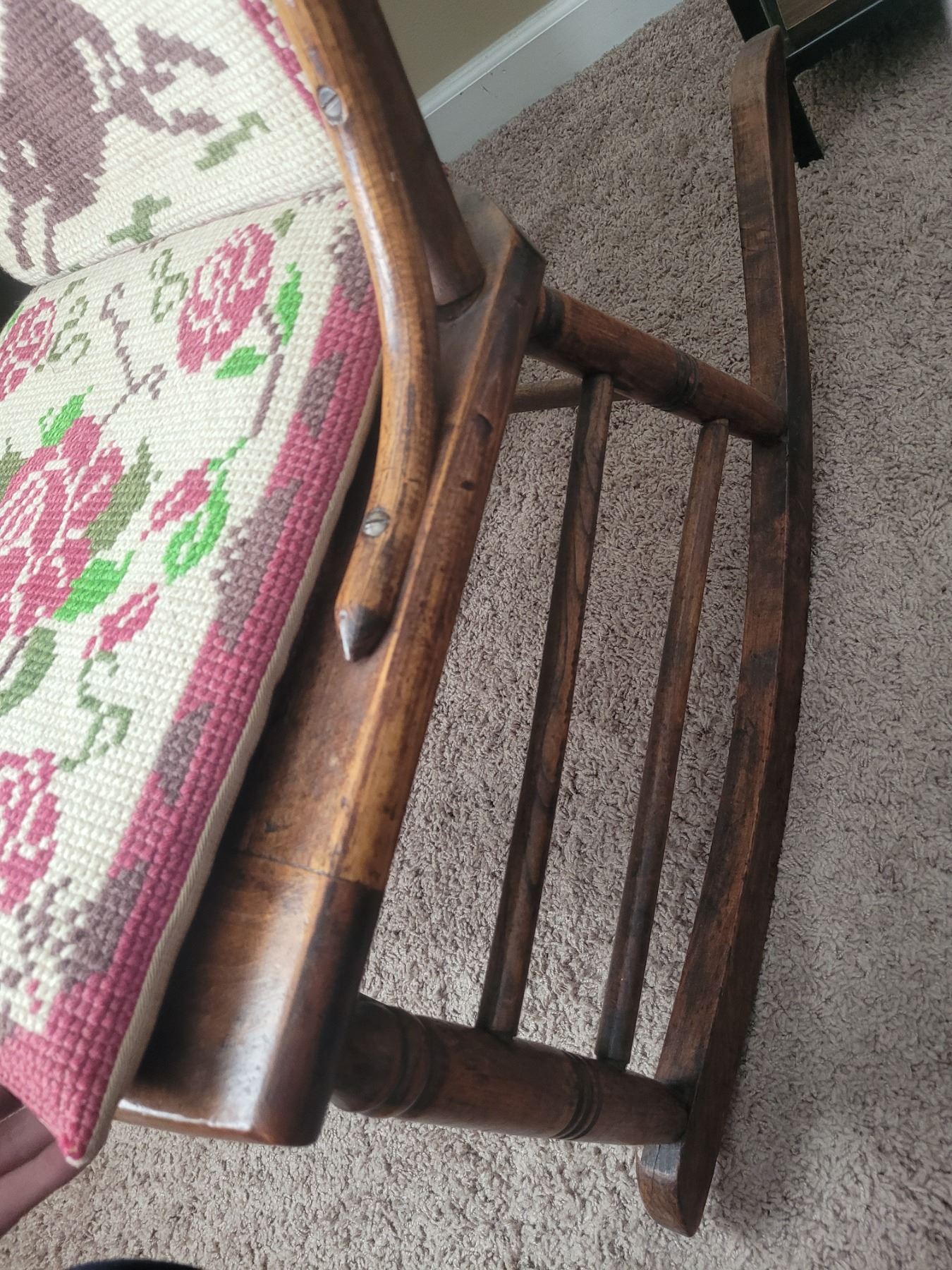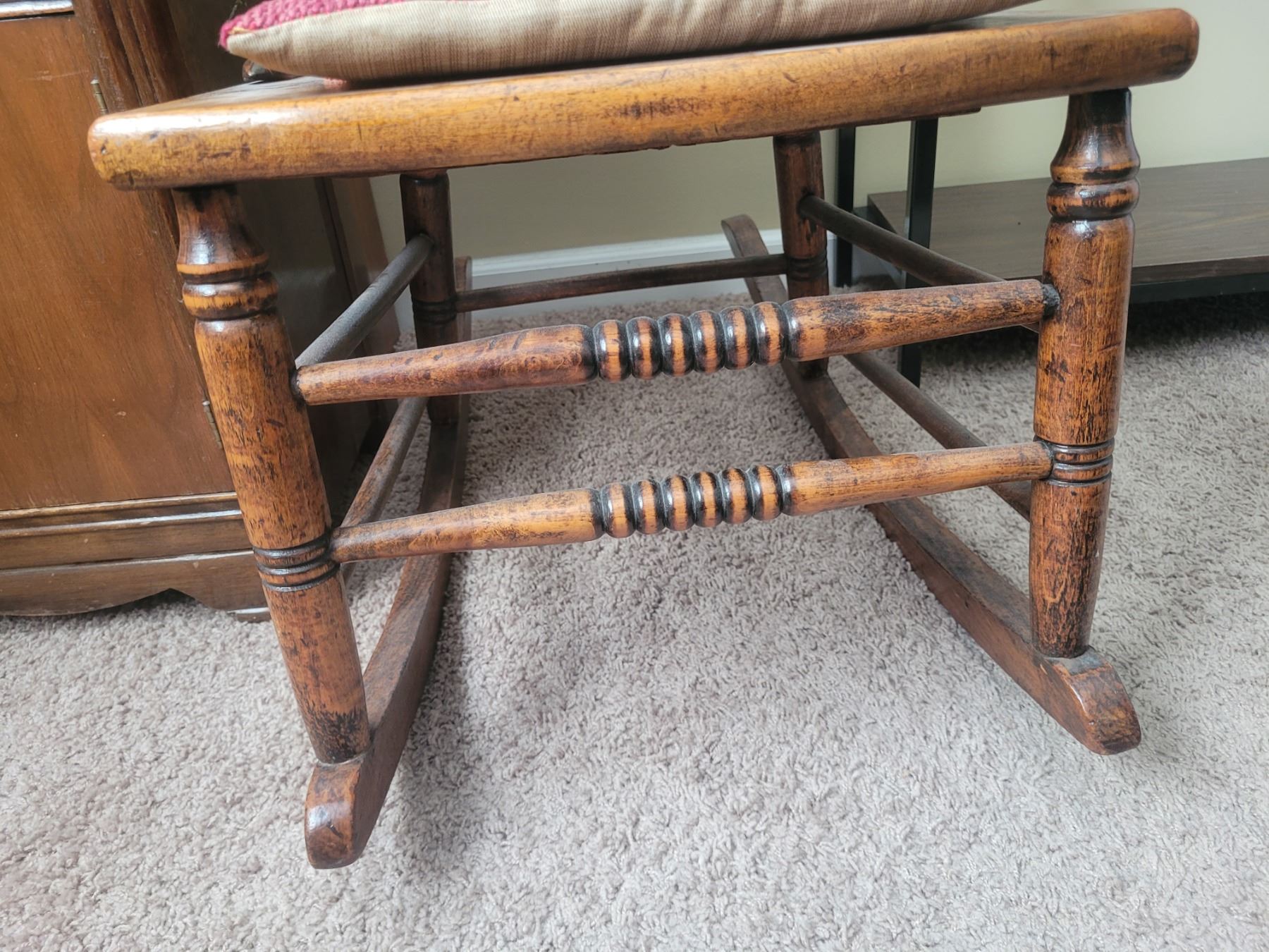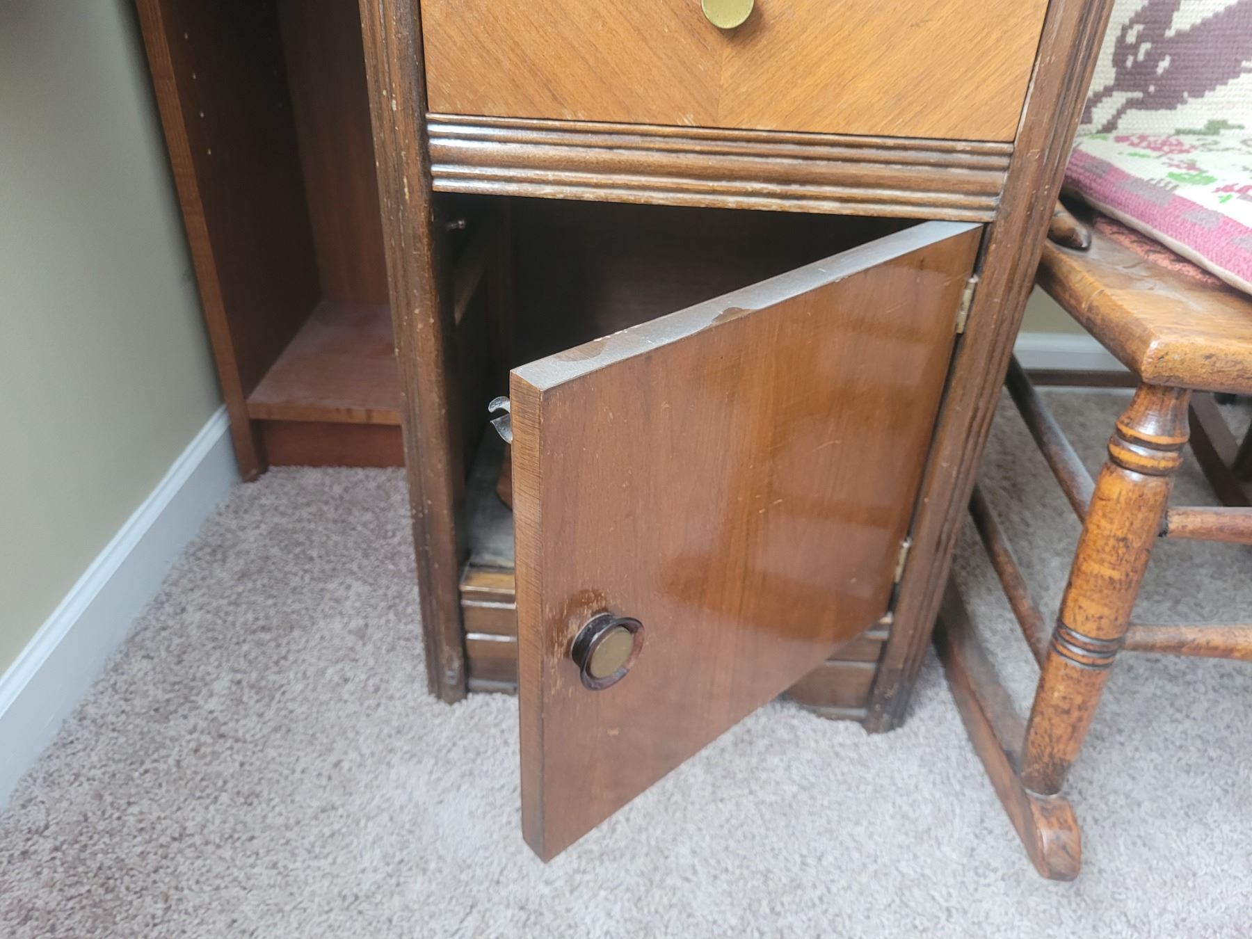 Press back rocking chair, 36" tall. Side cabinet 15x12x26 note scratches and book shelf 24x11x42. Pickup at 11 am