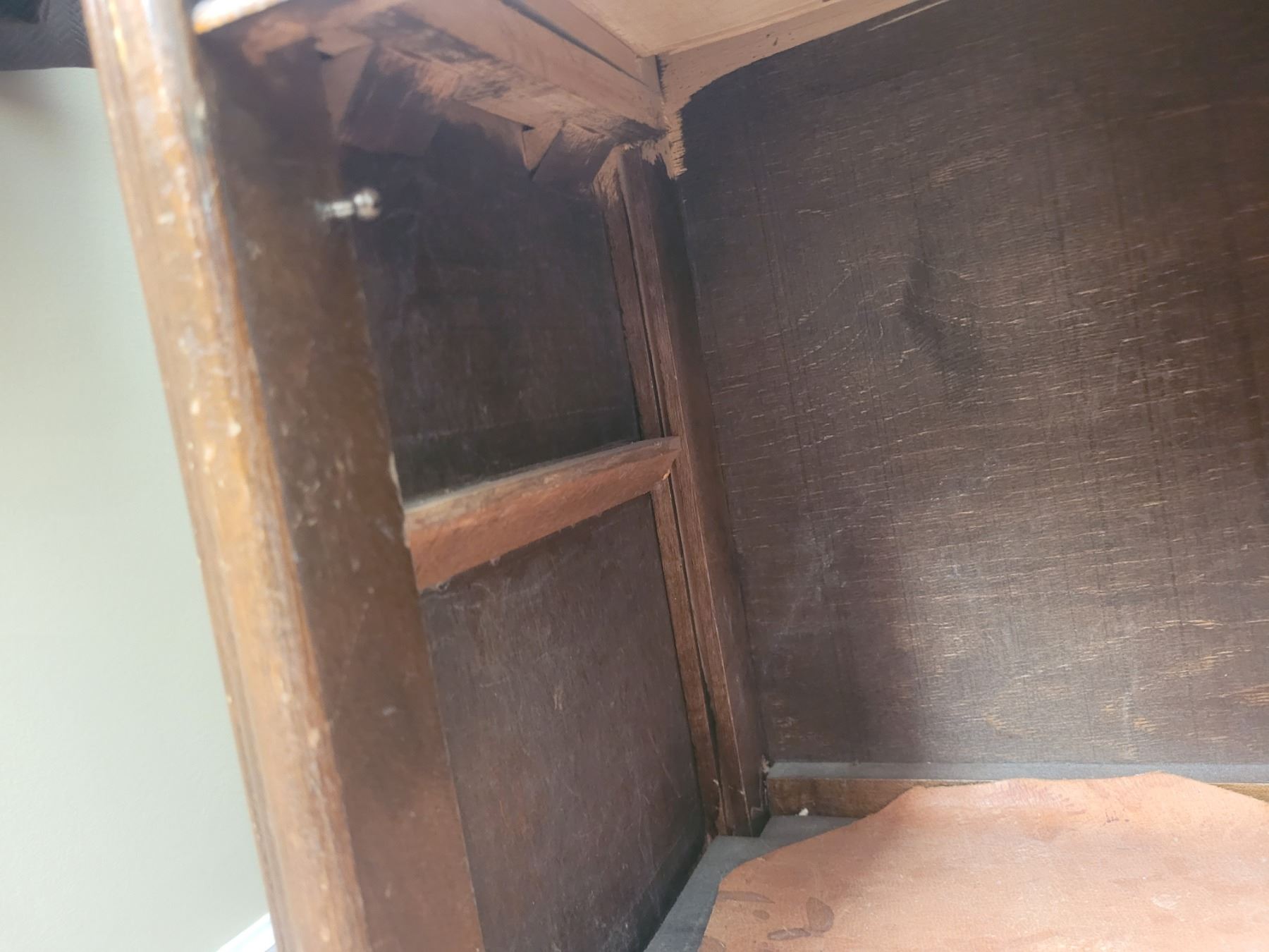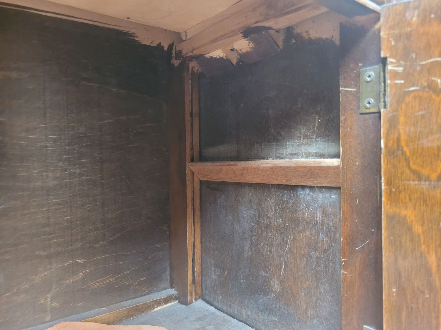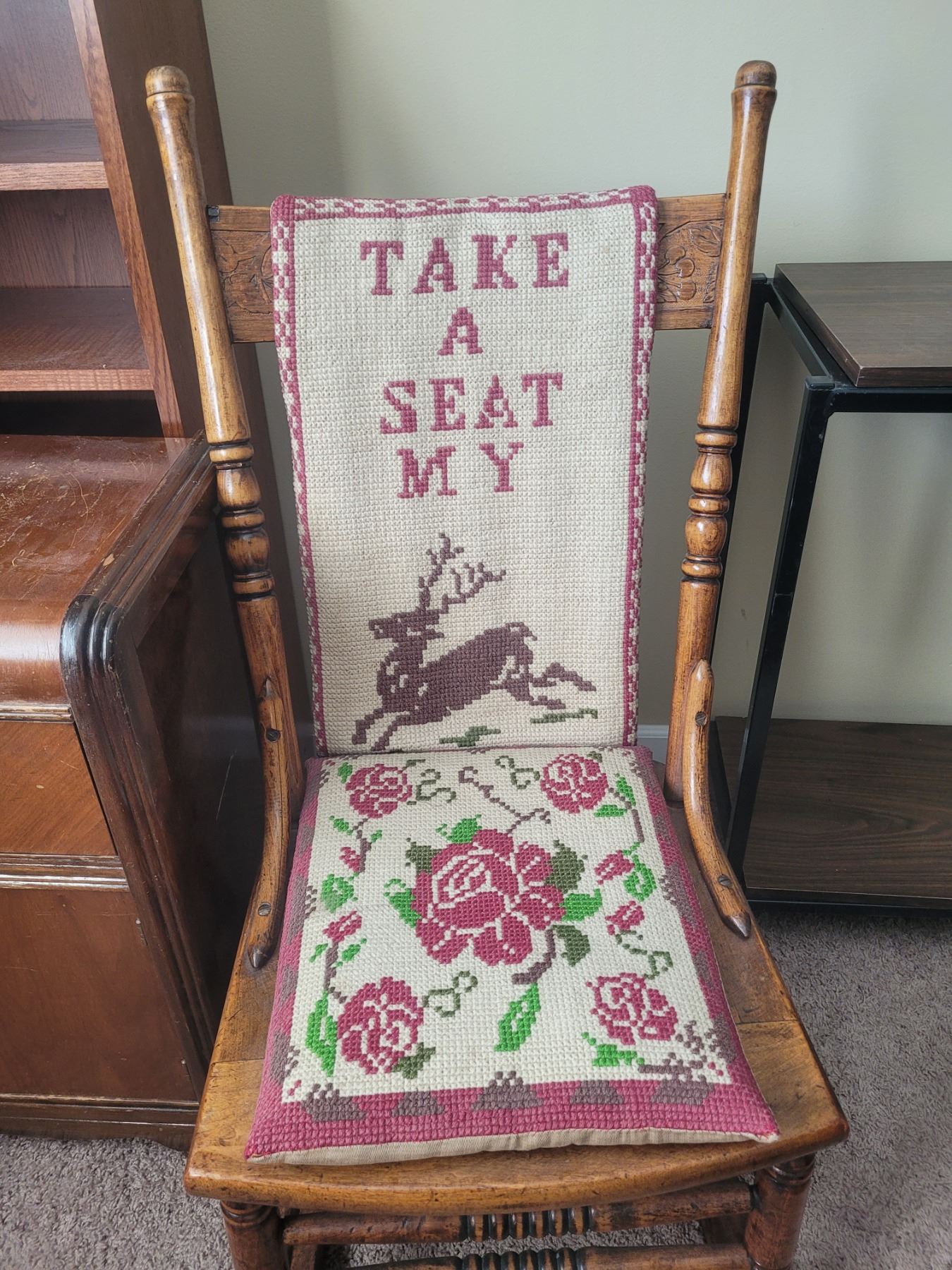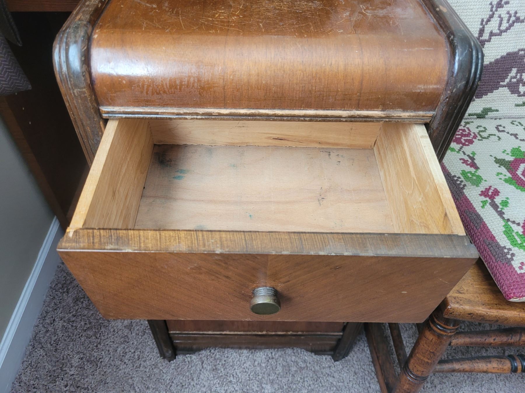Press back rocking chair, 36" tall. Side cabinet 15x12x26 note scratches and book shelf 24x11x42. Pickup at 11 am
