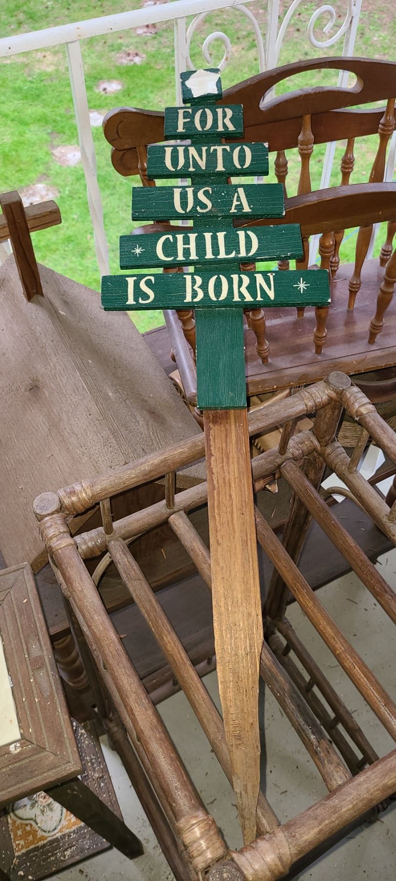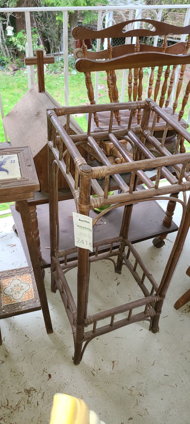 Bamboo style table 31 tall. Plant stand with tiled shelves. Magazine rack, church and table with bottom shelf. Pickup at 11 am