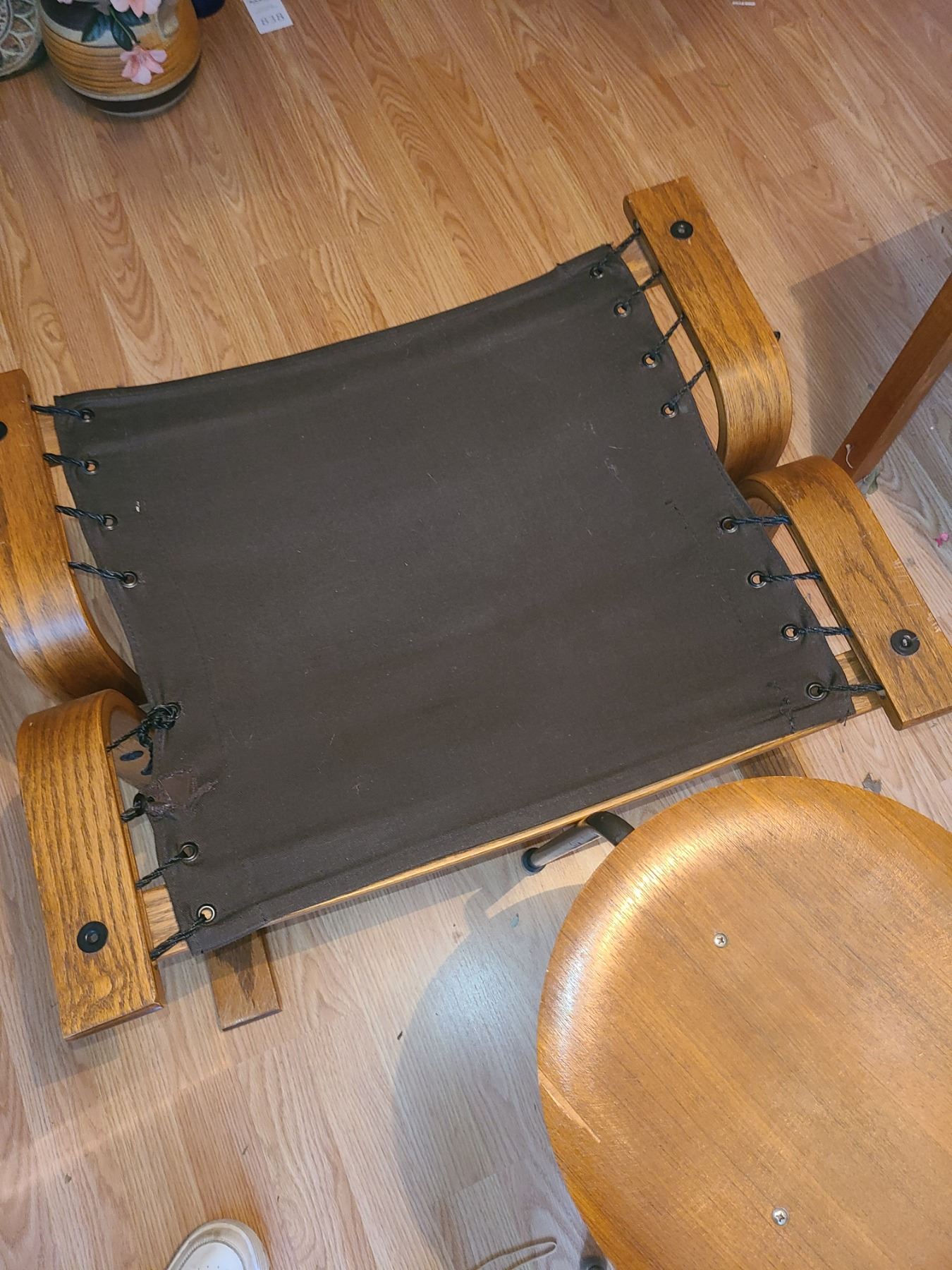 Lot of two Teak stools and fabric table. Note some wear and tear. Pickup 9am.