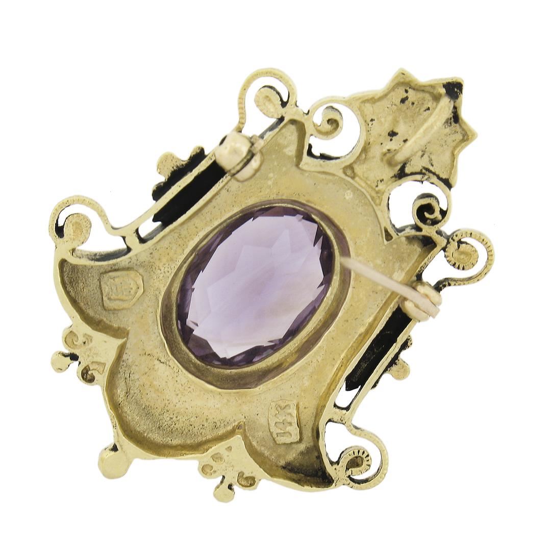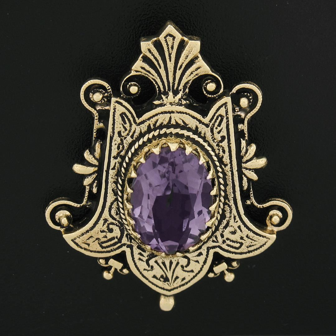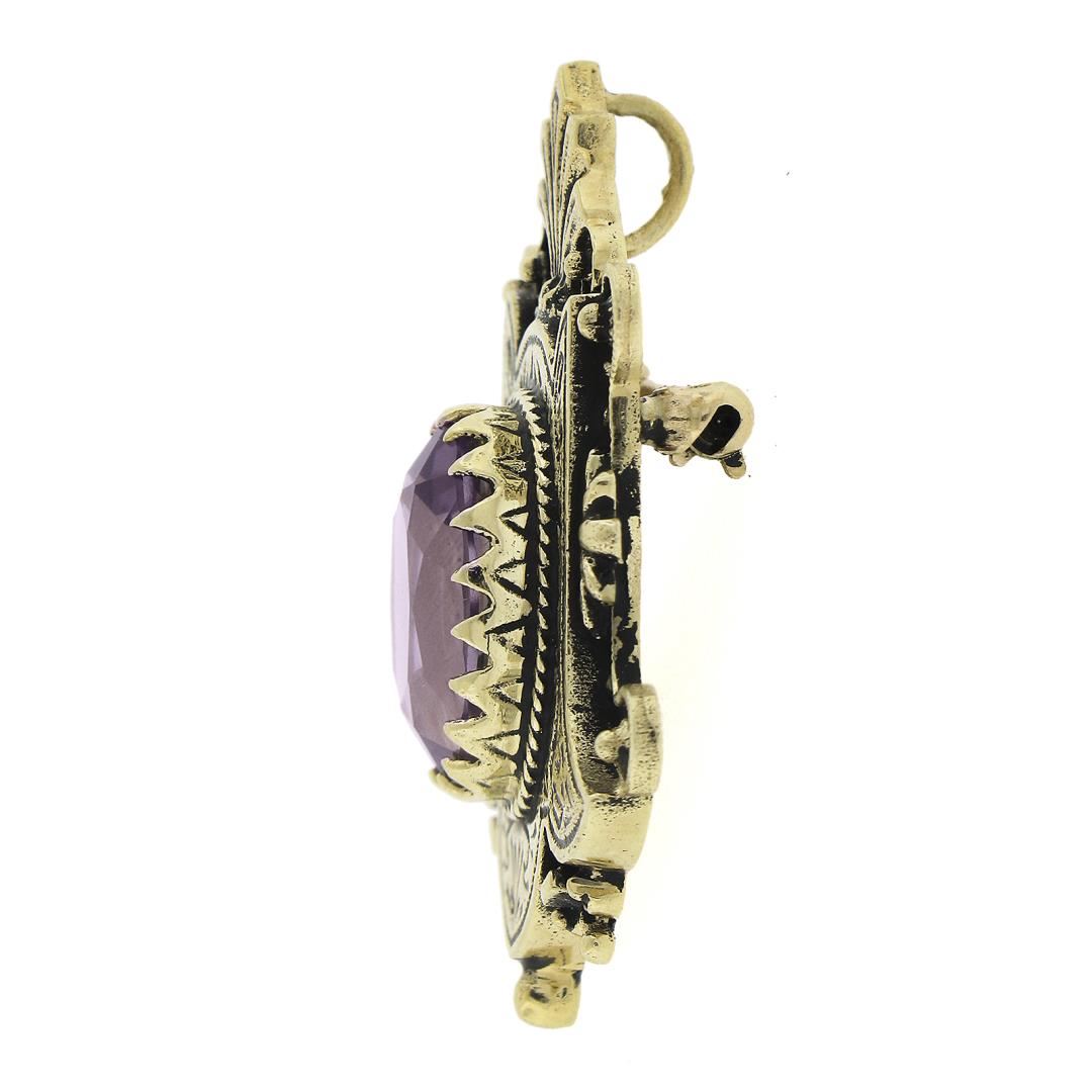 A vintage solid 14k yellow gold brooch pendant, featuring 1 oval cut natural amethyst (13.8x10mm). Measures 38.1x30.1mm and weighs a total of 9.09 grams, and the inside bail measurements are 4.5x3.2mm.