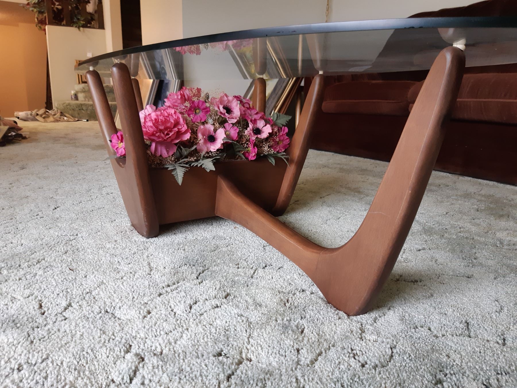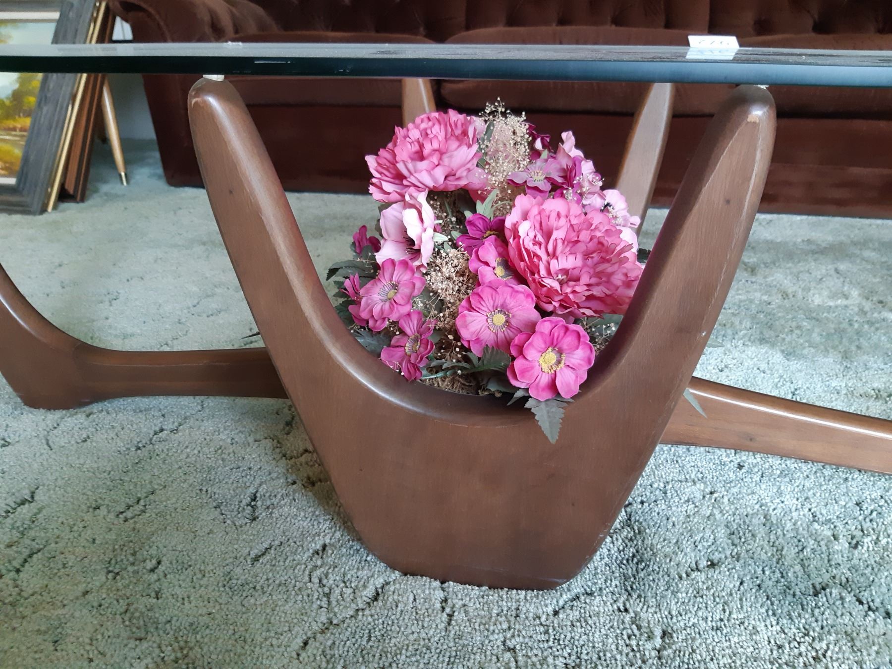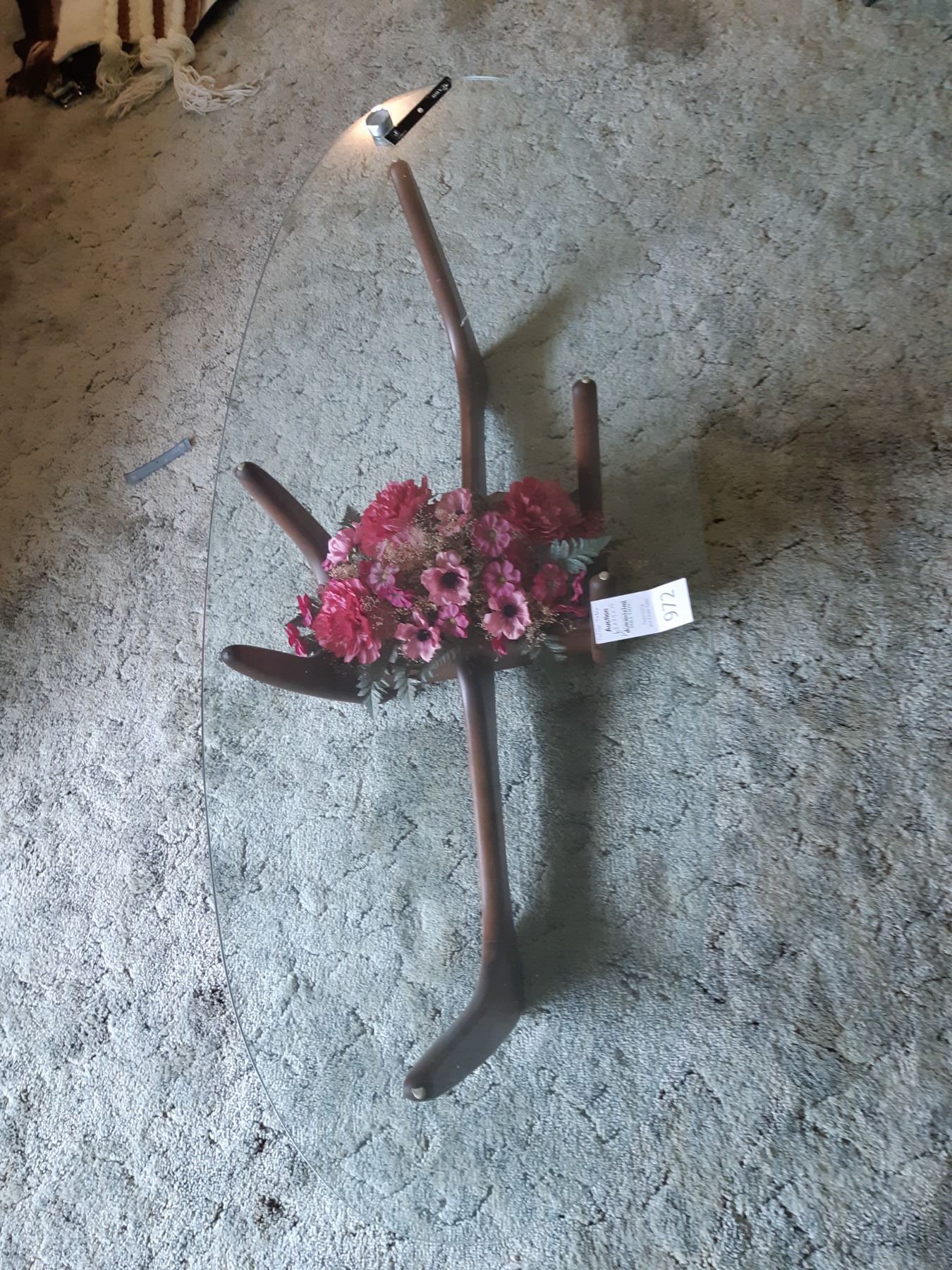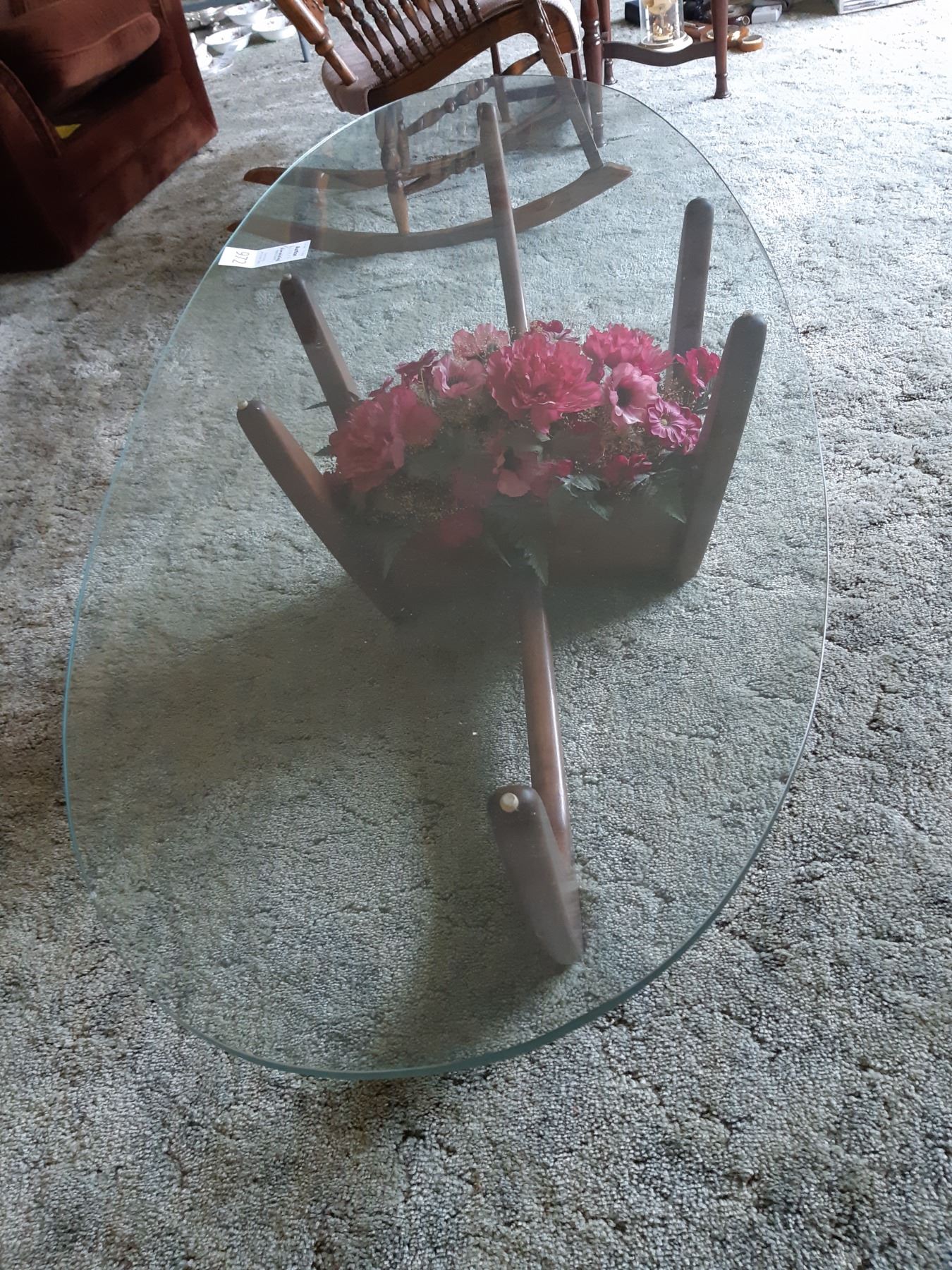 Oval coffee table with inverted supports, note scratches 60x24x15. Pickup at 10am