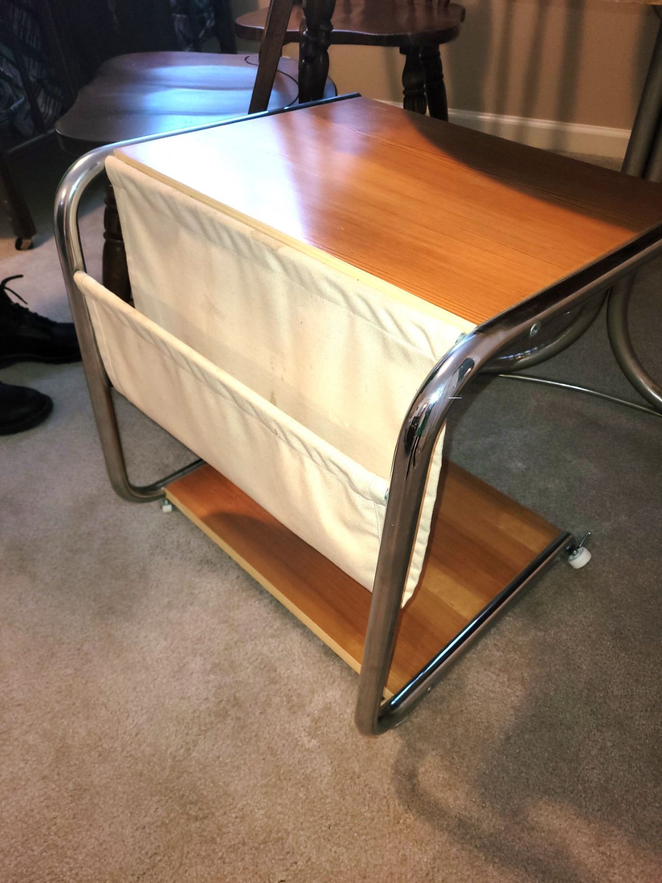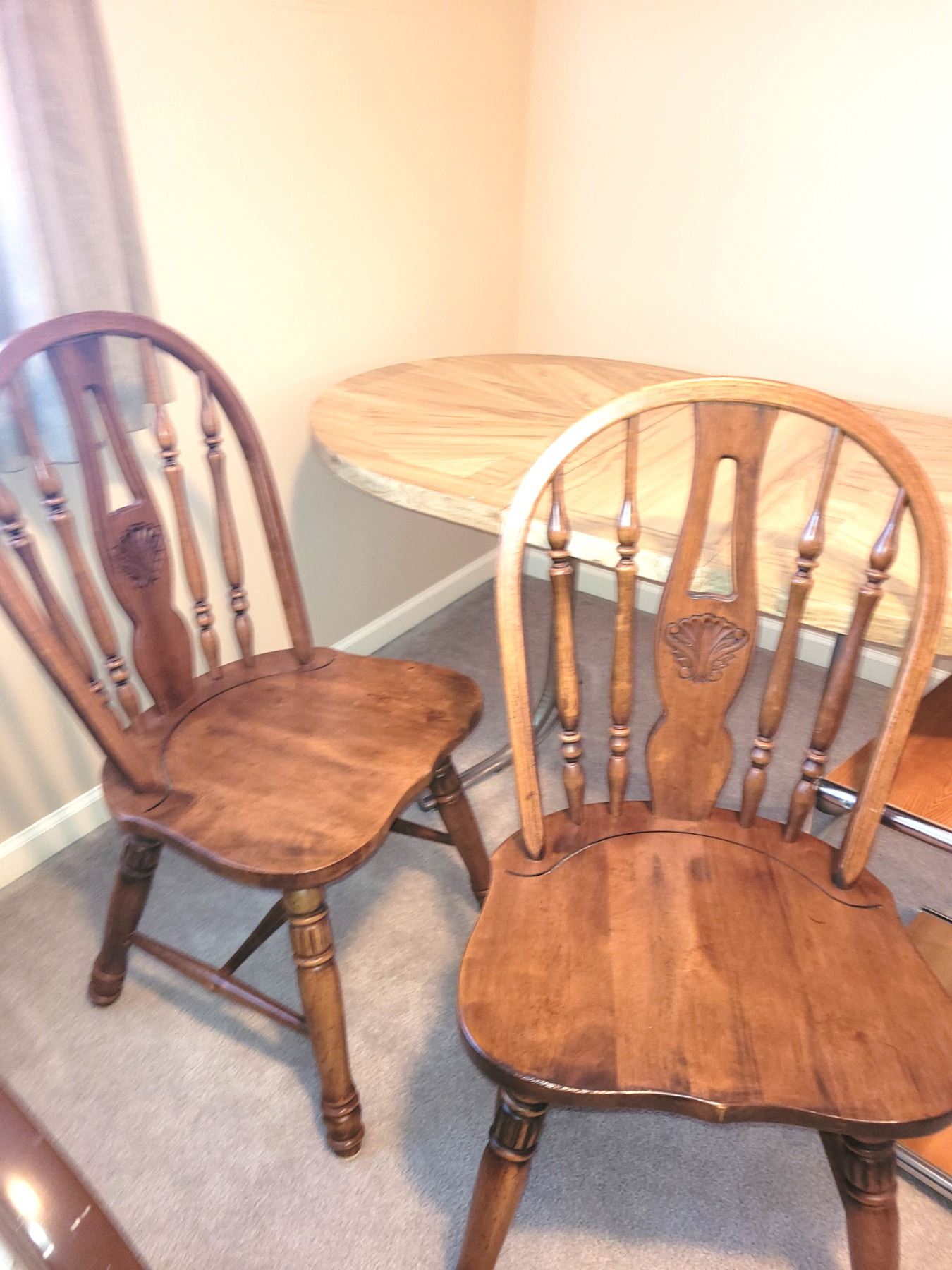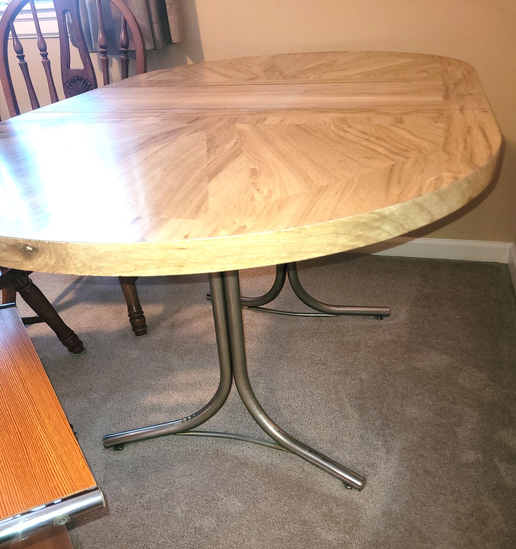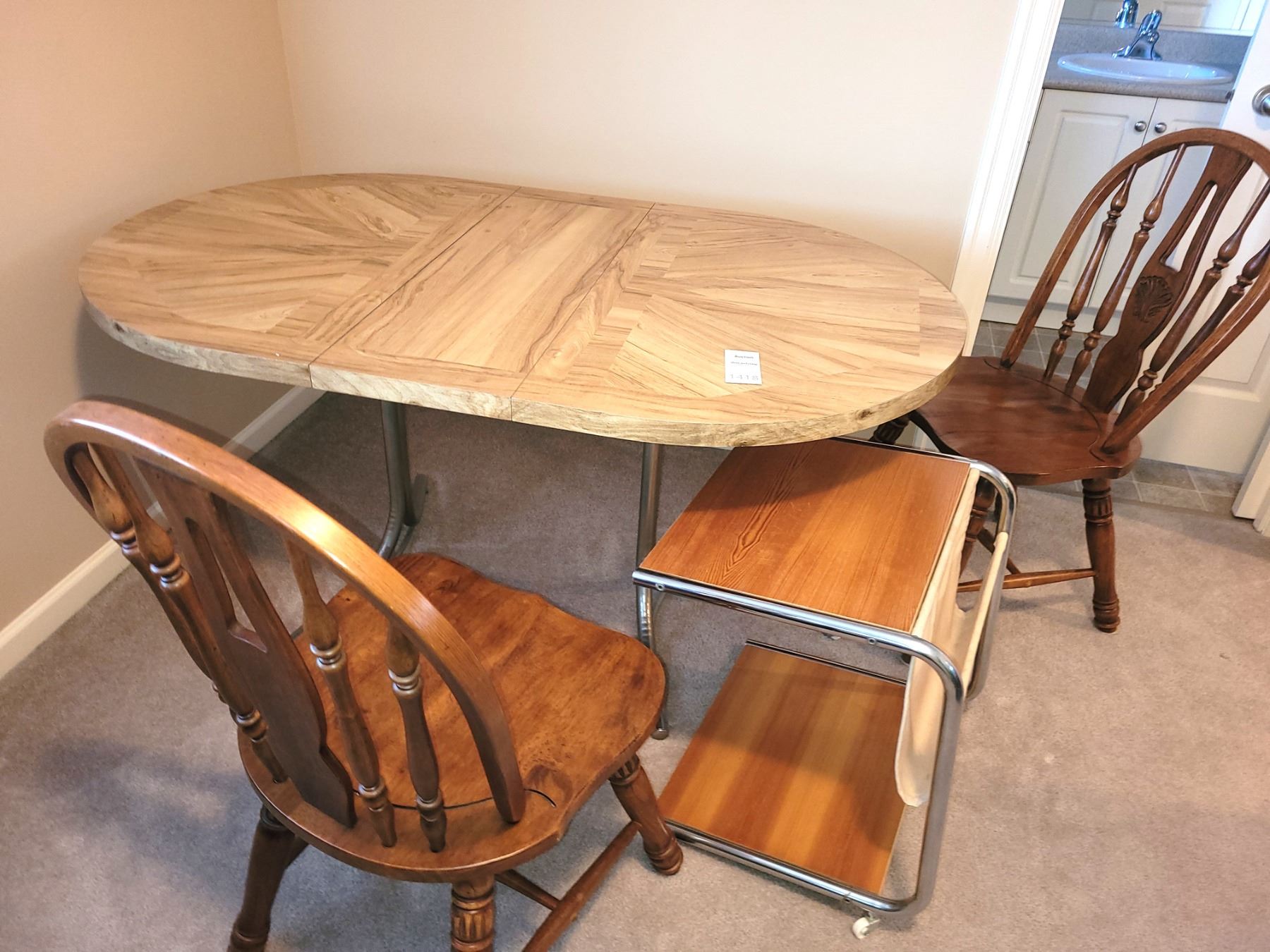56x36x29" oval vintage table with chrome legs measured with leaf, 20x17x22 vintage magazine rack with silver siding, 2x wood chairs with decorative carving 19x17". Heavy, bring help and note will be going down a few flights of stairs. Pickup 11-12pm