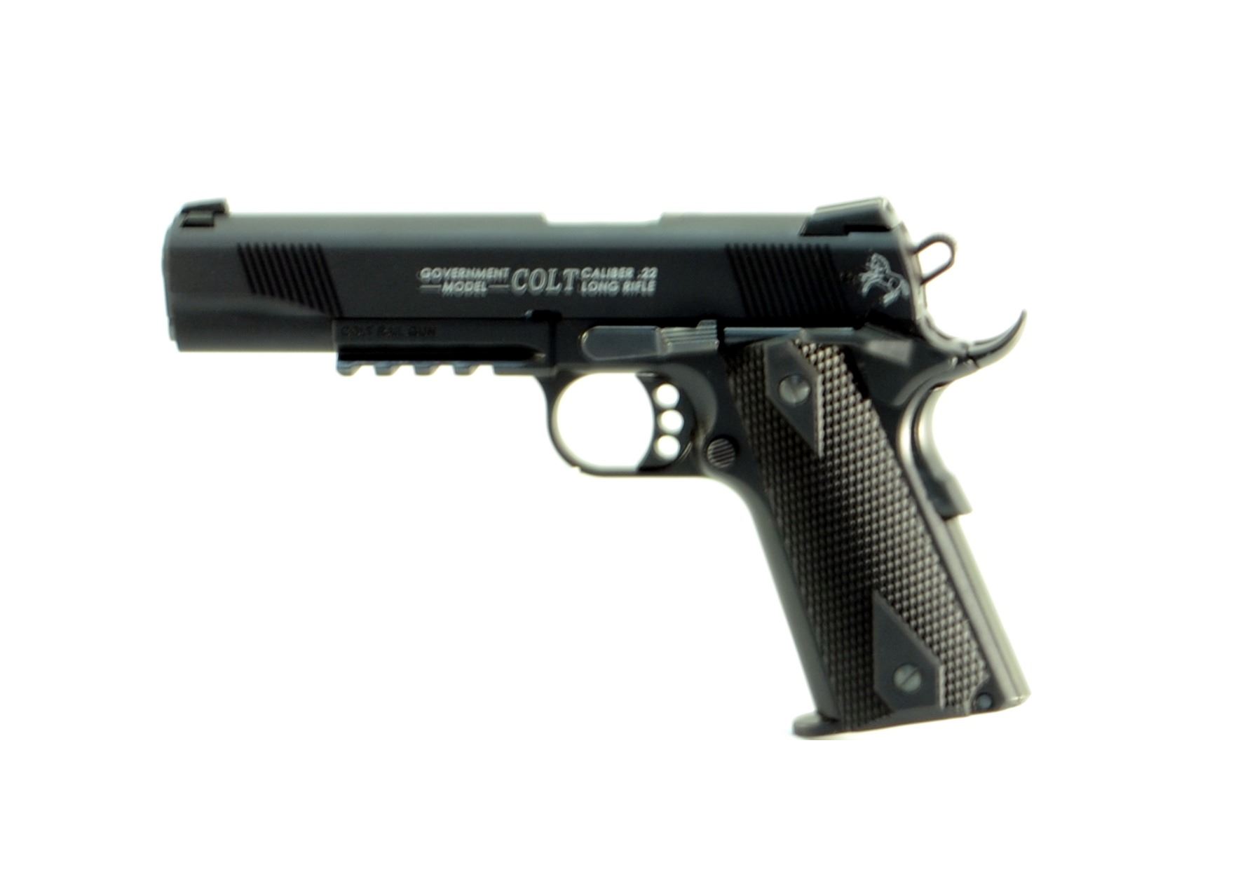 2412HR-0007 WALTHER COLT 1911A1 GOVERNMENT RAIL GUN .22LR SEMI-AUTO. 5" BARREL, NCSTAR COMPACT LASER. COMES WITH 2 MAGS, SAFARI HARD CASE, WRENCHES. MADE IN USA.