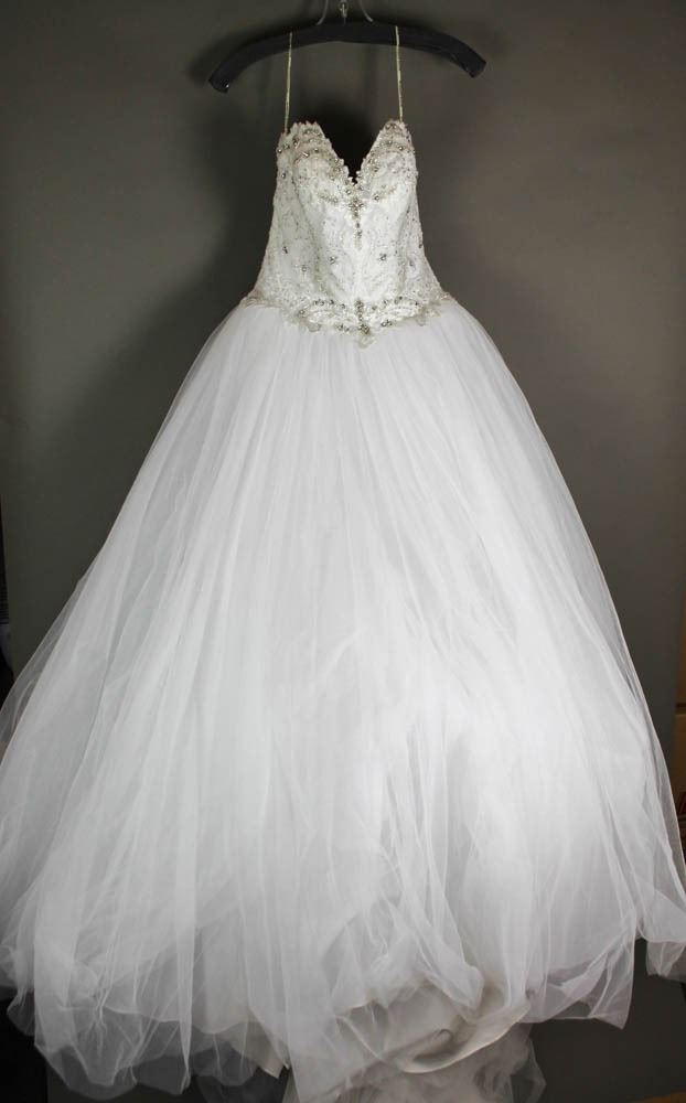 WHITE BEVERLY STRAPLESS BRIDAL GOWN; SIZE 10,