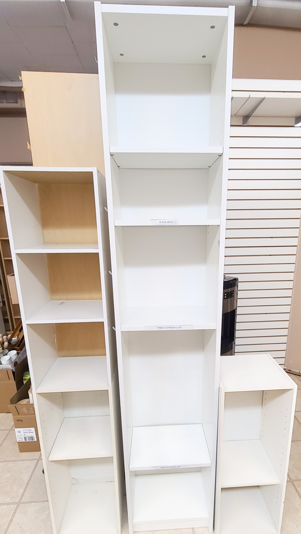 SM 31.5" H X 12" L X 12" W - MED 63"H X 12" W X 12"L - 79.5" H X 16" L X 11W SHELVING MUST BE REMOVED BY BUYER PLEASE BRING YOUR OWN TOOLS AND HELPERS