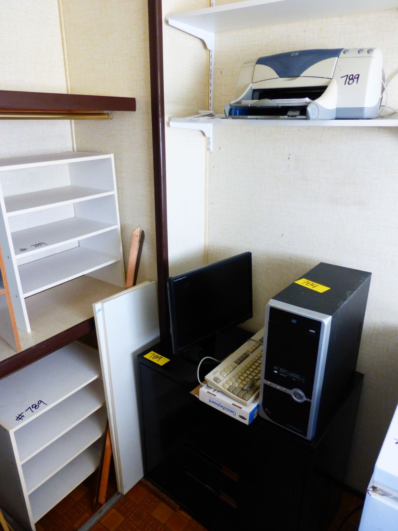WHITE SHELVING UNITS, PRINTER, COMPUTER MONITOR, CPU, KEYBOARD, ETC