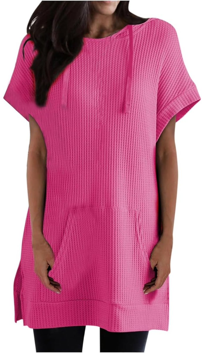 WOMENS SUMMER OVERSIZED SHIRTS 2024 SHORT SLEEVE SHIRTS DRAWSTRING HOODIE WAFFLE KNIT SIDE SLIT TUNIC TOPS WITH POCKET HOT PINK