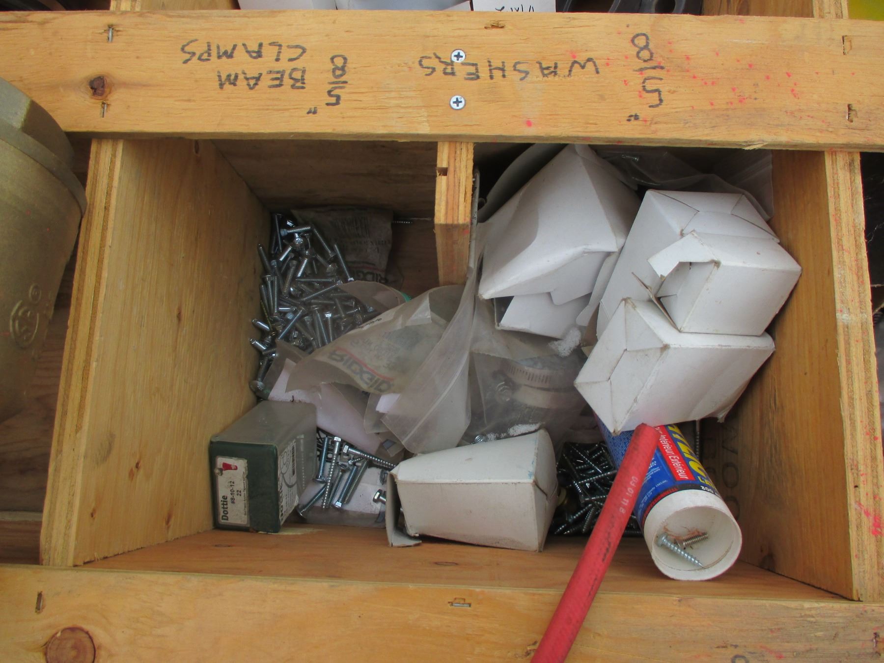 WOOD CABINET C/W READY ROD, VALVES, NUTS & BOLTS, MISC