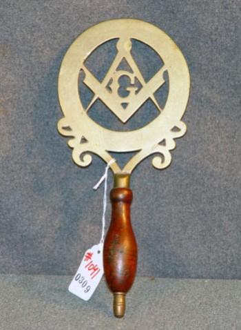 WOODEN HANDLED BRASS MASONIC TRIVET