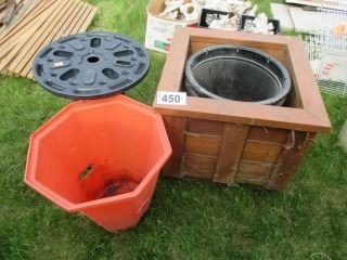WOODEN PLANTER, CONTAINERS & PLASTIC CABLE ROLL