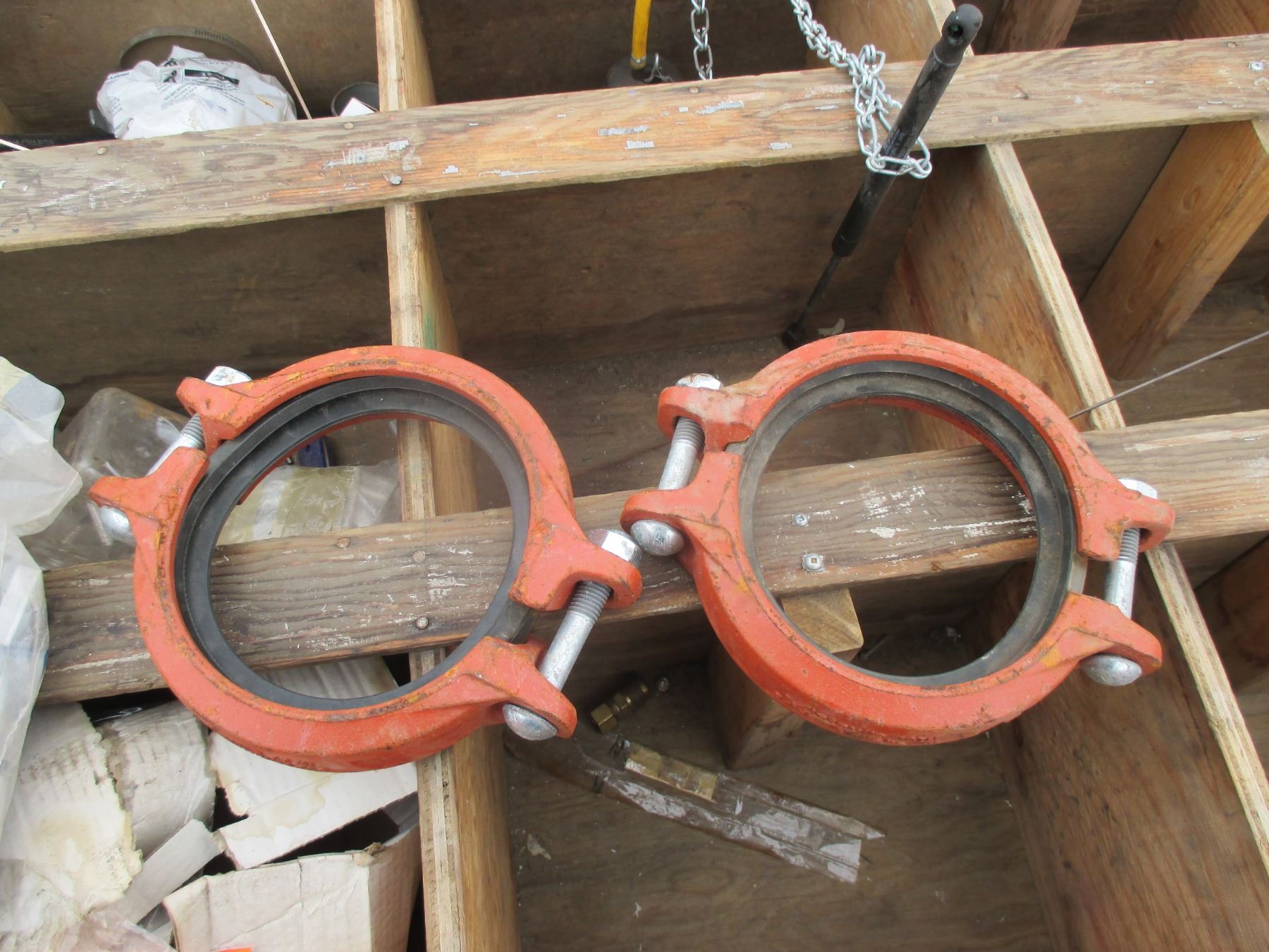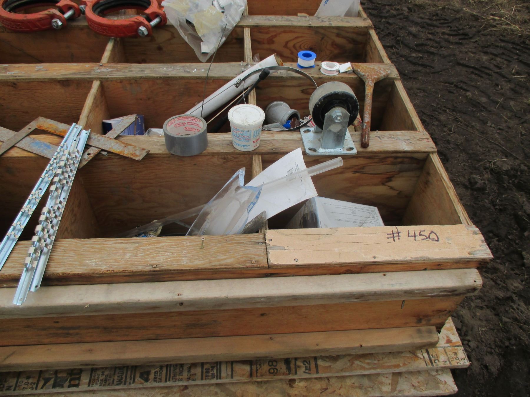 WOODEN STORAGE CABINET C/W GAUGES, SQUARE, PIPE, FITTINGS, CLAMPS, CHISELS, PLYWOOD & 2 X 4'S