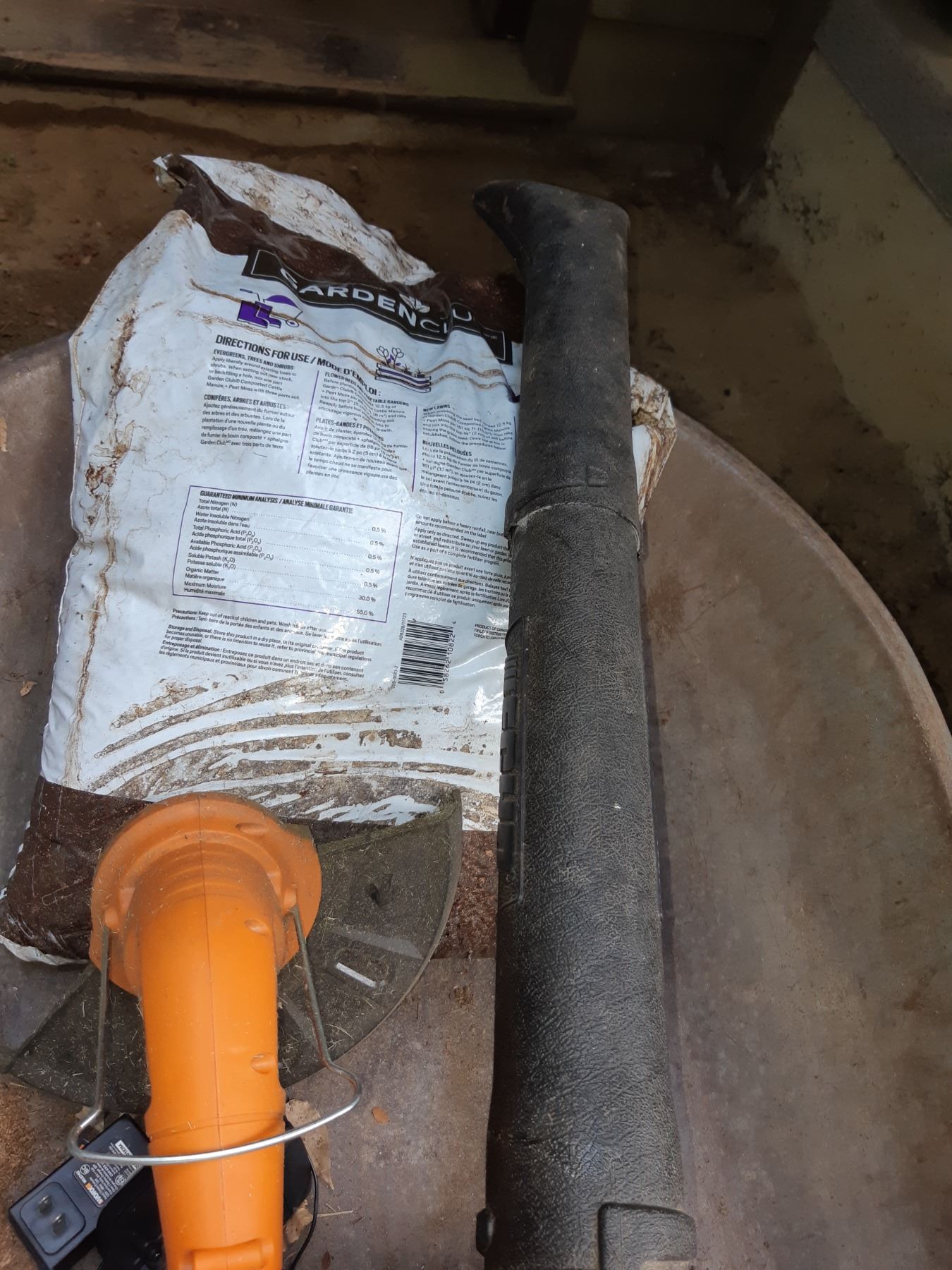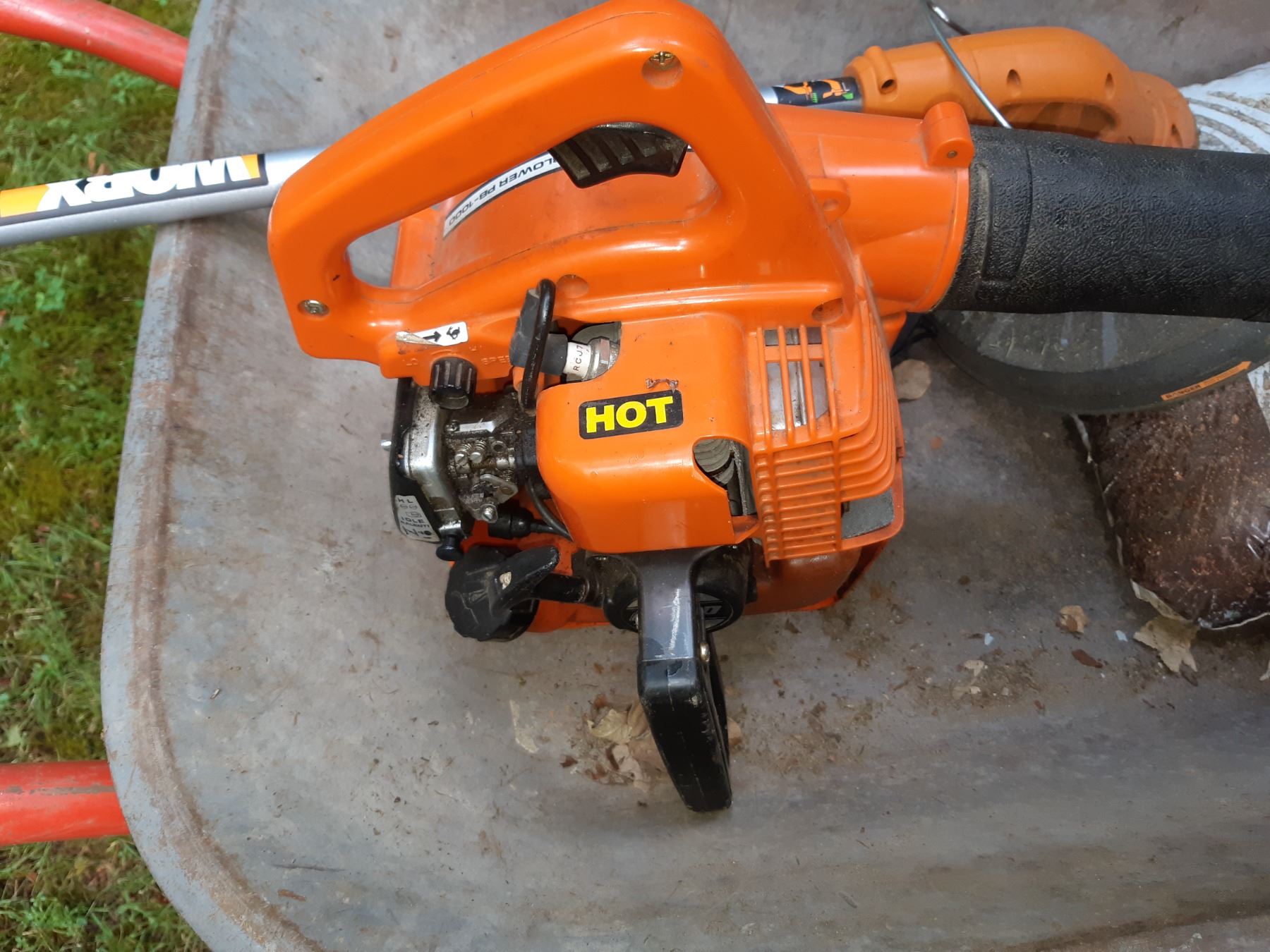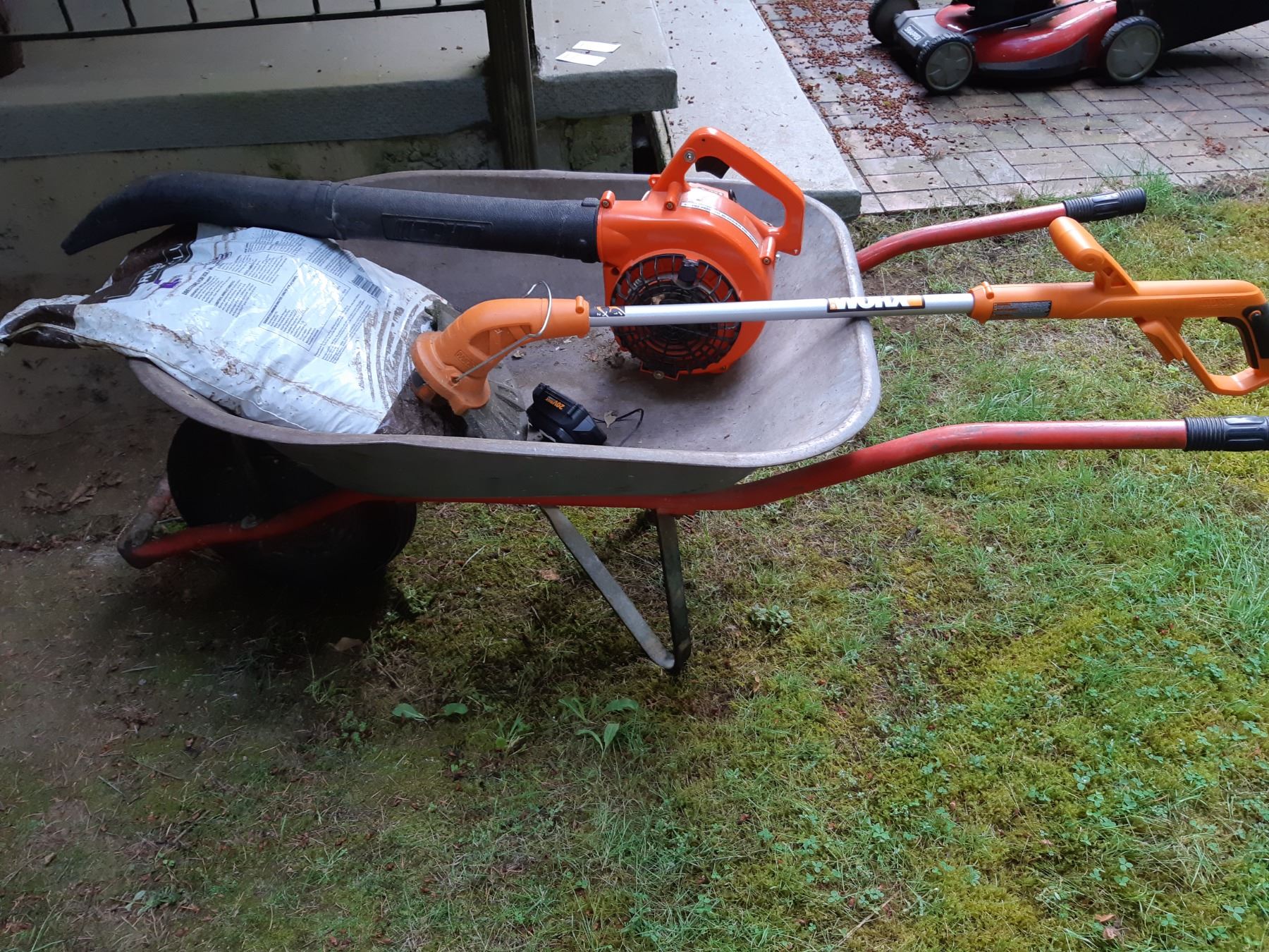 Worx weewacker WG154, Echo leaf blower, untested. bag of soil and wheel barrow. Pickup at 12:30 pm