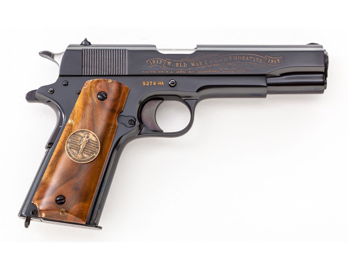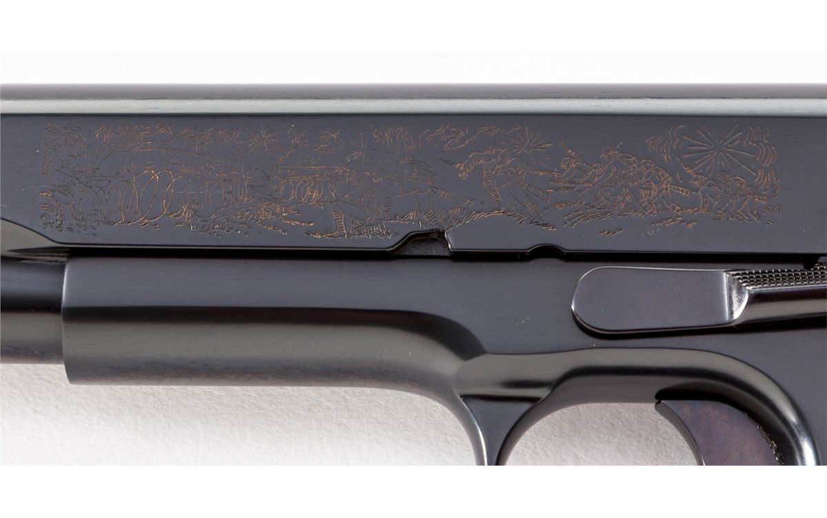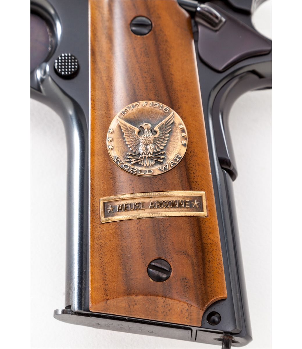 WWI Colt Government Model, Meuse Argonne, #5874-MA, .45 cal., 5'' barrel, royal blue finish with battle scene roll engraved, smooth walnut grips with WWI medallions. Produced in the late 1960s near the 50th anniversary of WWI. Condition is excellent, appearing new and unfired, with three small nicks to right grip panel (which do not show in display), in original display case. Est.: $1,000-$1,500. (Modern)