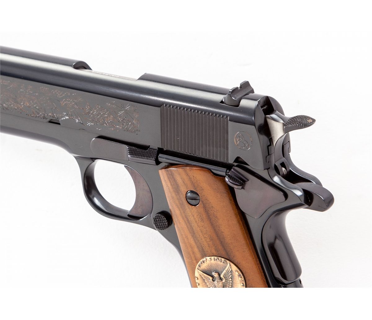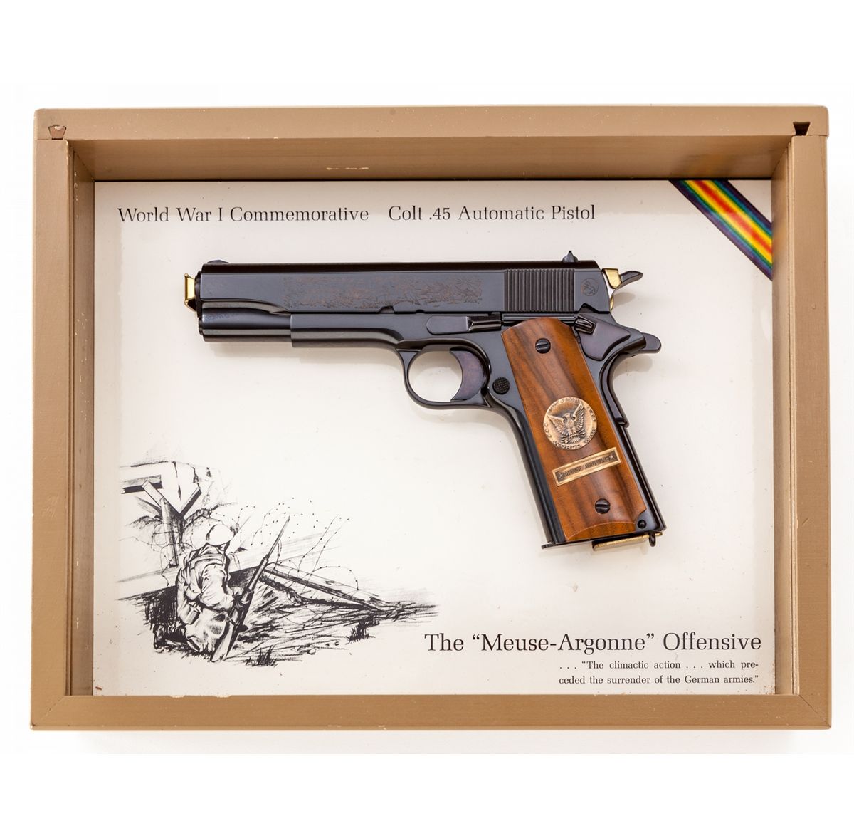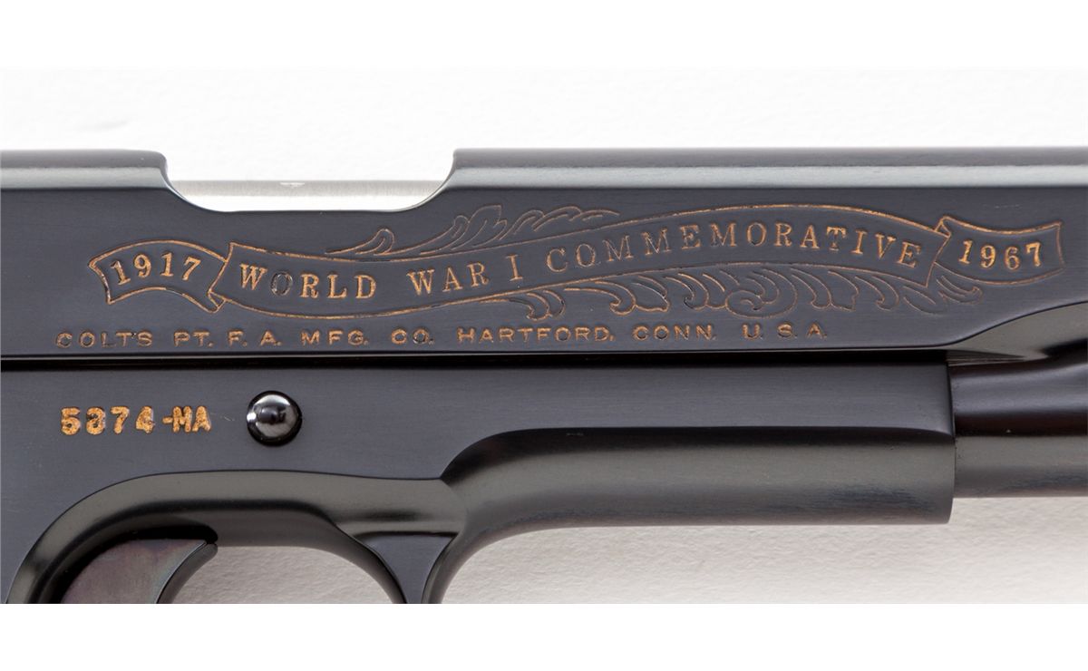 WWI Colt Government Model, Meuse Argonne, #5874-MA, .45 cal., 5'' barrel, royal blue finish with battle scene roll engraved, smooth walnut grips with WWI medallions. Produced in the late 1960s near the 50th anniversary of WWI. Condition is excellent, appearing new and unfired, with three small nicks to right grip panel (which do not show in display), in original display case. Est.: $1,000-$1,500. (Modern)