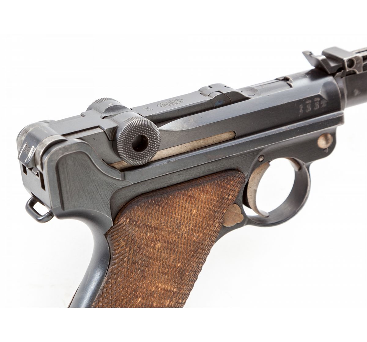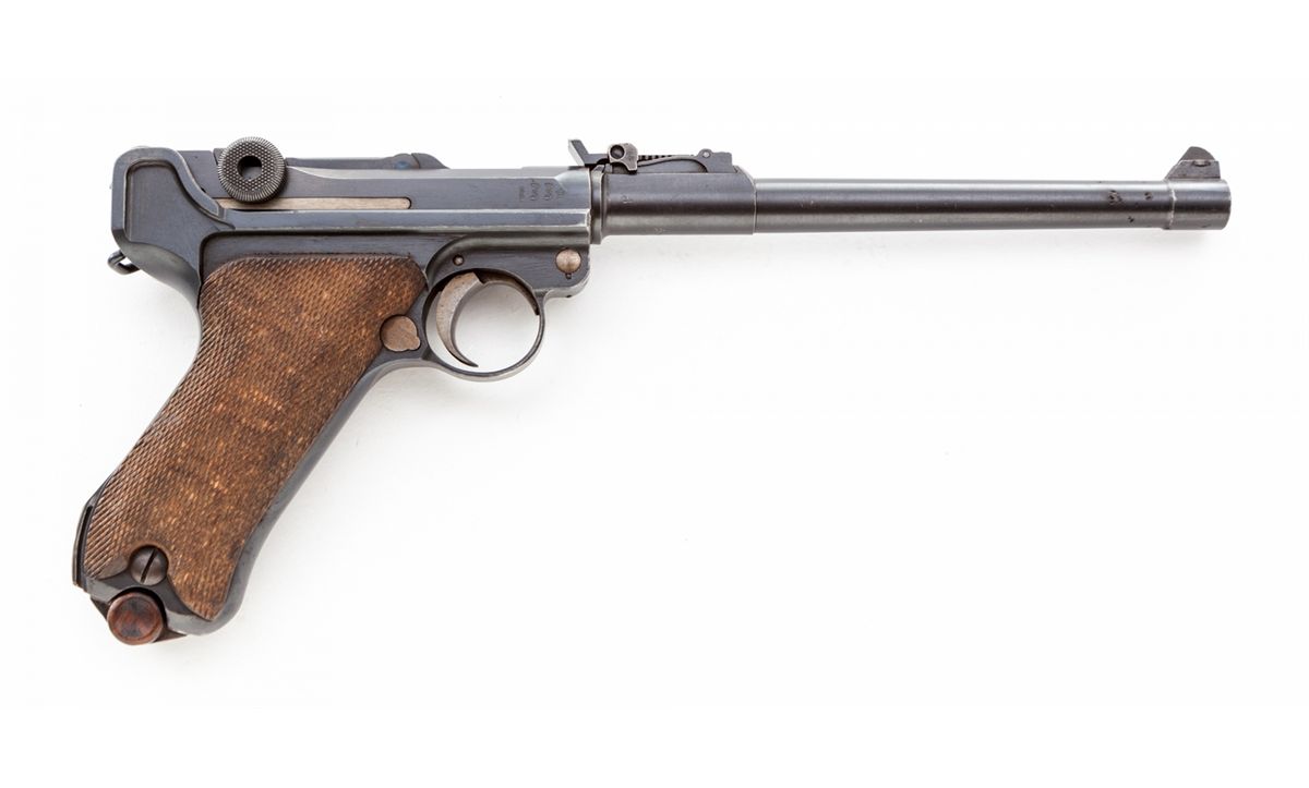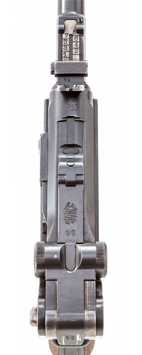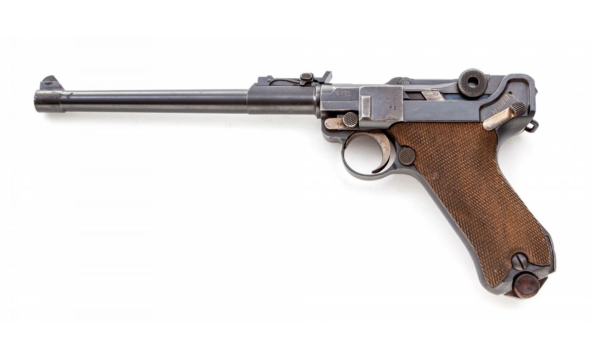 WWI Era German Artillery Luger Semi-Automatic Pistol, by DWM, #5572l, 9mm, 8'' barrel, blue finish with straw-colored small parts, checkered walnut grips, with non-matching wood-based nickel-plated magazine. Safety marked ''Geischert'', extractor marked ''Geladen'', 1917 over chamber area, DWM to central toggle link, with standard Artillery front and rear sights without fine-tune adjustment screw. Condition is fine to near excellent retaining approx. 95% original early type rust blue, with some moderate pitting near muzzle, thinning to sideplate, and minor wear at high edges. Grips with light to moderate flattening. Action is crisp, bore is mirror bright. Est.: $2,000-$3,000. (C&R)