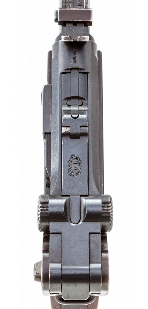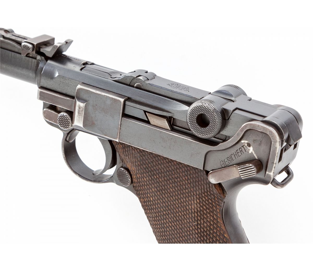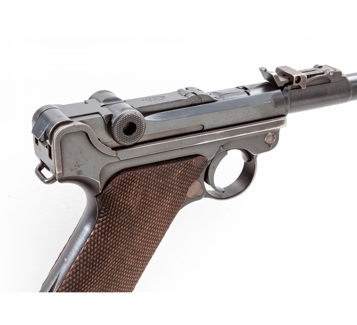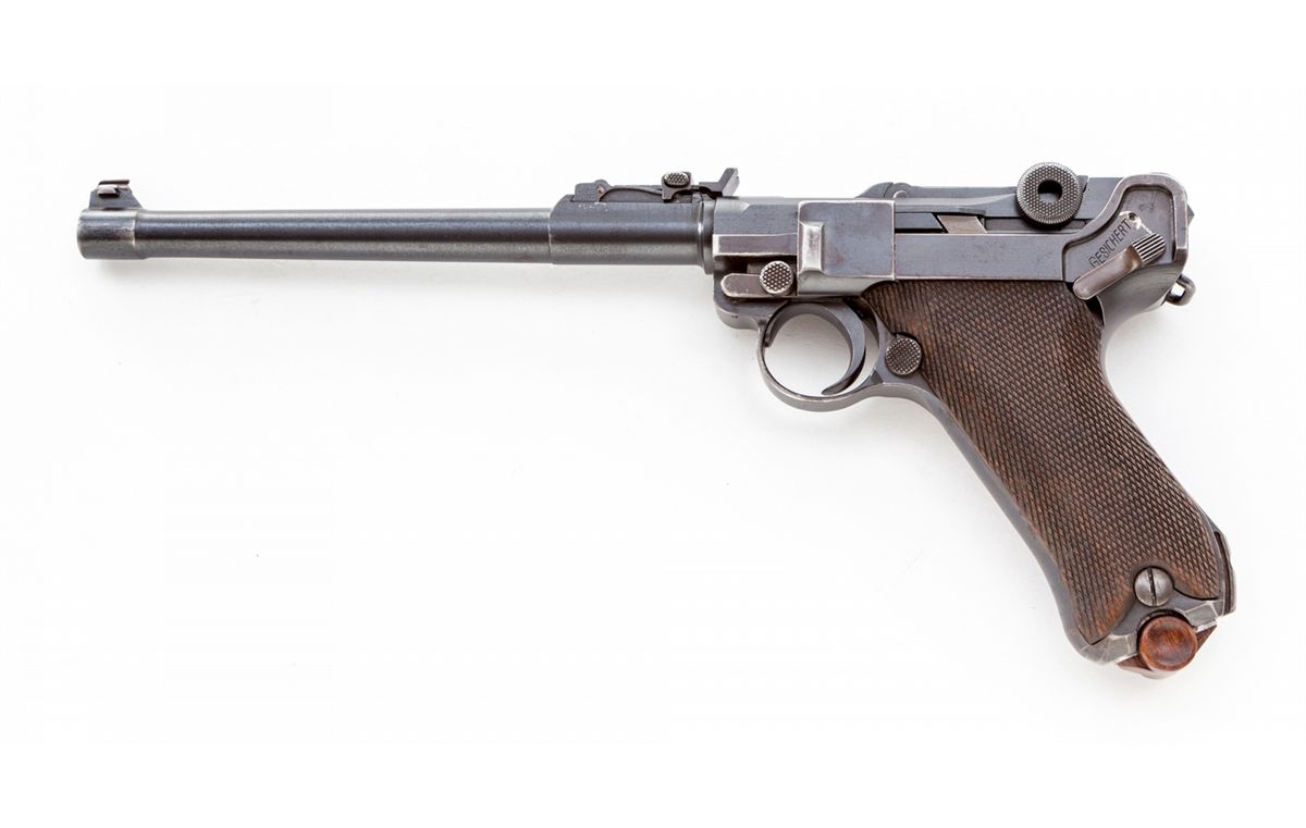 WWI Era German Artillery Luger Semi-Automatic Pistol with commercial markings, by DWM, NVSN, 9mm, 8'' barrel, blue finish with straw-colored small parts, checkered walnut grips, with wood-based nickel-plated magazine. Safety marked ''Geischert'', extractor marked ''Geladen'', ''Germany'' over chamber area and at base of magazine, DWM to central toggle link, with standard Artillery rear and brass bead front sights without fine-tune adjustment screw. Condition is fine to near excellent retaining approx. 95% early type rust blue, thinning to sideplate, and minor wear at high edges. Grips with light to moderate flattening and small loss beneath axle pin of thumb safety. Action is crisp, bore is fine. Est.: $2,000-$3,000. (C&R)