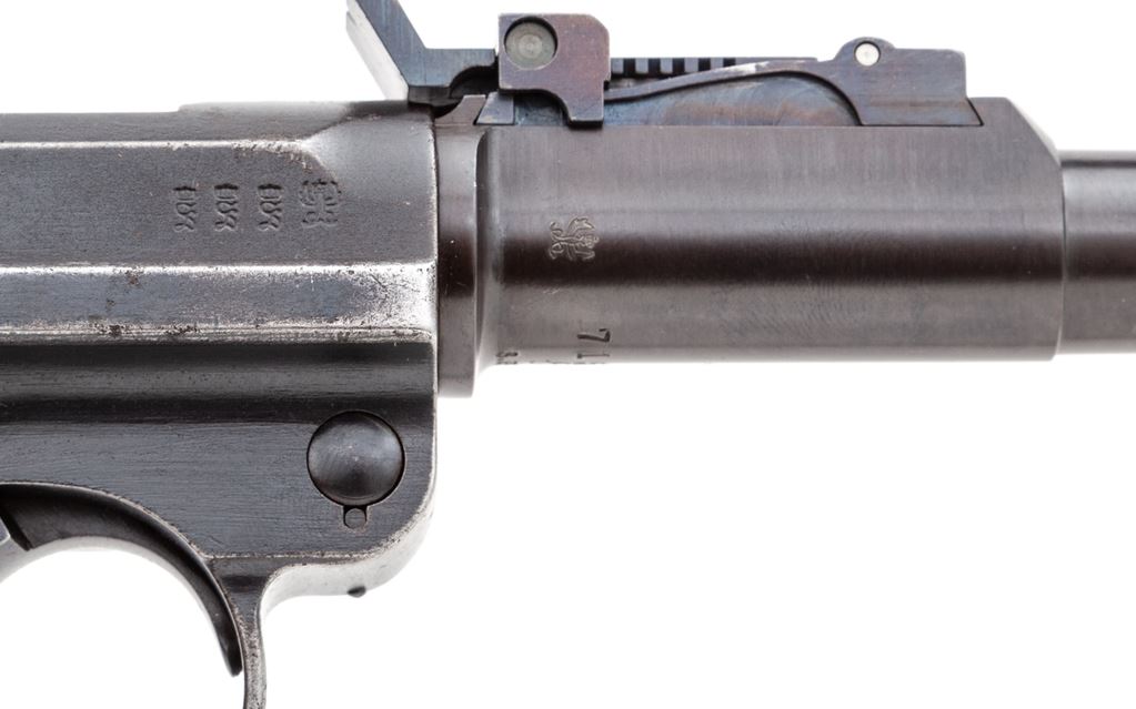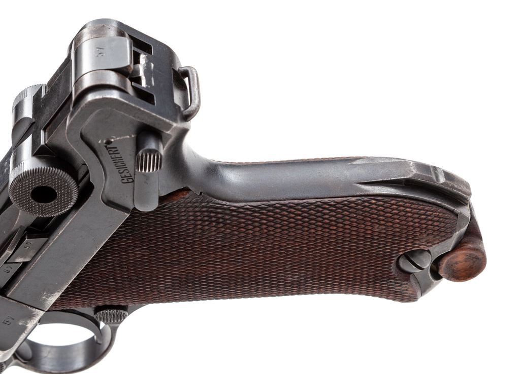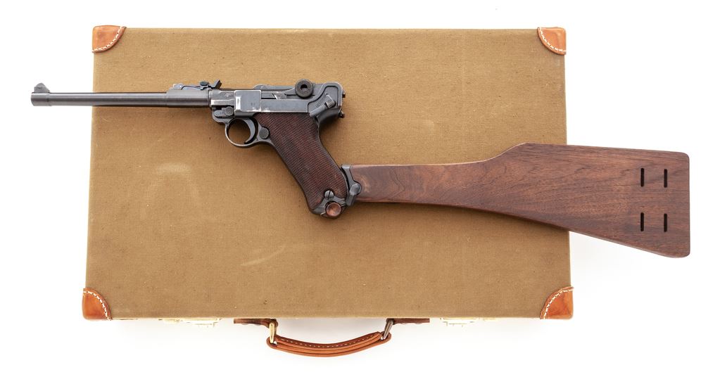 WWI Model 1914 Artillery Luger, by DWM, #7157b, 9mm, 8'' barrel, blue finish, checkered walnut grips, with one WWI era tin-plated unmarked magazine. Chamber area dated 1915, DWM marked toggle, Geischert/Geladen thumb safety and extractor. Pistol includes one reproduction shoulder stock, cartridge block, and two magazines (a modern MEC-GAR and a WWII era blue-bodied with pinned aluminum base example). In modern khaki covered canvas case. Condition of pistol is very good having been refinished at one point, as components that were originally straw finished are now blue and present finish is more of the immersion type. Barrel appears to be of new mfg. and accurately marked to match. Grips with crisp checkering and small loss to left panel just below thumb safety. Good action, mirror bright bore. Est.: $1,500-$2,000. (C&R/PPT)