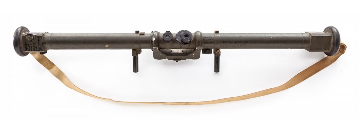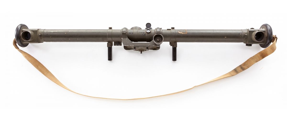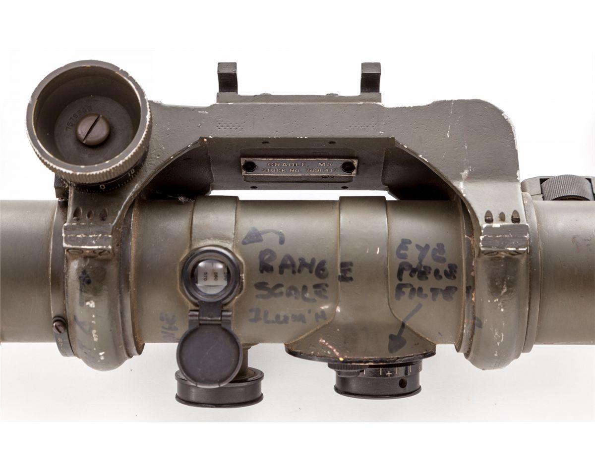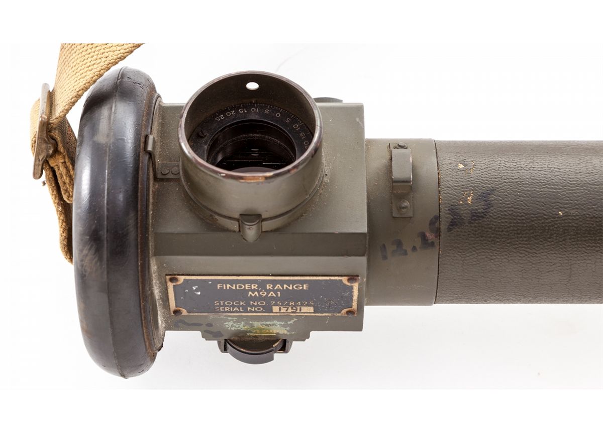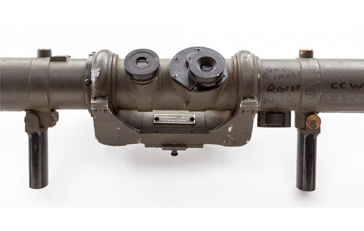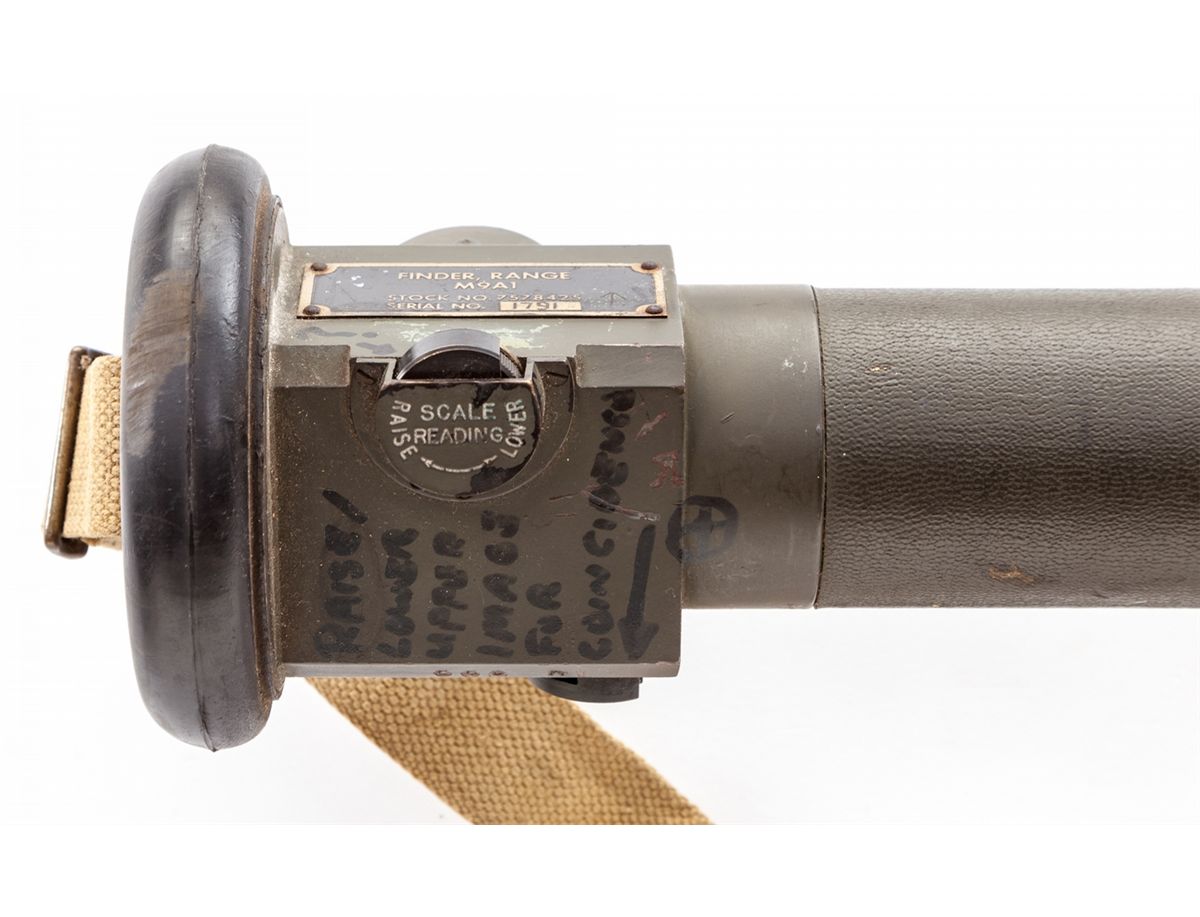 WWII Era Canadian M9-A1 Optical Rangefinder, #1791, with M3 cradle, good for ranges from 500 to 20,000 yards, measuring approx. 44'' long with a dia. of 2-1/4''. All dials and optics are intact. With additional writing, which can easily be removed, identifying all instructions and scales. Used in a myriad of applications from artillery, armor, and individual mortar squad uses. Condition is excellent, in good working order, with some paint loss. Shoulder strap is present. Est.: $500-$750.