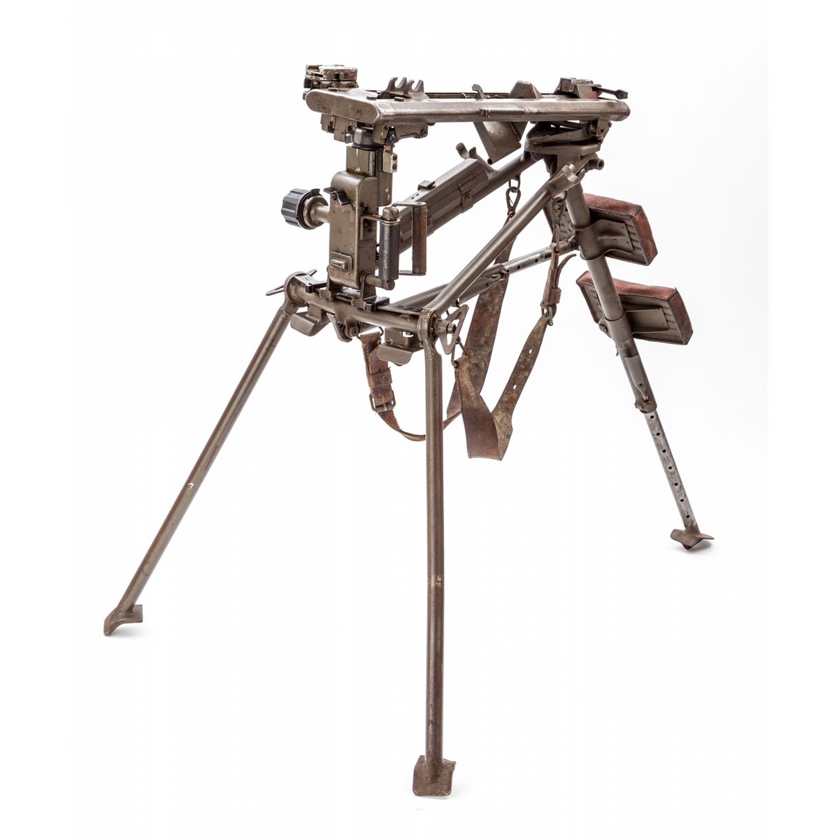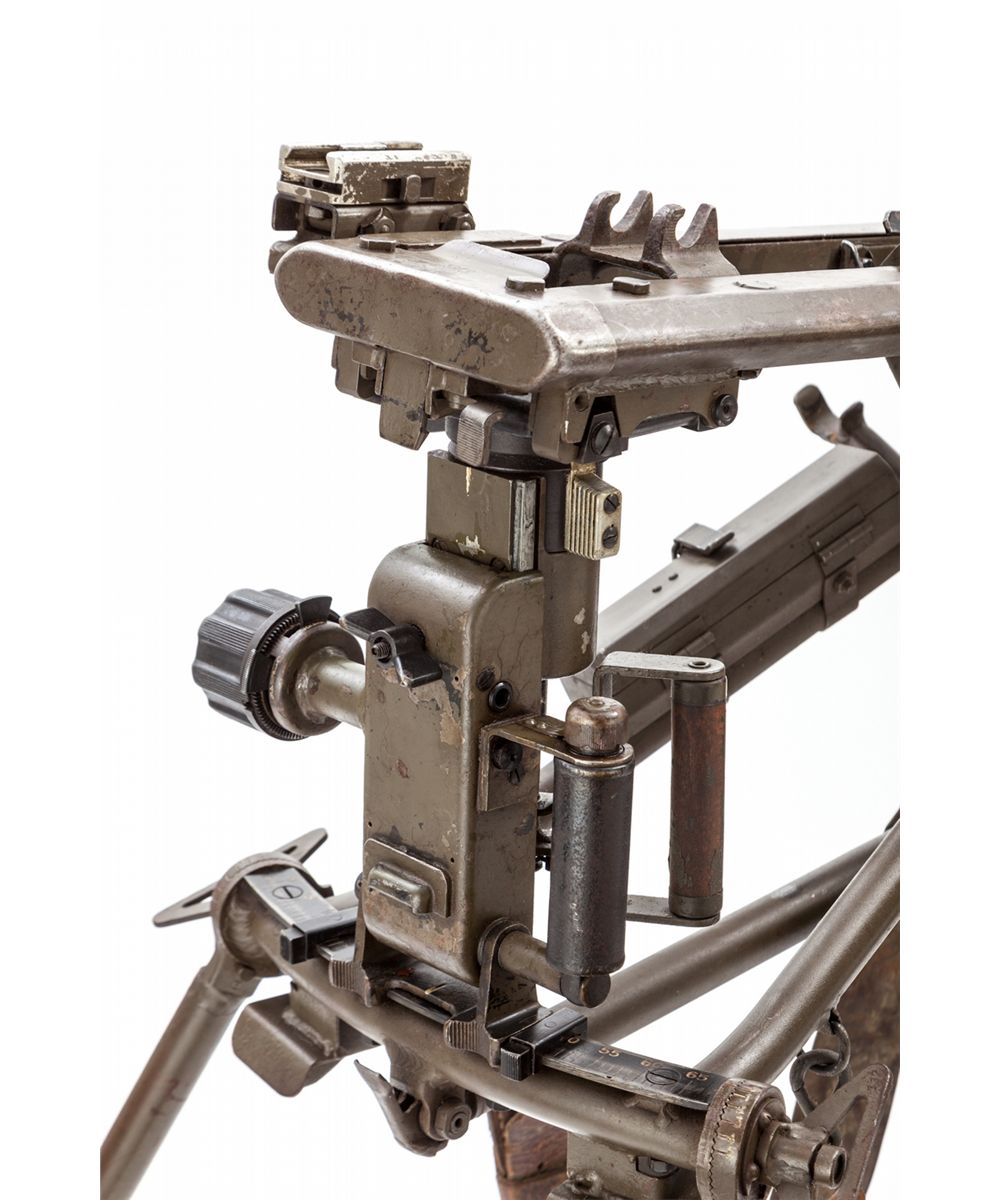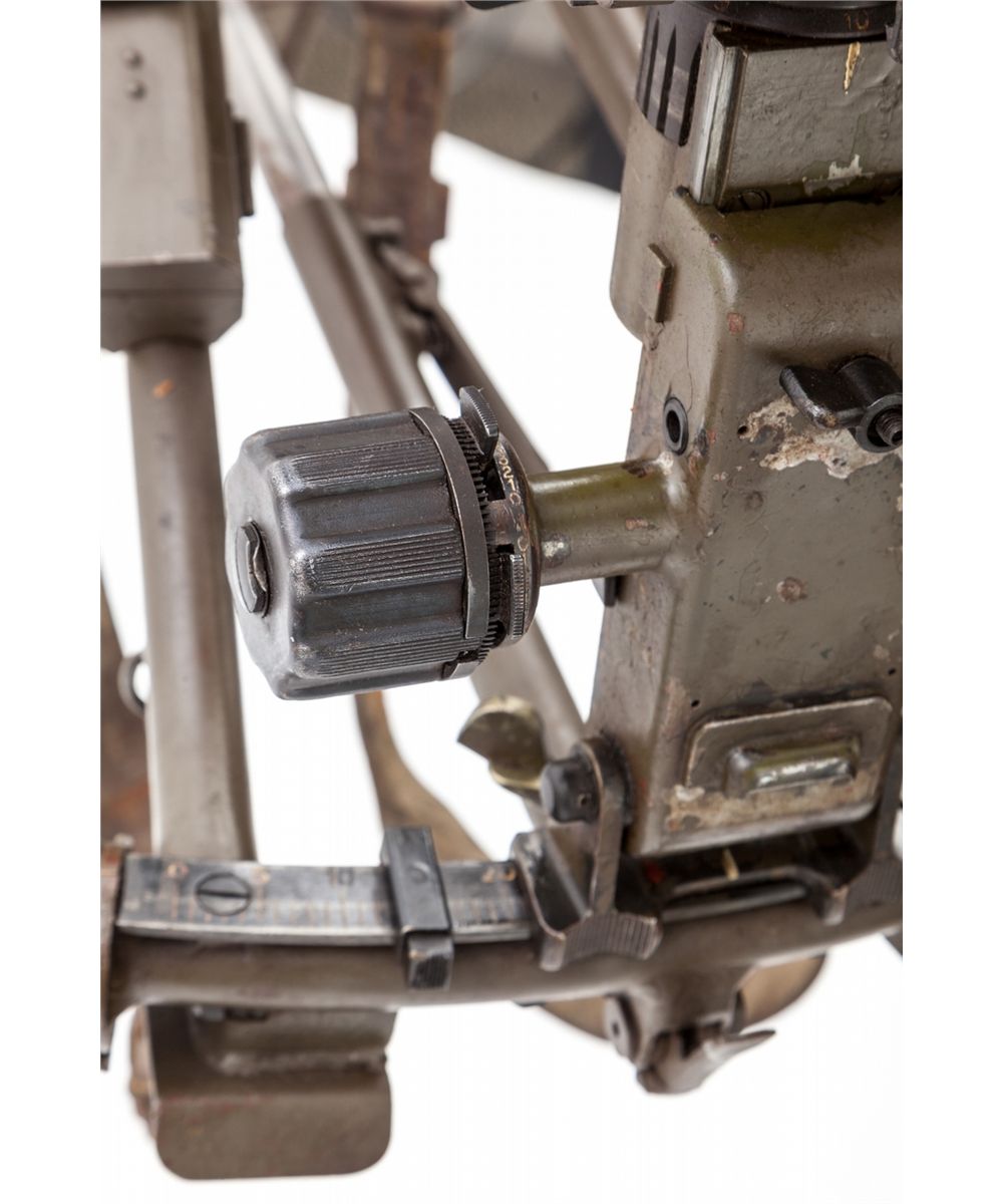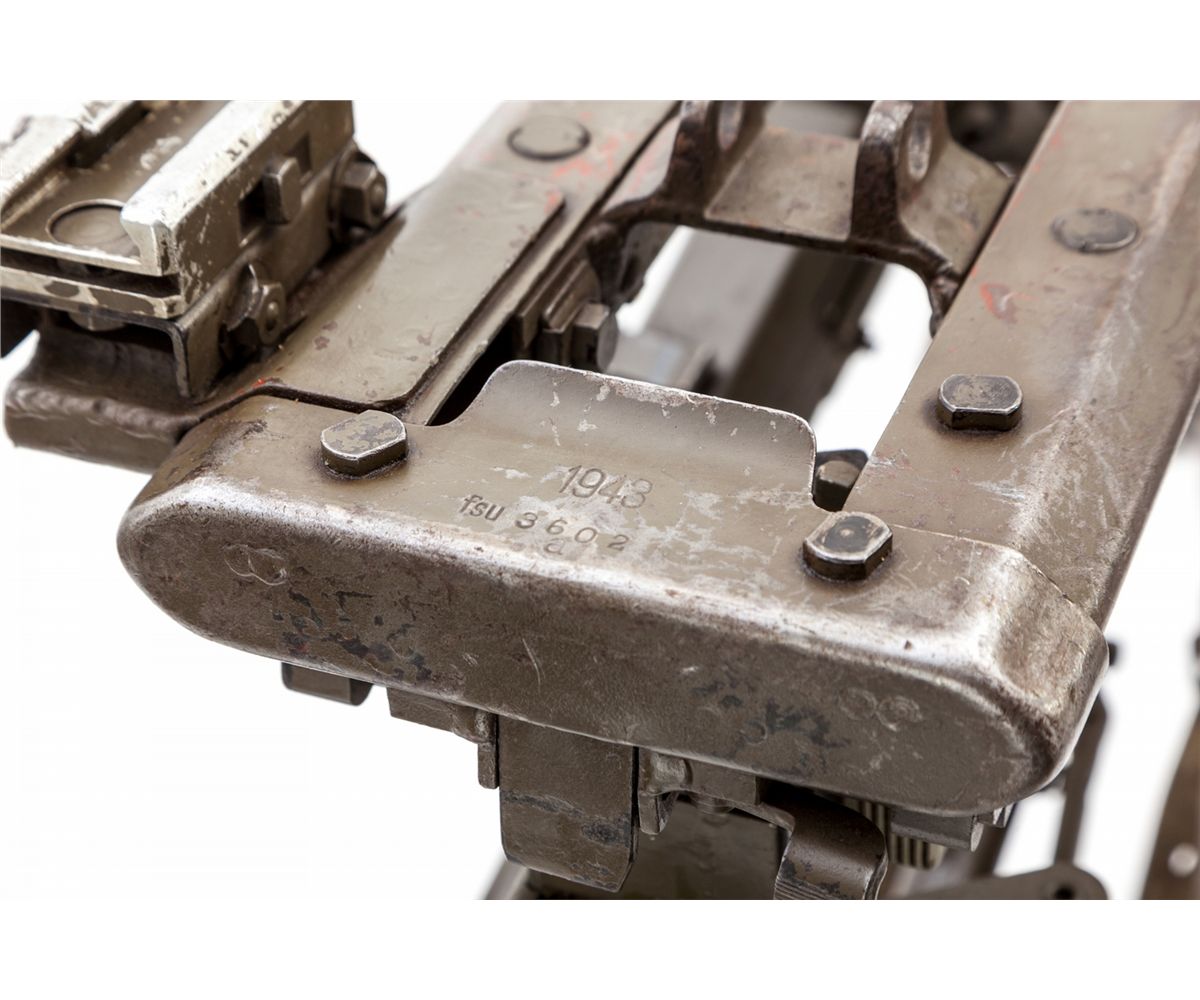 WWII German Mg-42 Mount, ''fsu'' coded, #3602a, dated 1943, with black adjustment scales, olive green body, and brown leather pads. Condition is excellent as possibly arsenal refurbished at one point. Leather pads show stains and impressions but no tears or losses. Faint Waffenampts are visible to left of serial number. Est.: $1,000-$1,500.