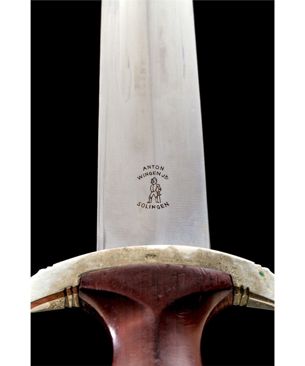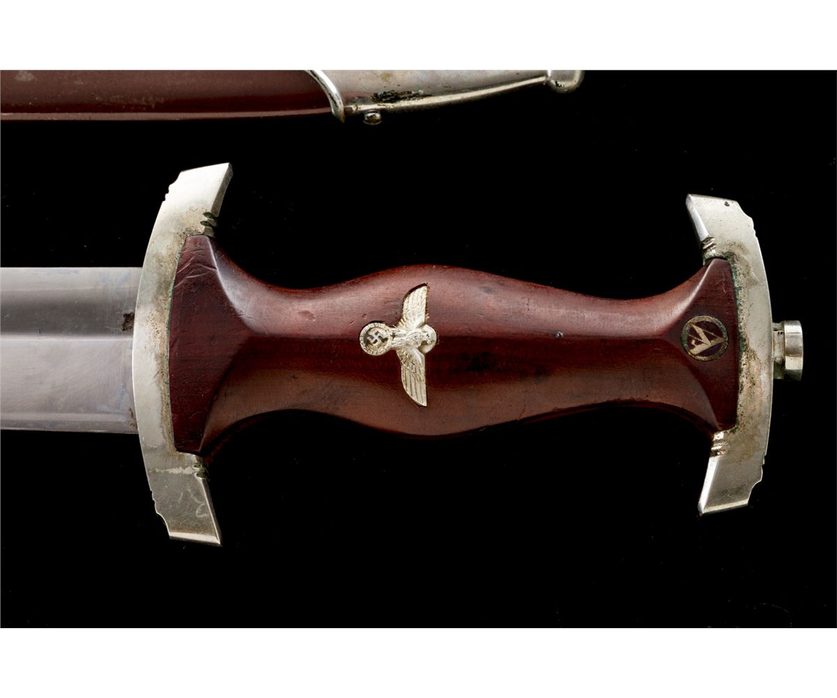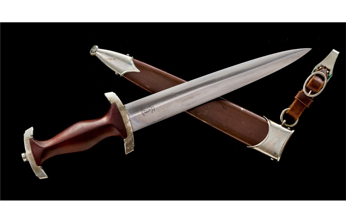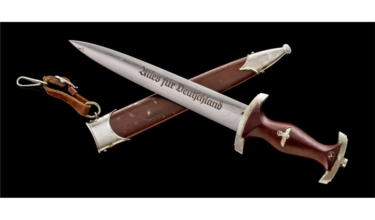 WWII German SA Dagger, by Anton Wingen Jr., with Knight in Armor logo, 8-5/8'' double edged blade marked ''Alles fur Deutschland'', and ''He'' marked crossguard, with walnut grip. In brown painted scabbard with nickel-plated chafe and throat. Leather hanger and belt hook are also present. Condition is fine as brought back from WWII, with toning to crossguard, handling marks to grip, and runner marks to blade. Light marring to base of retaining nut. Scabbard with thinning to paint, but overall very nice. This knife was consigned by the relatives of O. Frank Wolfe who brought it back from Germany at the end of WWII. Est.: $600-$800.