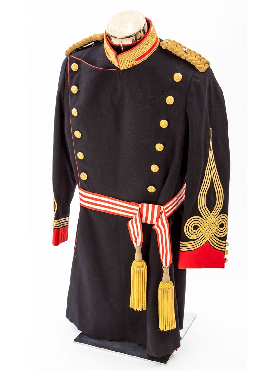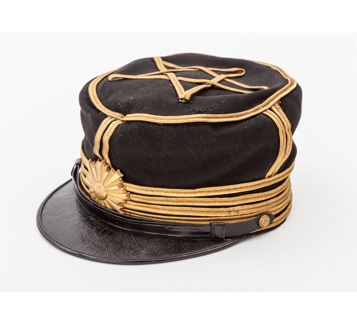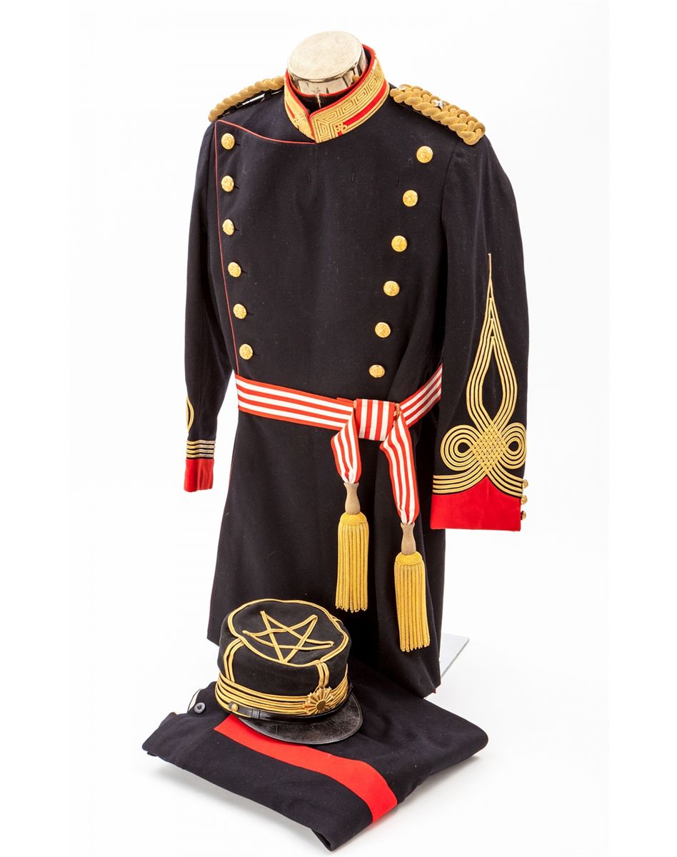 WWII Imperial Japanese Army Major's Double-Breasted Dress Tunic and Pants, with red & white sash, cap, and red-lined japanned tin hat box. Tunic features 13 nicely marked gilt buttons with five-petal cherryblossom design, red piping, gold bullion epaulets, collar, and Major rank to sleeve. Finely made wool pants with red stripes. Gold brocade black cap with tarred visor, with silk liner marked ''Yoshimura''. Condition to all is excellent. Hat with one small repair at top. Top hanger to lid of hat box is missing. Est.: $800-$1,200.
