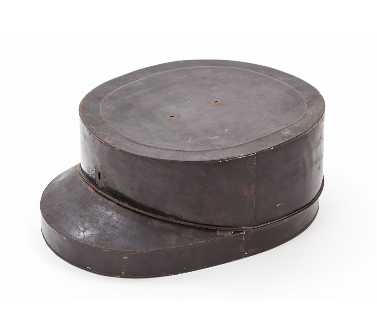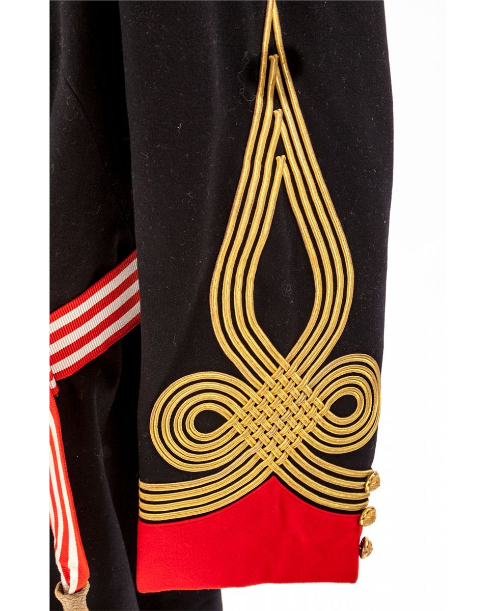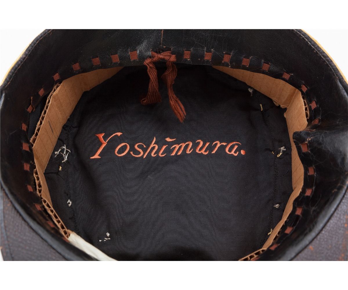 WWII Imperial Japanese Army Major's Double-Breasted Dress Tunic and Pants, with red & white sash, cap, and red-lined japanned tin hat box. Tunic features 13 nicely marked gilt buttons with five-petal cherryblossom design, red piping, gold bullion epaulets, collar, and Major rank to sleeve. Finely made wool pants with red stripes. Gold brocade black cap with tarred visor, with silk liner marked ''Yoshimura''. Condition to all is excellent. Hat with one small repair at top. Top hanger to lid of hat box is missing. Est.: $800-$1,200.