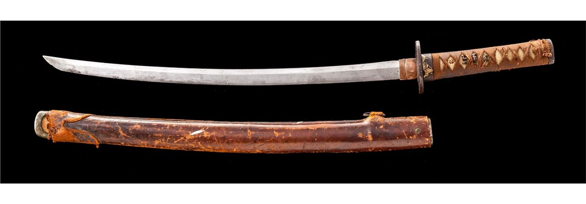 WWII Japanese Short Sword, with old family hand-forged 20-1/2'' blade, with signed tang and carved mum. Old samurai handle with iron and gold fittings and plain iron tsuba. In wooden scabbard with leather combat field cover. Blade dates to Shinto period, ca. 1650. Condition is very good to near fine with light general spotting to blade and moderate toning to iron components. Wrap with light oil staining and minor fraying. Combat cover to scabbard is missing tip, with general scuffing and small marks of white paint. Est.: $1,200-$1,800.