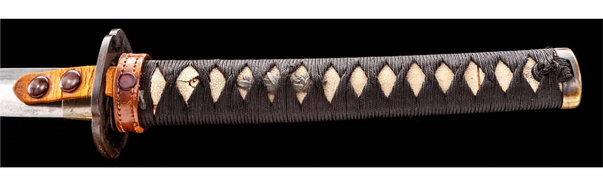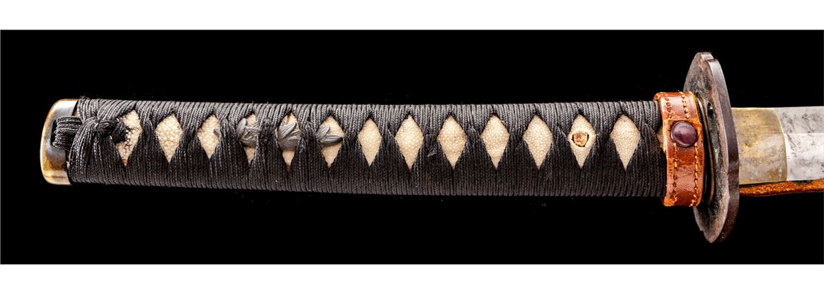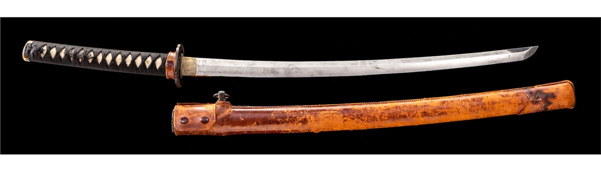 WWII Japanese Sword, 22-1/2'' oil-tempered blade, signed tang with arsenal stamp, with civilian style handle and bamboo leaves menuki. In lacquered scabbard with leather combat field cover. Condition is fine with light toning as minor corrosion to blade. Nice black wrap over skateskin with minor tear near peg hole. Leather cover to scabbard with loss of stitching near throat, and moderate to heavy scuffing at mid- to lower section. Est.: $750-$1,000.