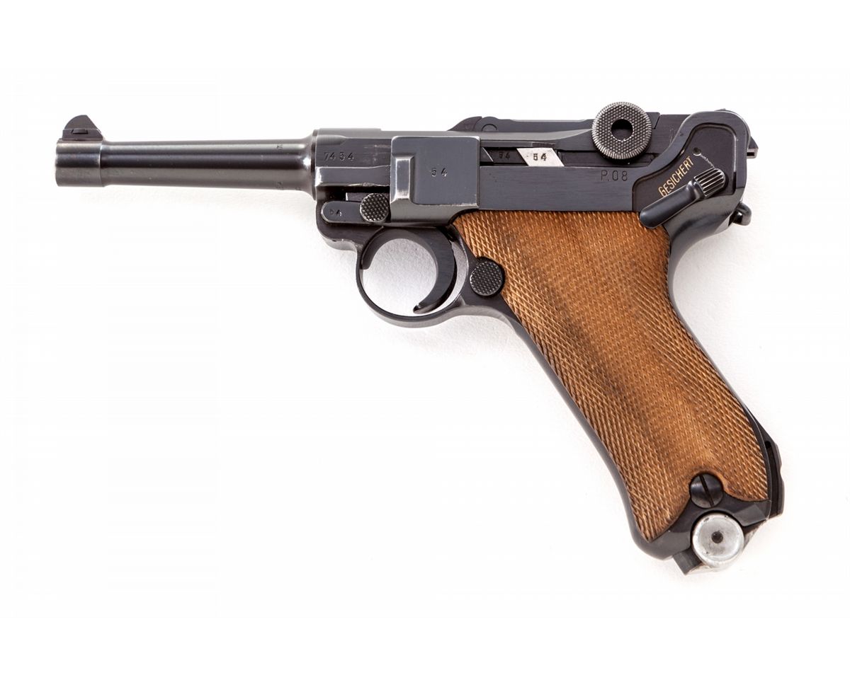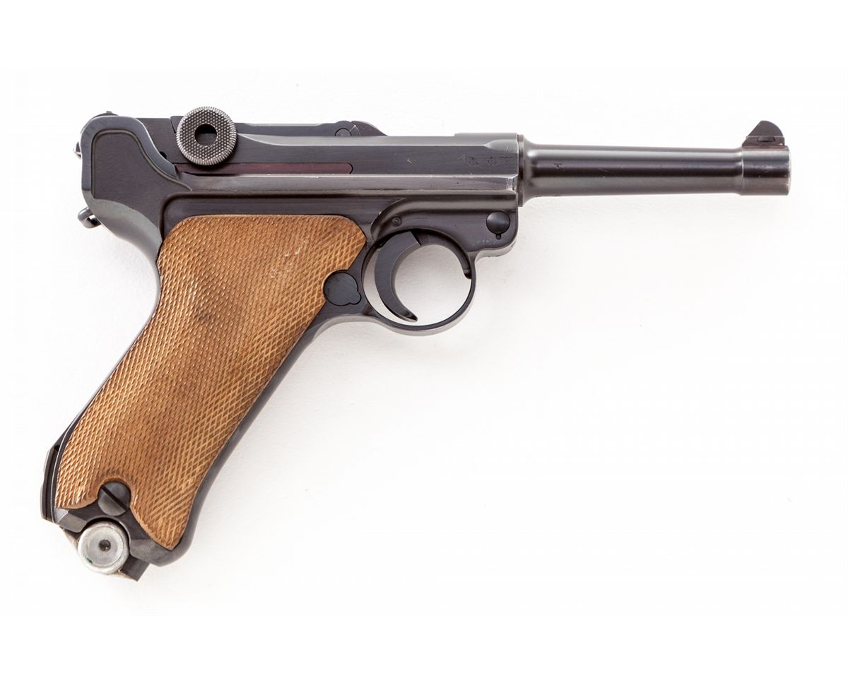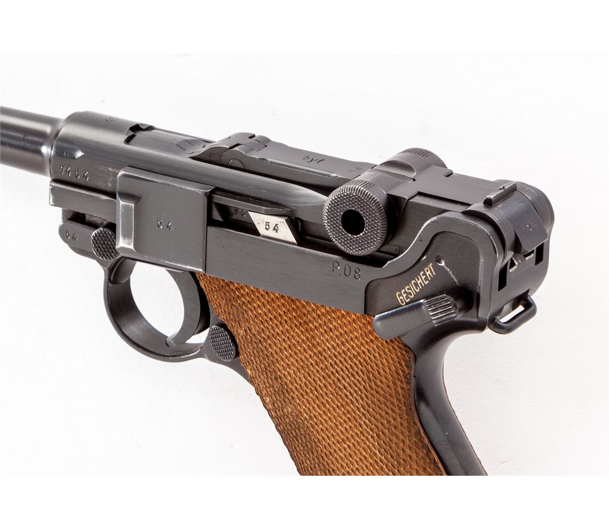 WWII P.08 Luger Semi-Automatic Pistol (byf/41), with holster, tool and extra mag, #7454a, 9mm, 4'' barrel, blue finish, factory checkered walnut grips, with one unmarked magazine and one mismatched blue-bodied aluminum based magazine. Chamber marked ''41'', toggle marked ''byf'', thumb safety marked ''Gesichert'', extractor marked ''Geladen'', with late '41 ''(stick eagle)/135'' waffenampt. Dark brown P.08 holster is marked ''fuq 1941''. Combination tool with correct ''135'' waffenampt. This variation is considered much more scarce than the ''eagle/655'' marked examples in that only 19,000 were produced, as opposed to the 126,000 of the former. Condition is excellent showing just the slightest edgewear and thinning to the lower high edge of sideplate. All visible matching serial numbers. Grips are crisp with just light discoloration from handling. Action is tight, bore is excellent. Holster with crisp markings and mostly bright stitching; outer body shows little wear. Est.: $2,500-$3,500. (C&R)