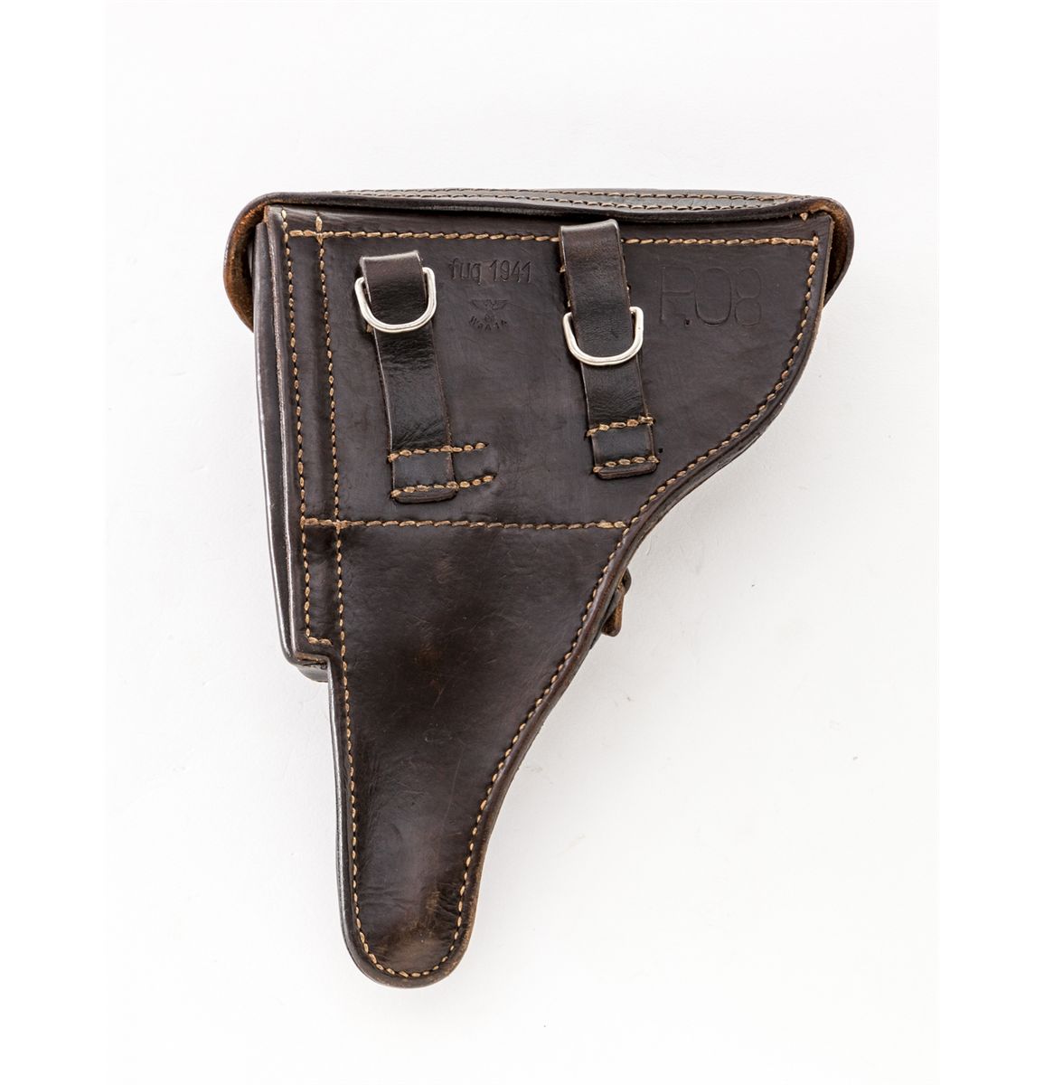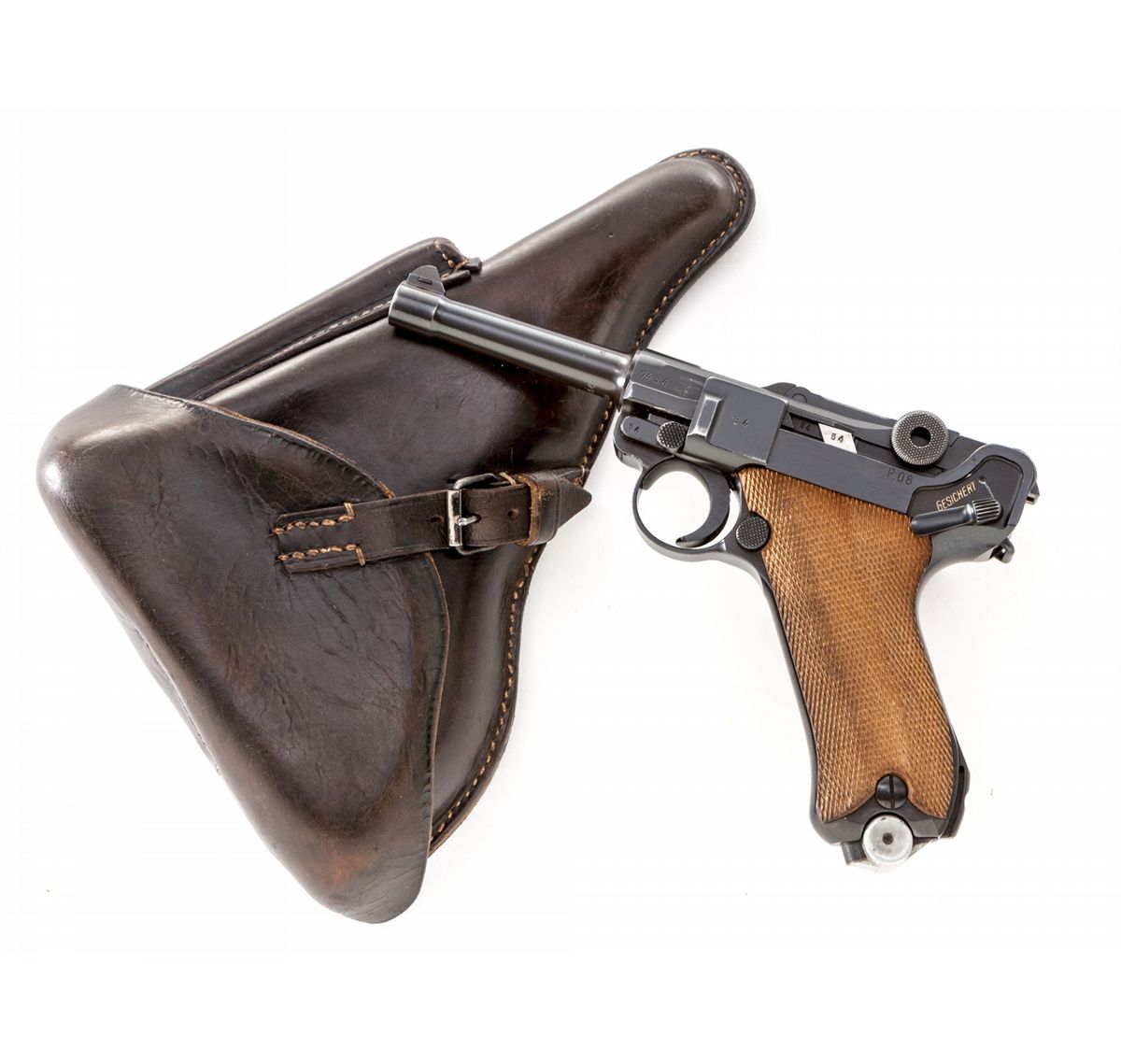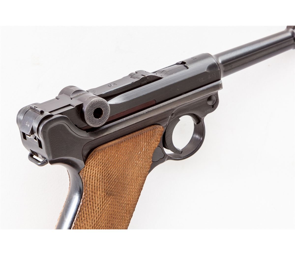 WWII P.08 Luger Semi-Automatic Pistol (byf/41), with holster, tool and extra mag, #7454a, 9mm, 4'' barrel, blue finish, factory checkered walnut grips, with one unmarked magazine and one mismatched blue-bodied aluminum based magazine. Chamber marked ''41'', toggle marked ''byf'', thumb safety marked ''Gesichert'', extractor marked ''Geladen'', with late '41 ''(stick eagle)/135'' waffenampt. Dark brown P.08 holster is marked ''fuq 1941''. Combination tool with correct ''135'' waffenampt. This variation is considered much more scarce than the ''eagle/655'' marked examples in that only 19,000 were produced, as opposed to the 126,000 of the former. Condition is excellent showing just the slightest edgewear and thinning to the lower high edge of sideplate. All visible matching serial numbers. Grips are crisp with just light discoloration from handling. Action is tight, bore is excellent. Holster with crisp markings and mostly bright stitching; outer body shows little wear. Est.: $2,500-$3,500. (C&R)