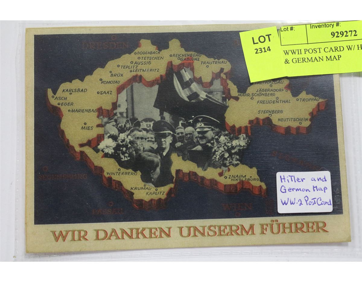 WWII POST CARD W/ HITLERS FACE & GERMAN MAP