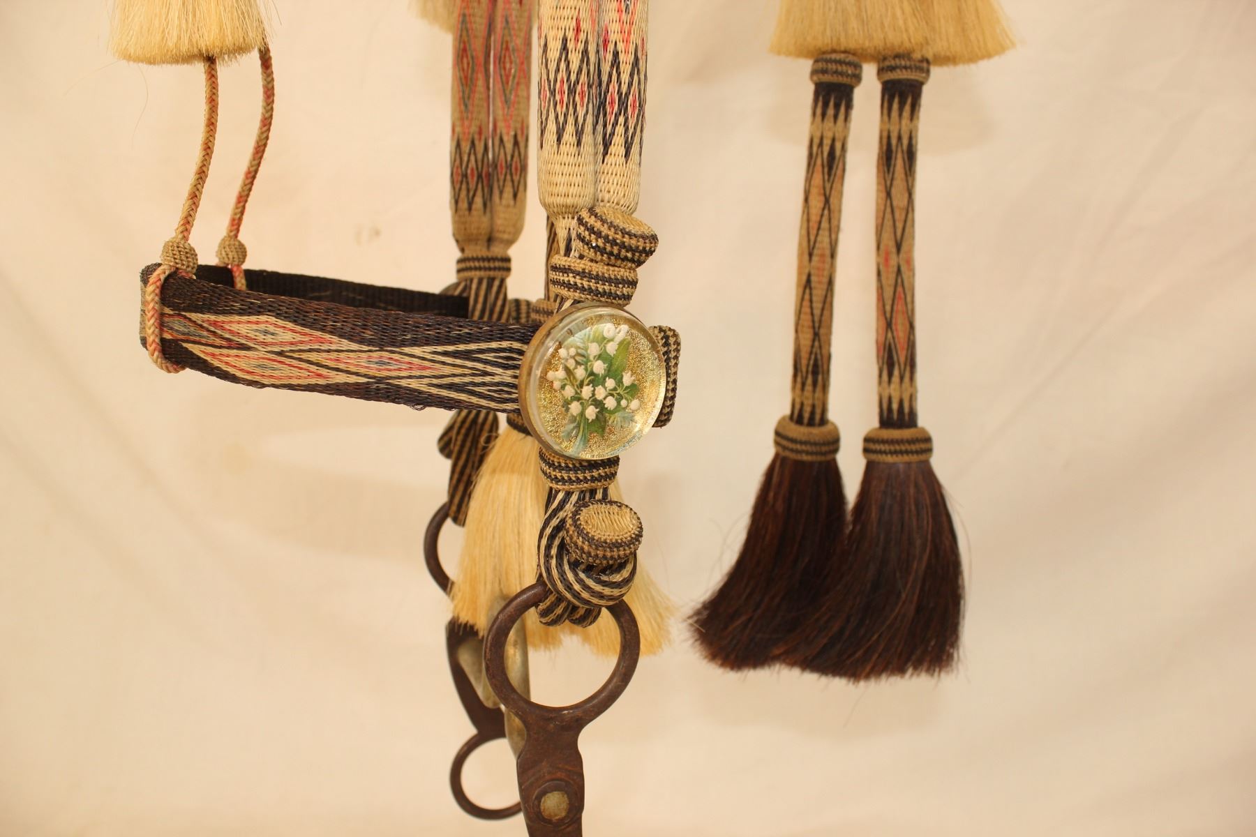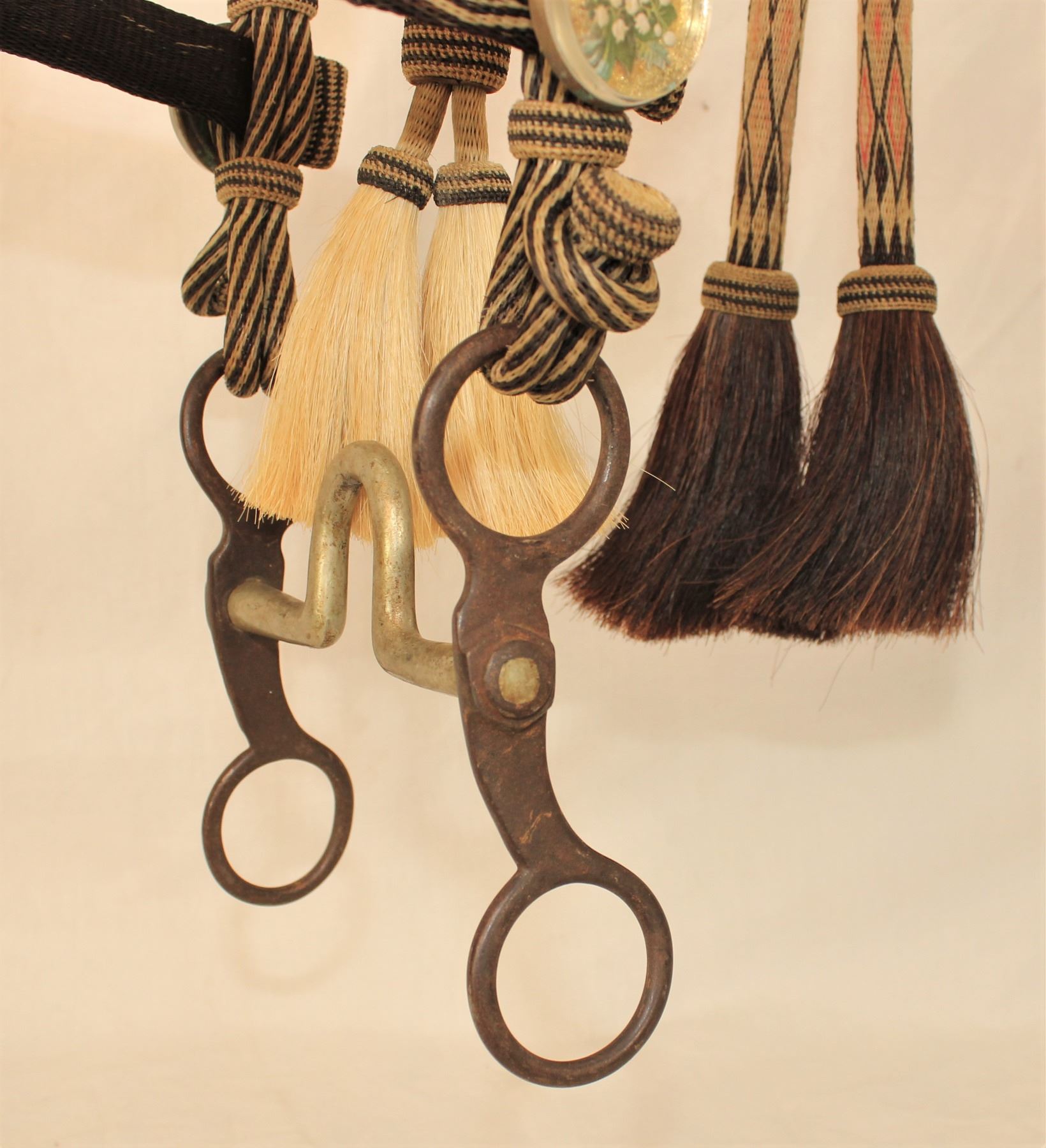Eye dazzling 5 color massive hitched horsehair bridle with bold geometric design of reds and chocolate browns, double round cheekpieces, glass rosettes, with 10 large tassels, heavy multi-tasseled reins, and great iron bit.