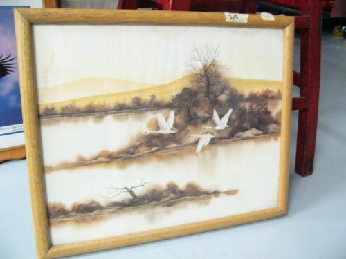 Watercolor of Swans taking flight from lake by F. Massa, some moisture marks, framed(172)