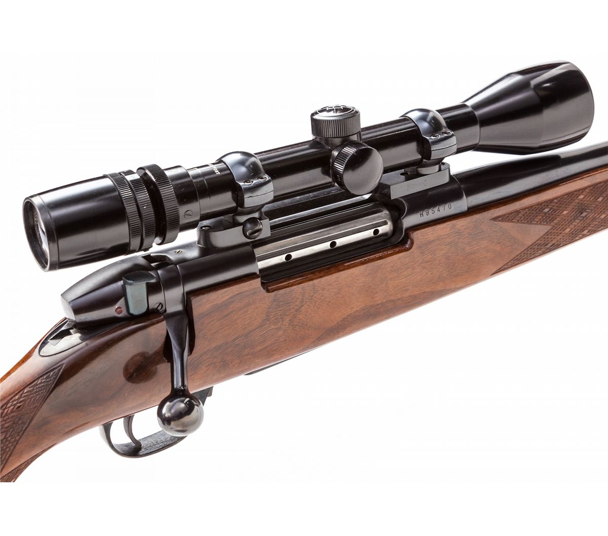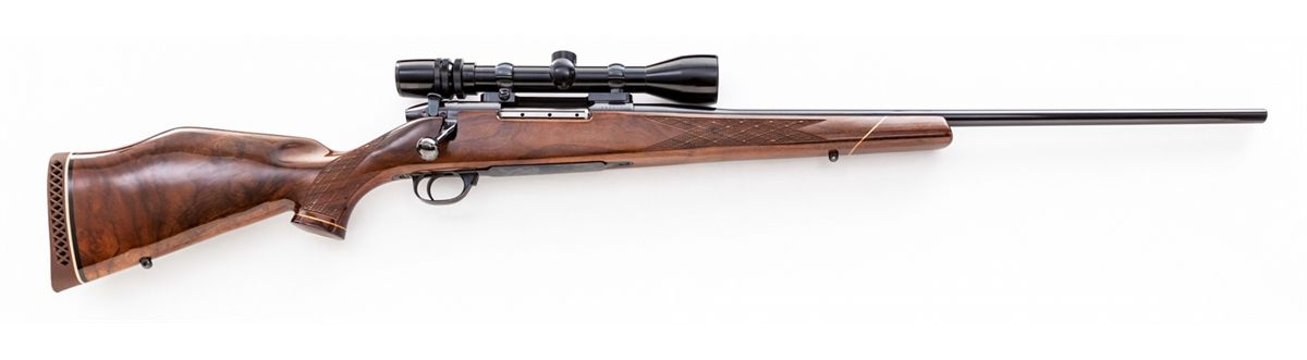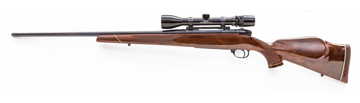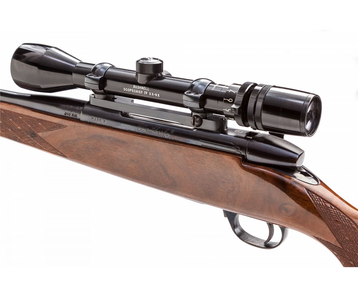 Weatherby MK V Deluxe Bolt Action Rifle, #H95470, .240 Wea. mag. cal., 24'' barrel, blue finish, Monte Carlo skipline checkered pistol-grip stock with rosewood forend and pistol-grip cap, topped with a Bushnell Scope Chief IV scope on Browning mounts. Condition is excellent showing only slight marks from handling and very minor field use. Action is crisp, bore is mirror bright, scope optics are clear. Est.: $1,000-$1,500. (Modern)