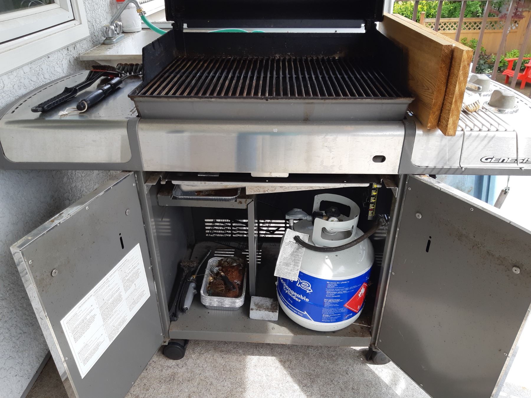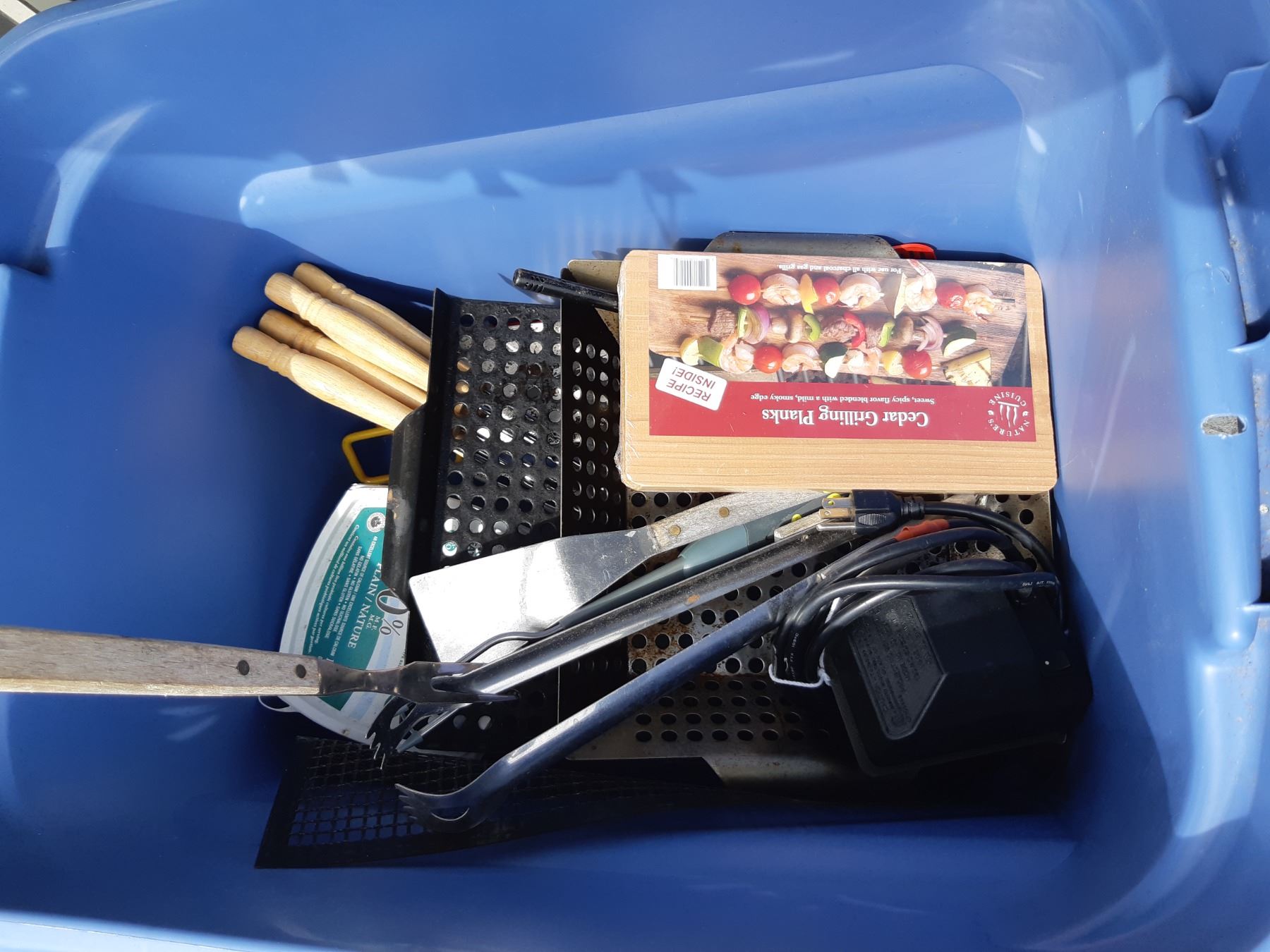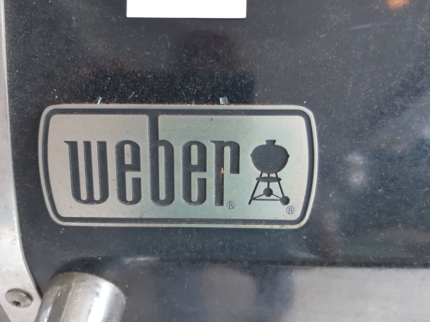 Weber propane barbecue 2 side tables w an assortment of grilling utensils untested. Bring help to remove. Pick up at 11 am.