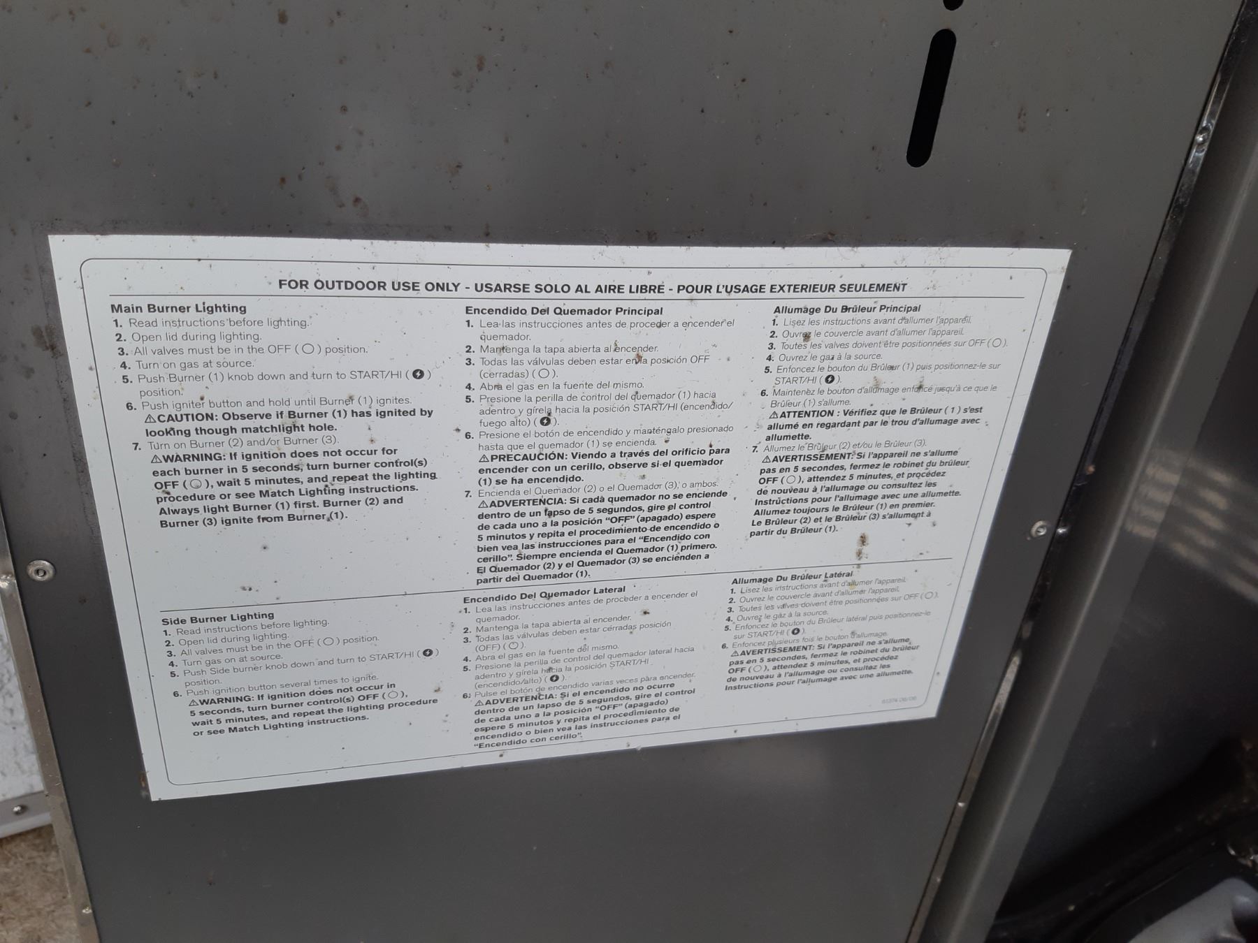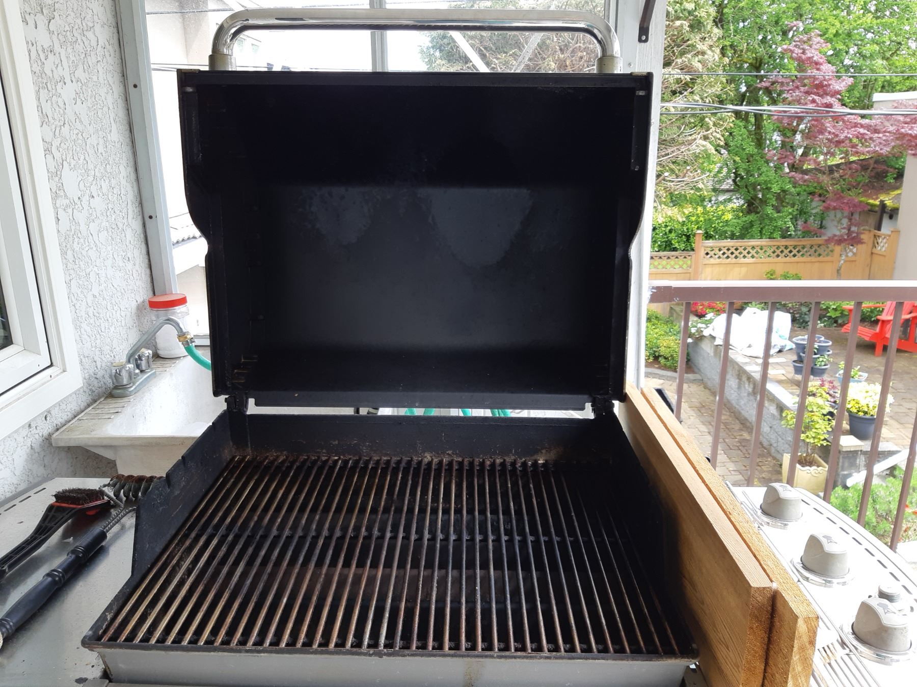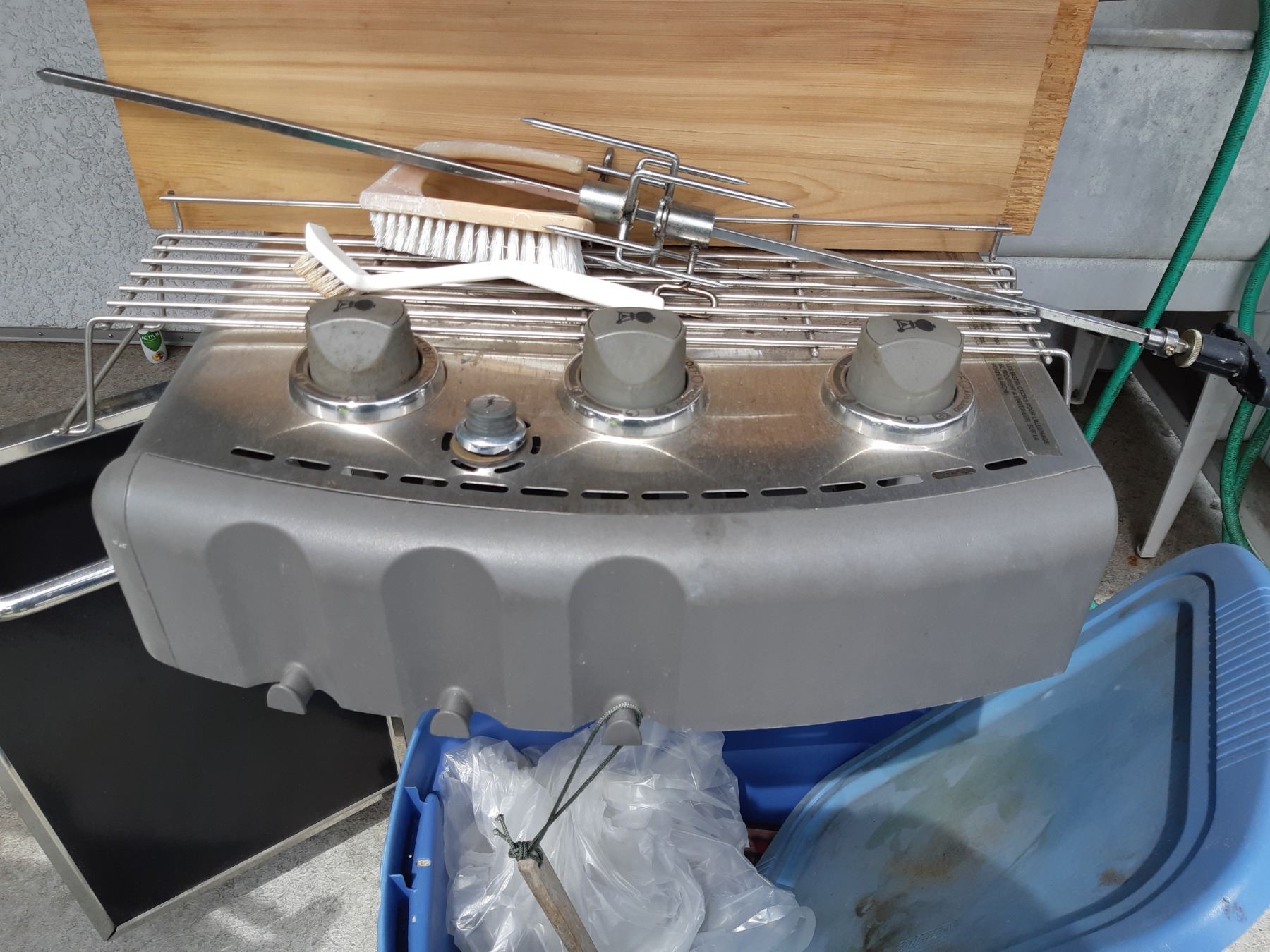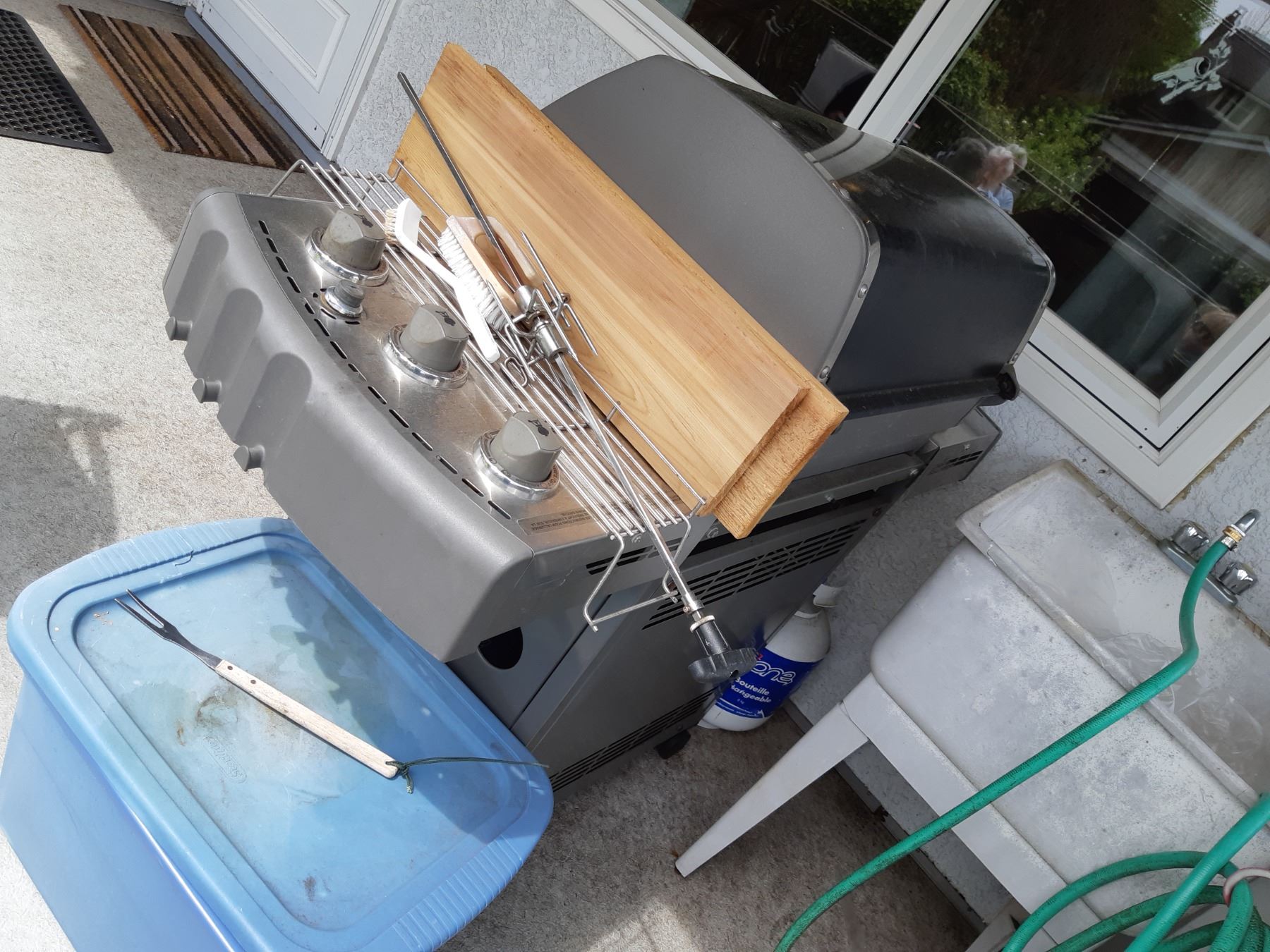 Weber propane barbecue 2 side tables w an assortment of grilling utensils untested. Bring help to remove. Pick up at 11 am.