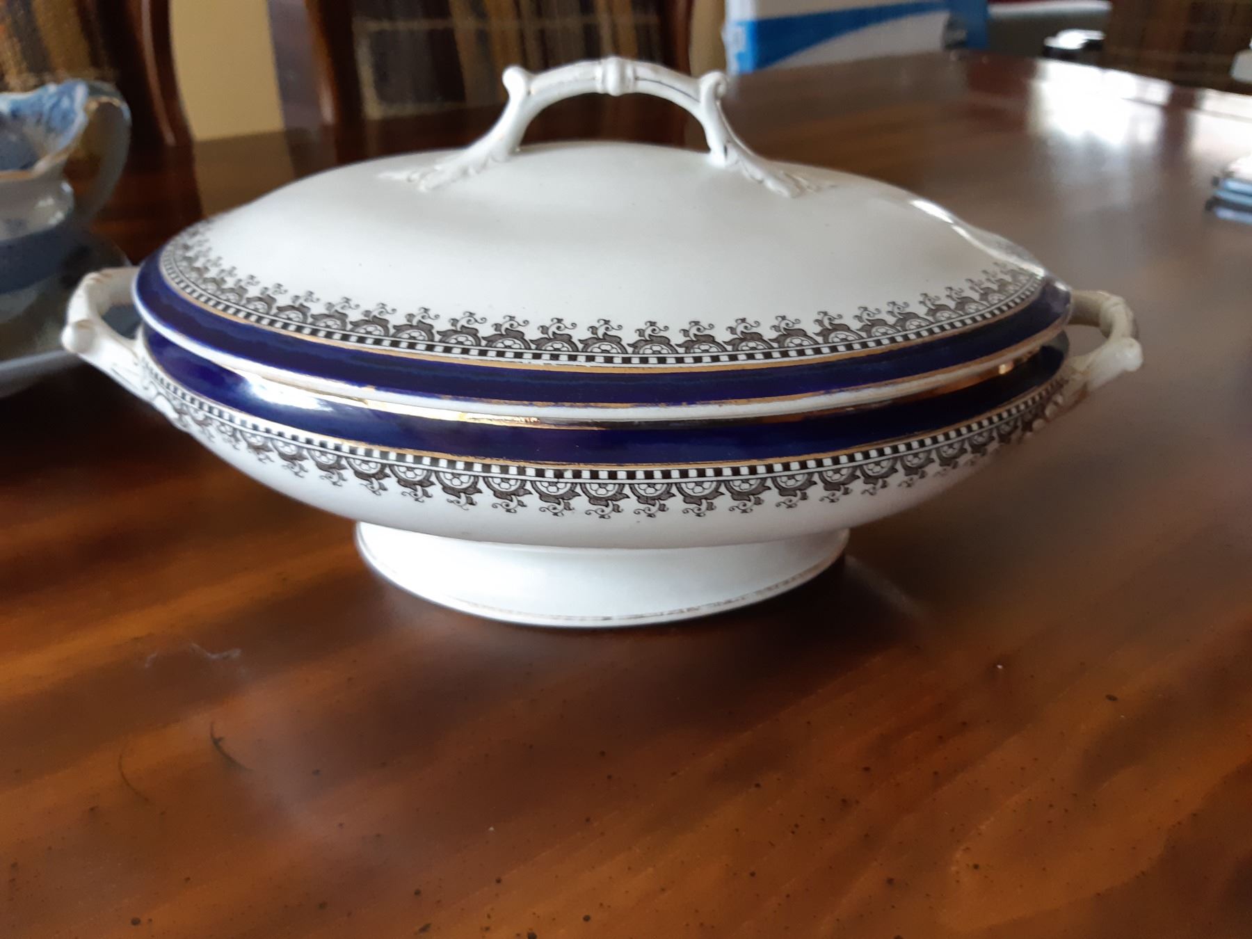 Lidded serving dish with tray by Weir of England, 12". Note small chip on tray. Oval lidded china dish with 2 handles. Bring packing supplies and pickup at 9 am.