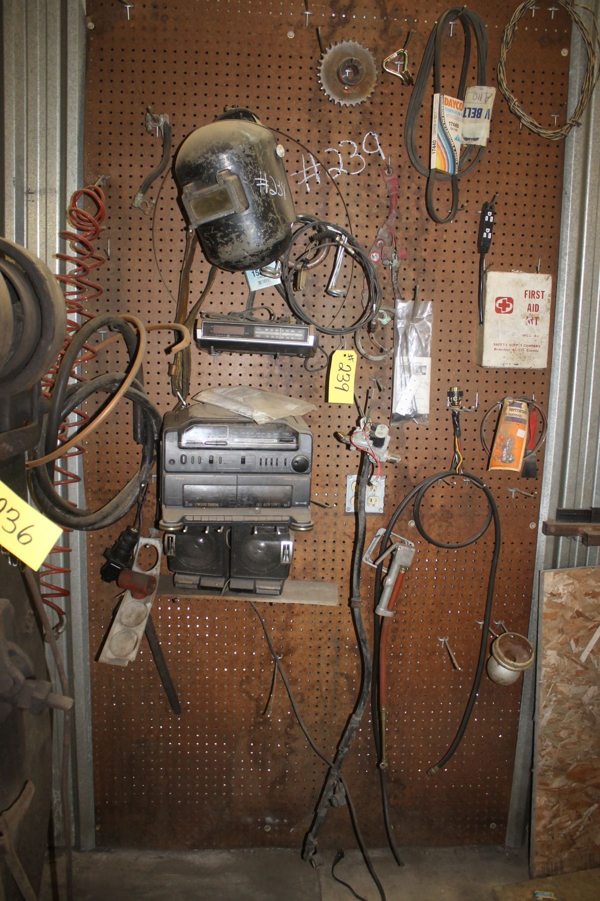 Welding shield, belts, old cd player, first aid kit, battery cables, air hose and more.